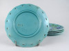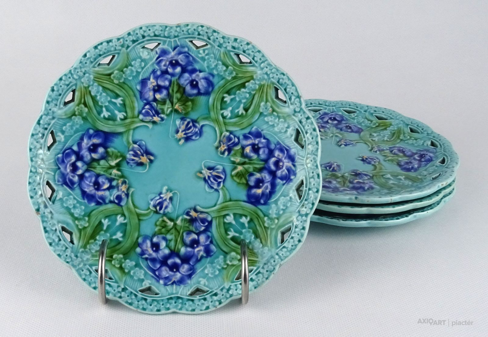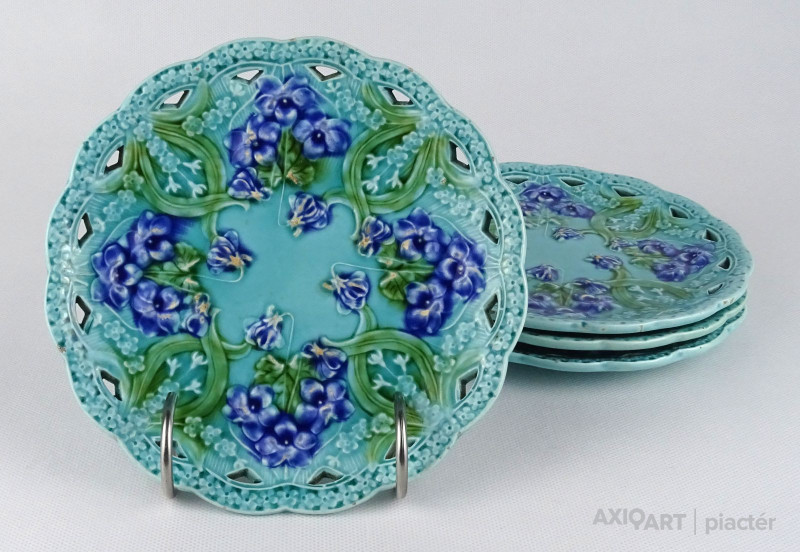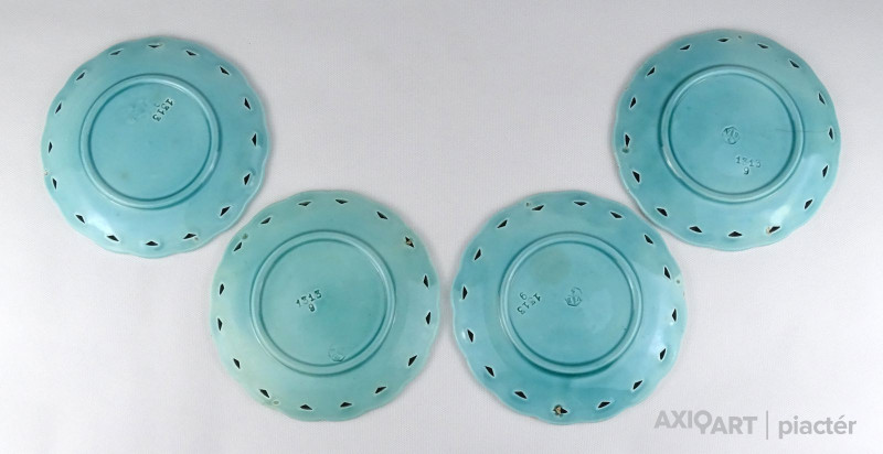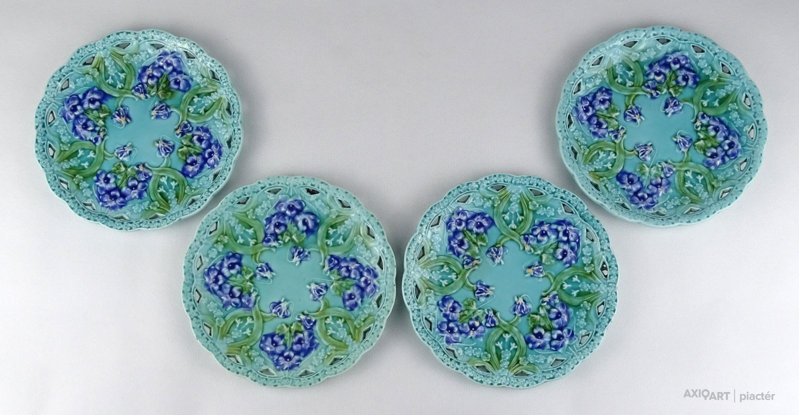 Antik jelzett majolika süteményes tányér készlet. Élénk türkiz színű, gazdagon díszített darabok. Kisebb kopások előfordulnak rajtuk, két darabon hajszálrepedés található.