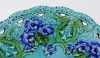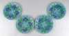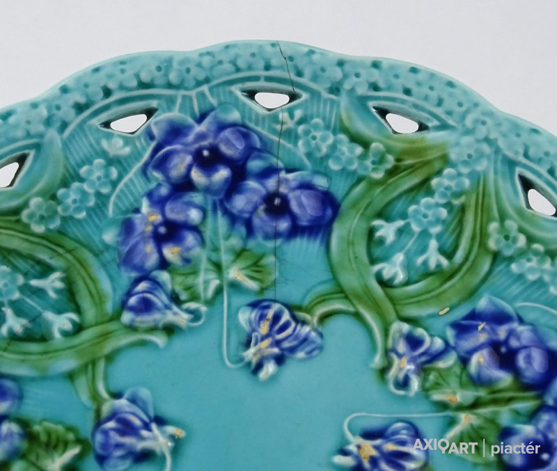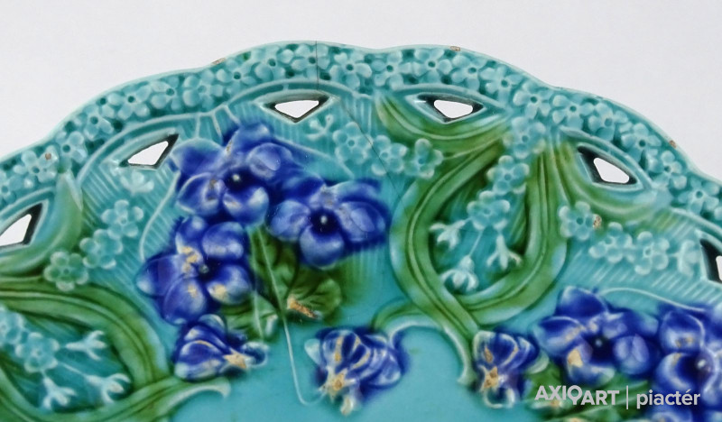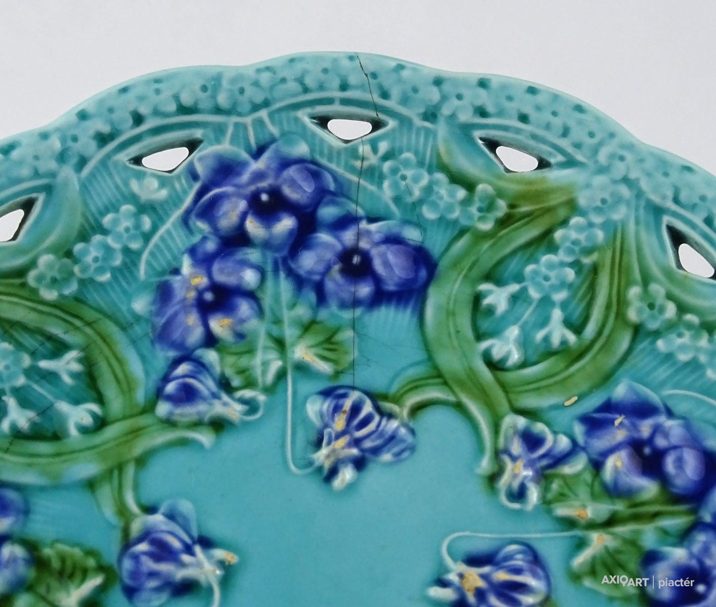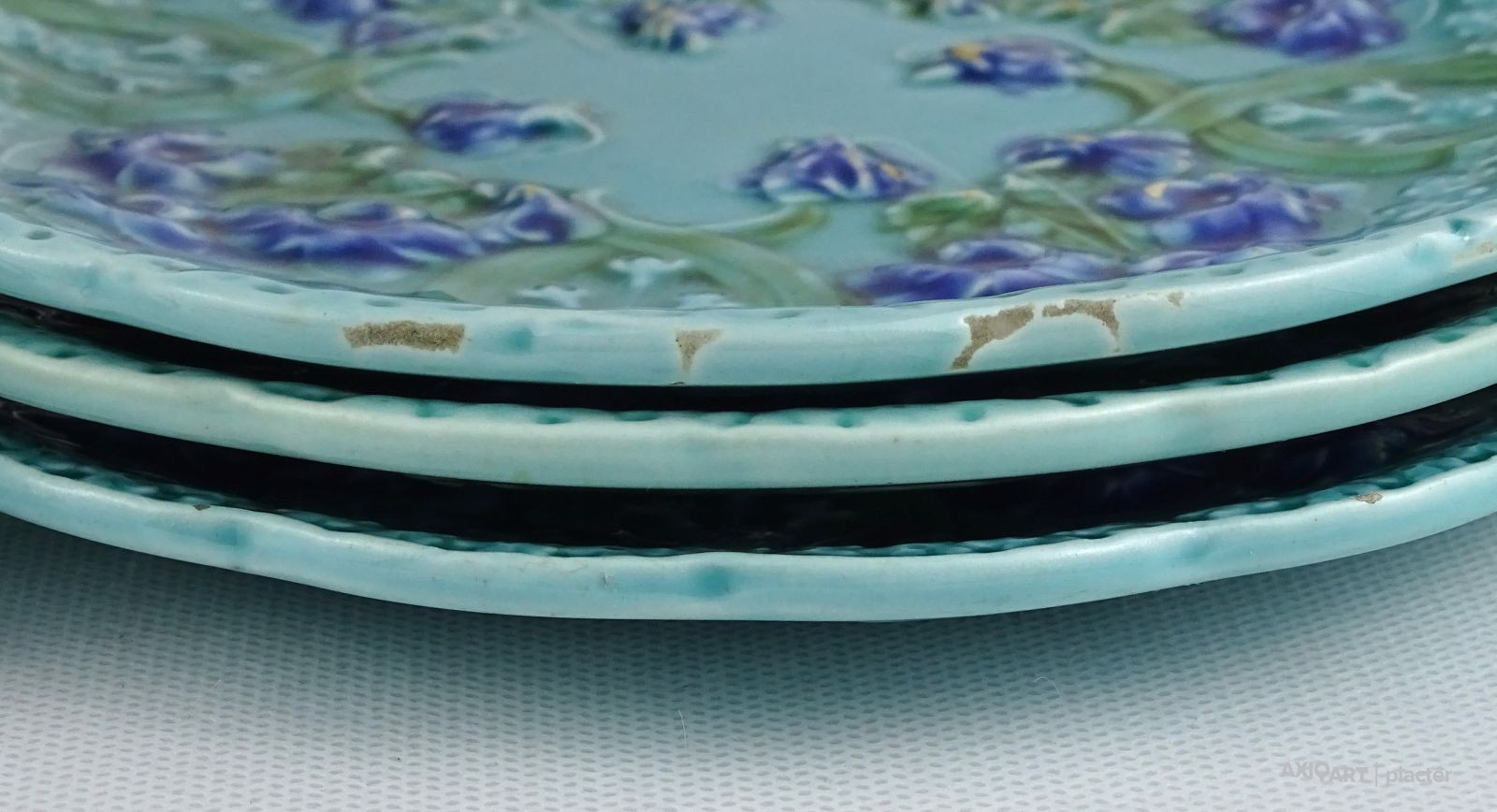Antik jelzett majolika süteményes tányér készlet. Élénk türkiz színű, gazdagon díszített darabok. Kisebb kopások előfordulnak rajtuk, két darabon hajszálrepedés található.