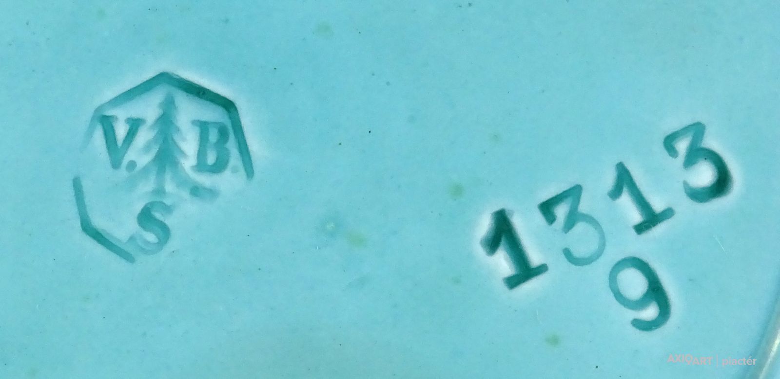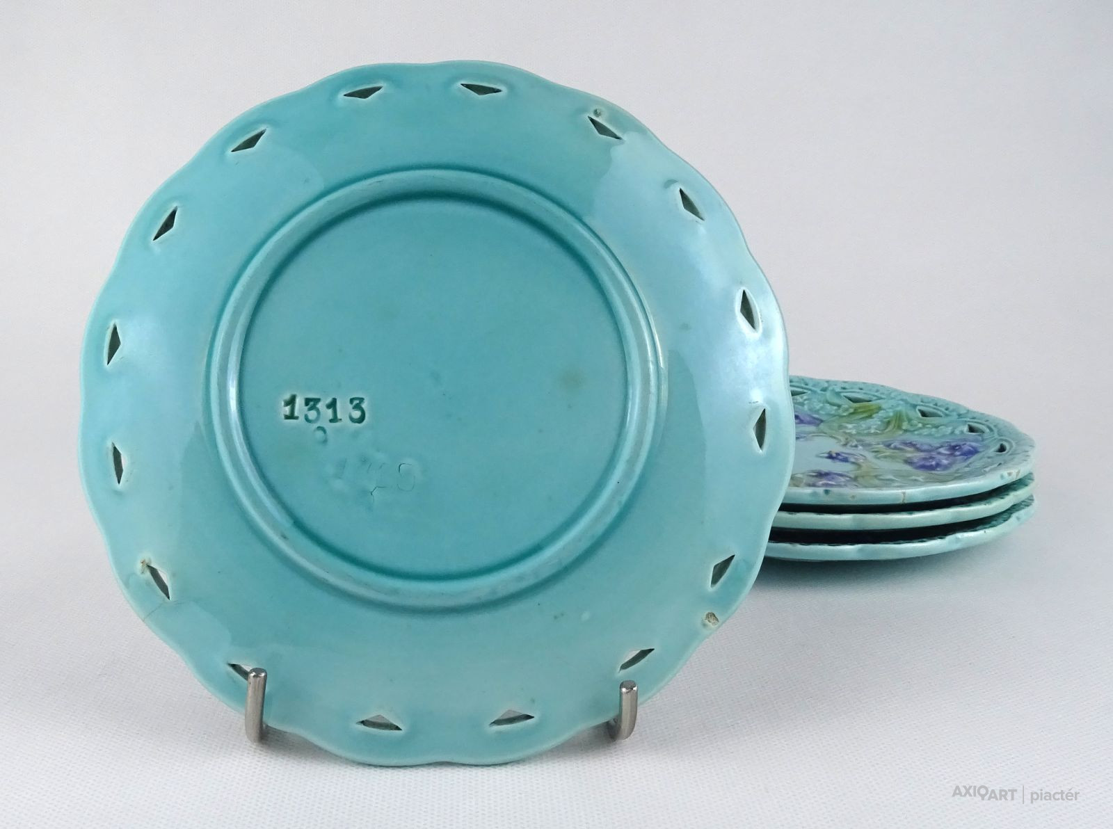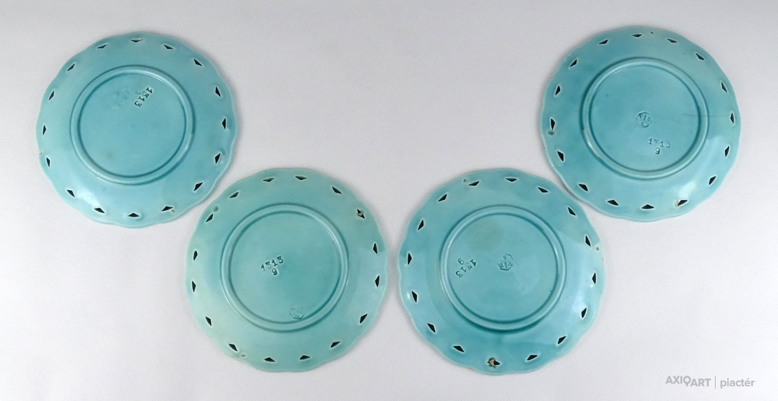 [1Q882/Z047] Antik jelzett majolika süteményes tányér készlet. Élénk türkiz színű, gazdagon díszített darabok. Kisebb kopások előfordulnak rajtuk, két darabon hajszálrepedés található. Alján mélynyomott fenyőfás jelzés: V.B.S. Formaszám: 1313 9 Szélesség: 17 cm Súly: 0.73 kg