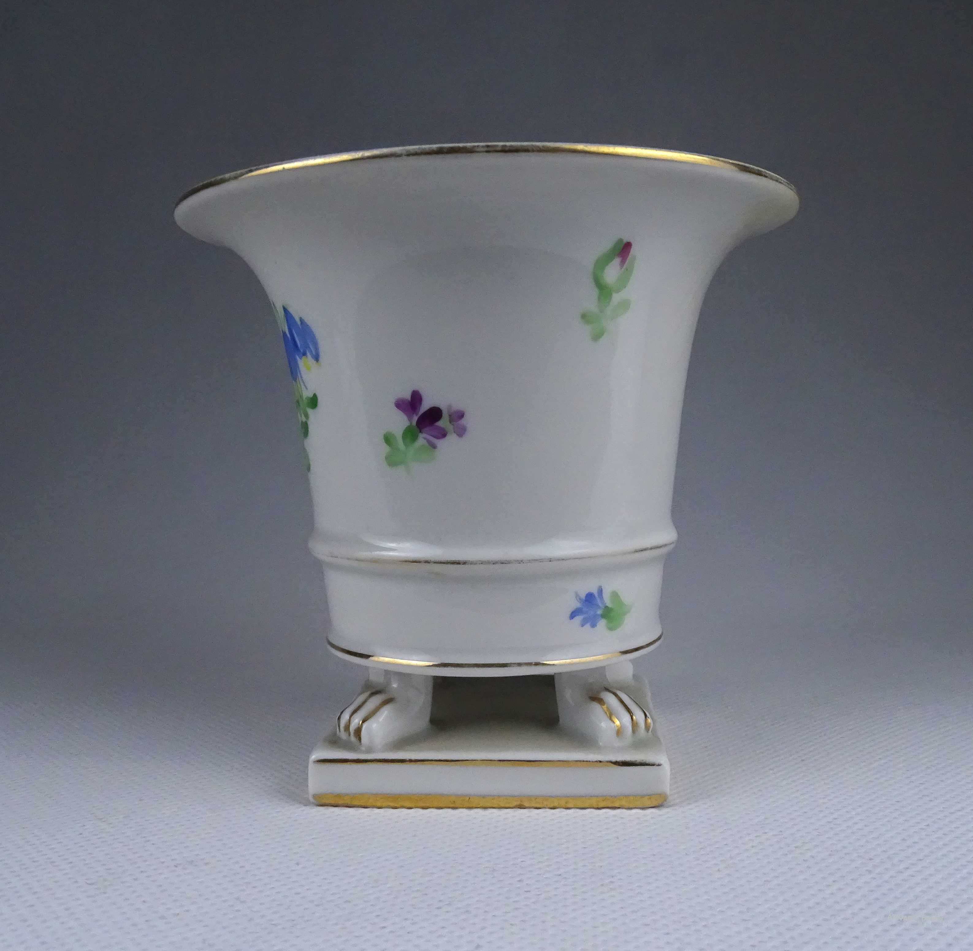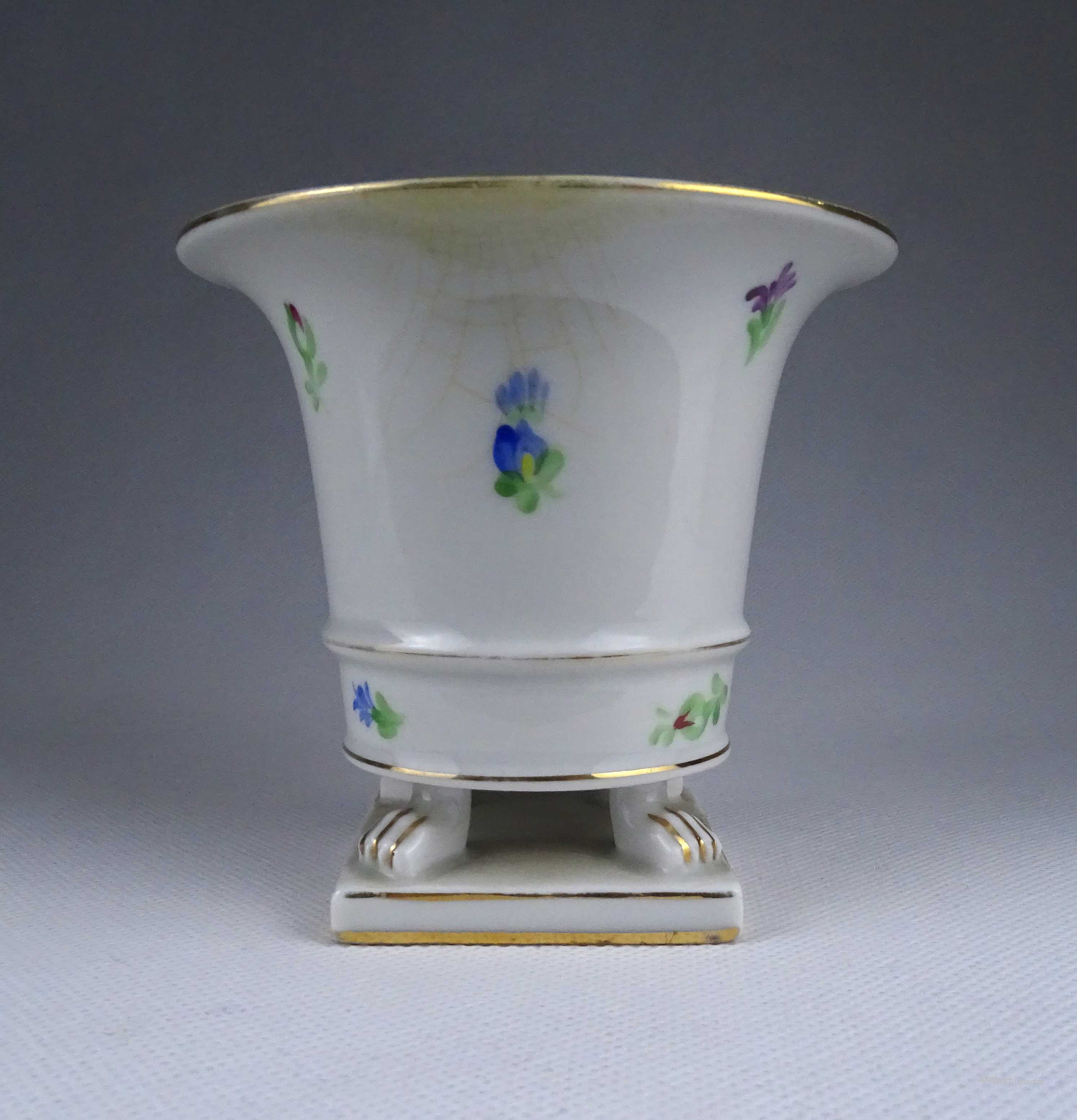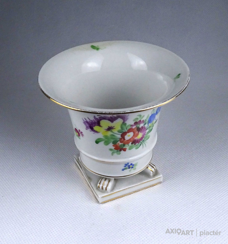 Antik, szép állapotú, kézi festésű virágmintás, a peremén aranyozott, oroszlánlábakon álló, Herendi porcelán kaspó. A peremén felül egy helyen pókhálószerűen szétfutó, elszíneződött mázrepedések láthatóak.
