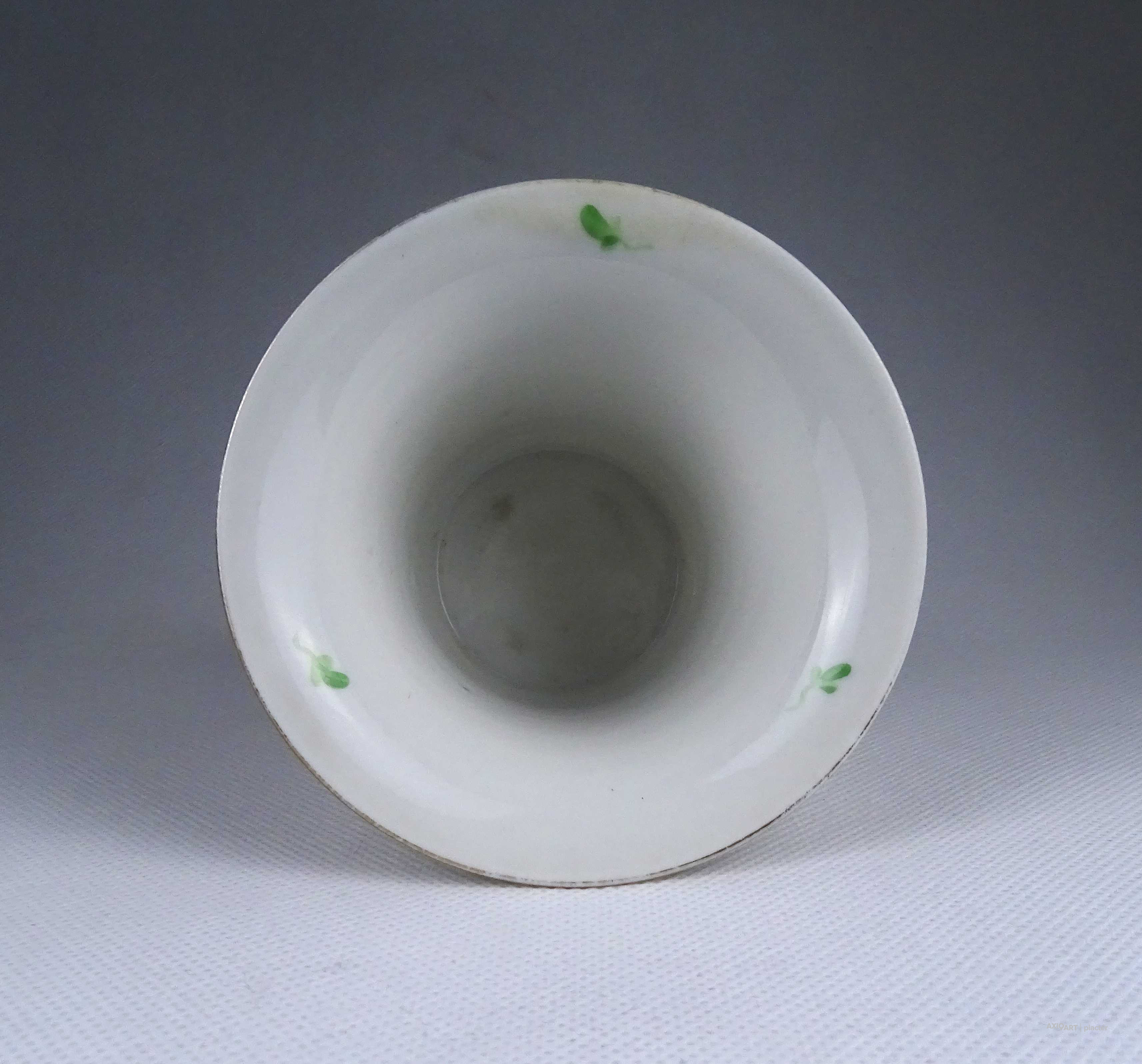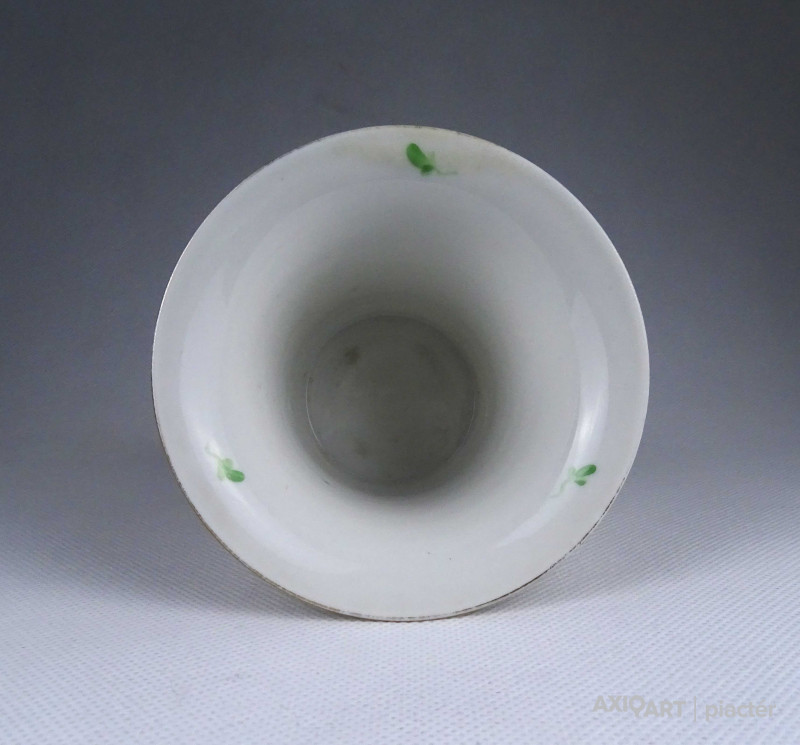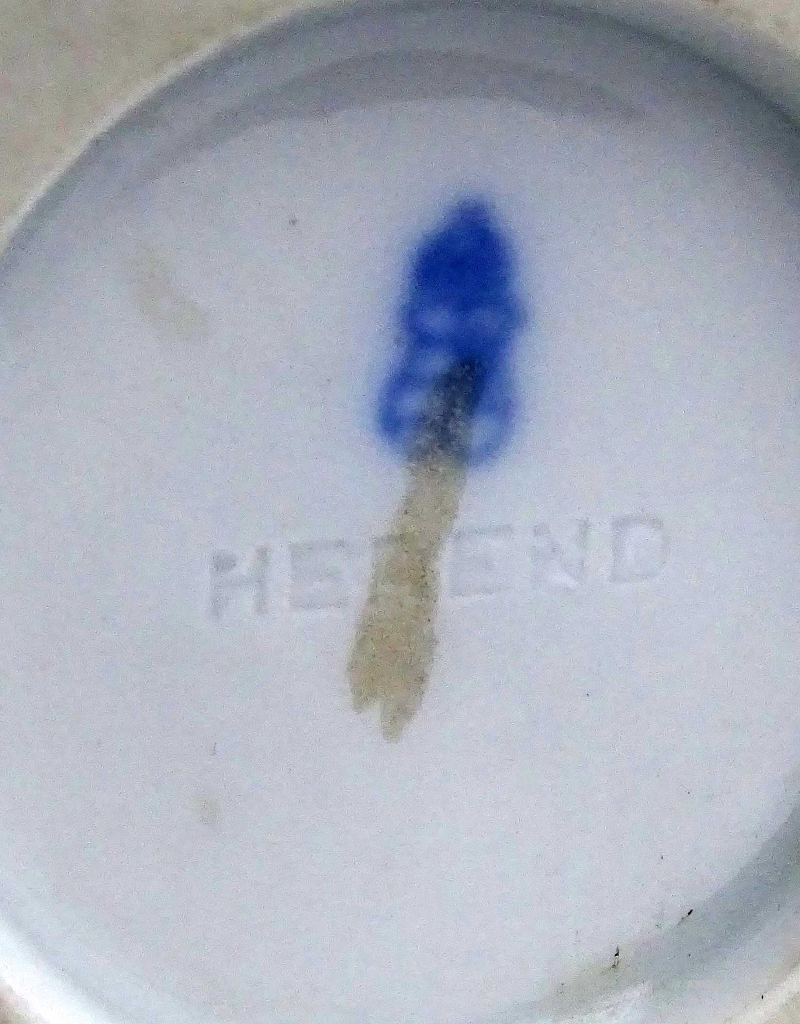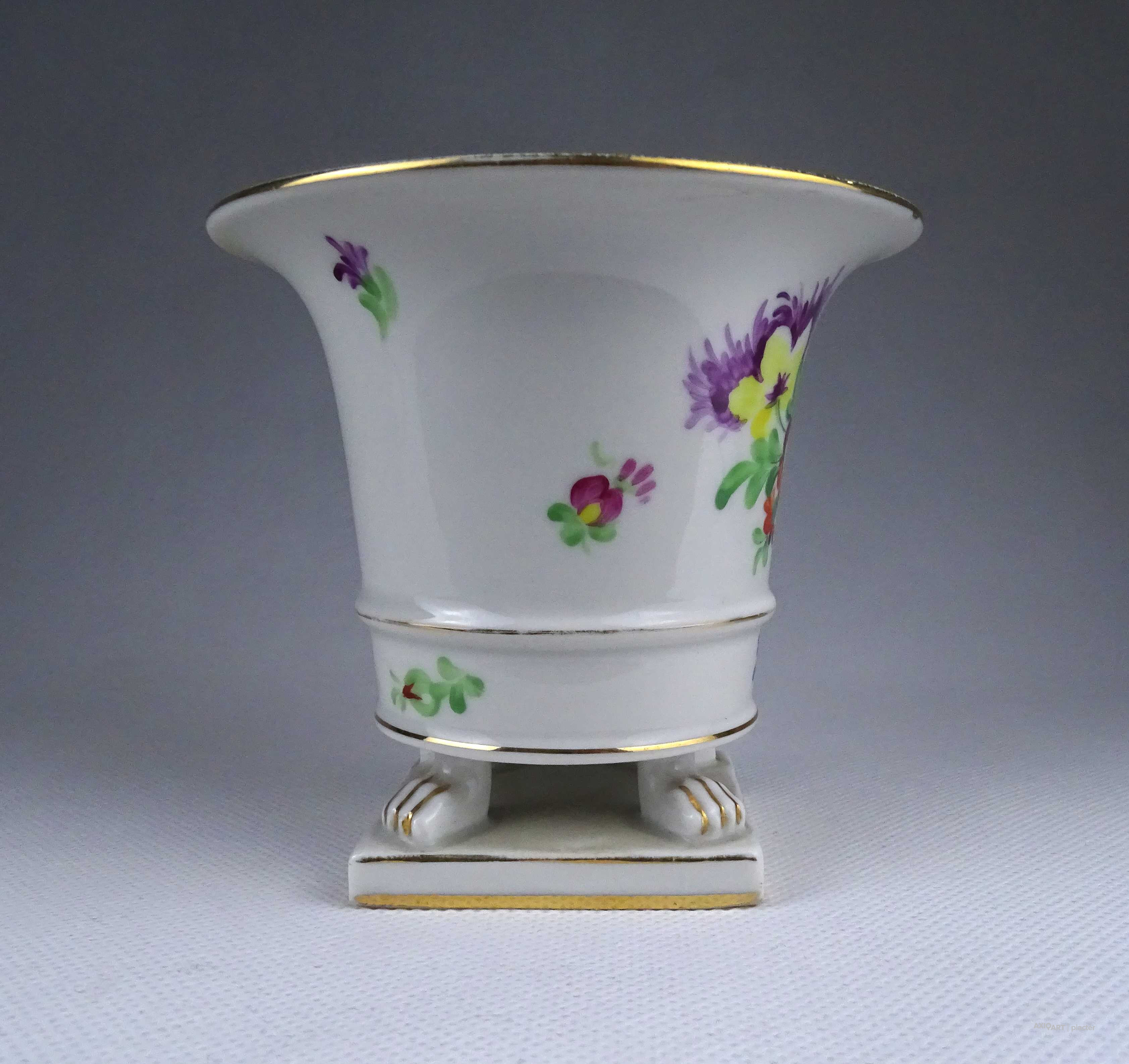 Antik, szép állapotú, kézi festésű virágmintás, a peremén aranyozott, oroszlánlábakon álló, Herendi porcelán kaspó. A peremén felül egy helyen pókhálószerűen szétfutó, elszíneződött mázrepedések láthatóak.