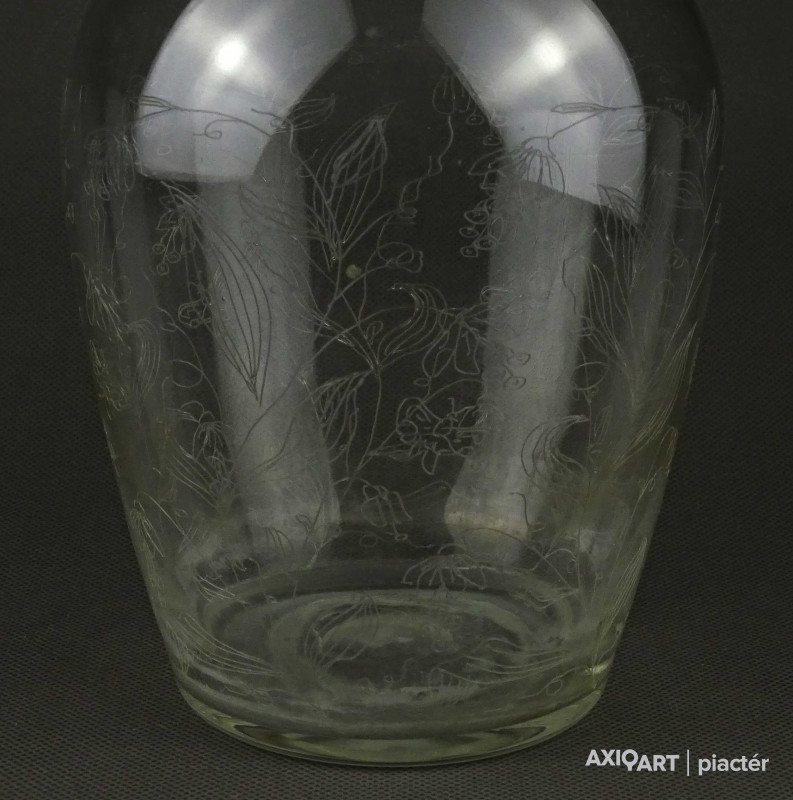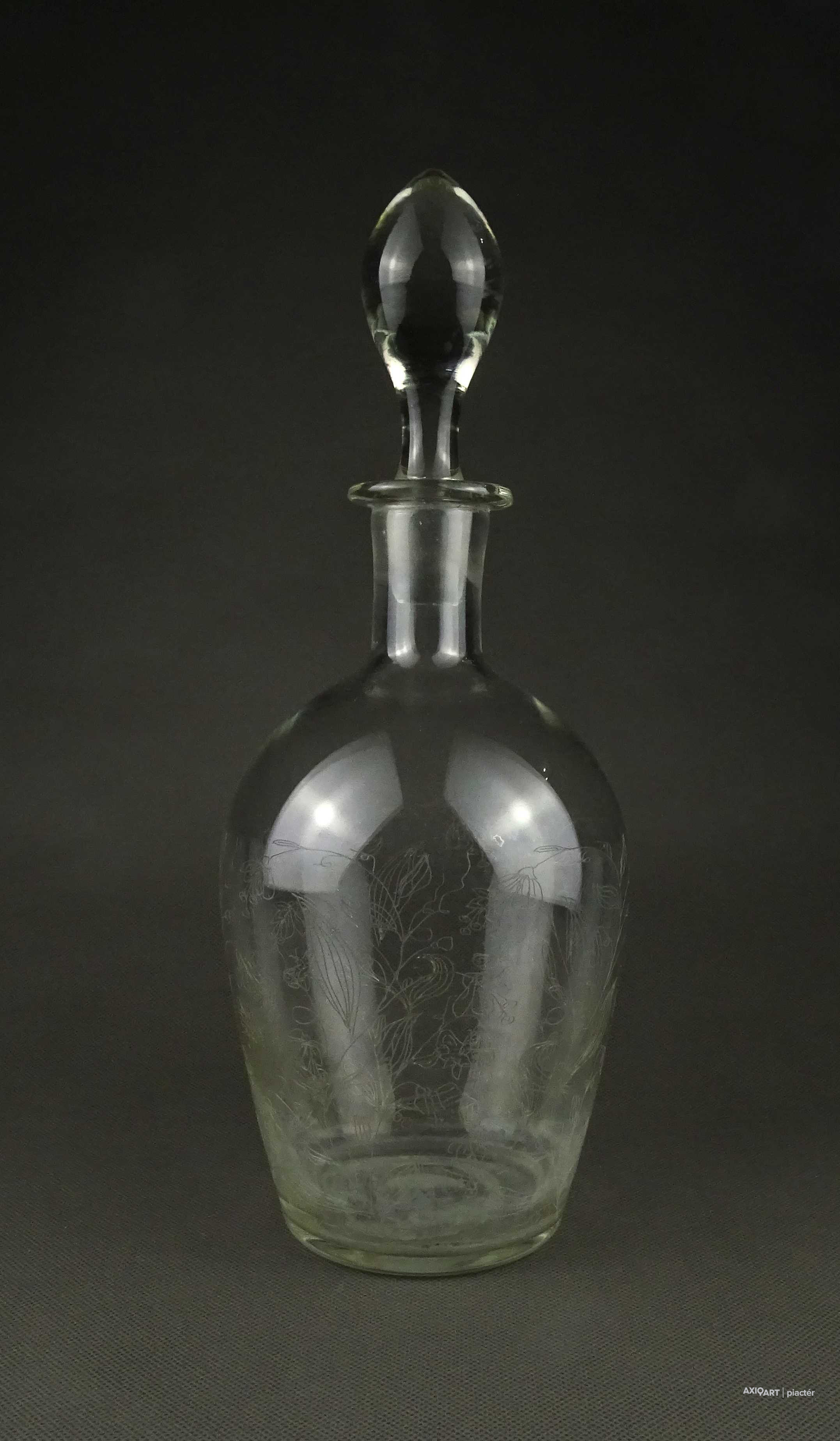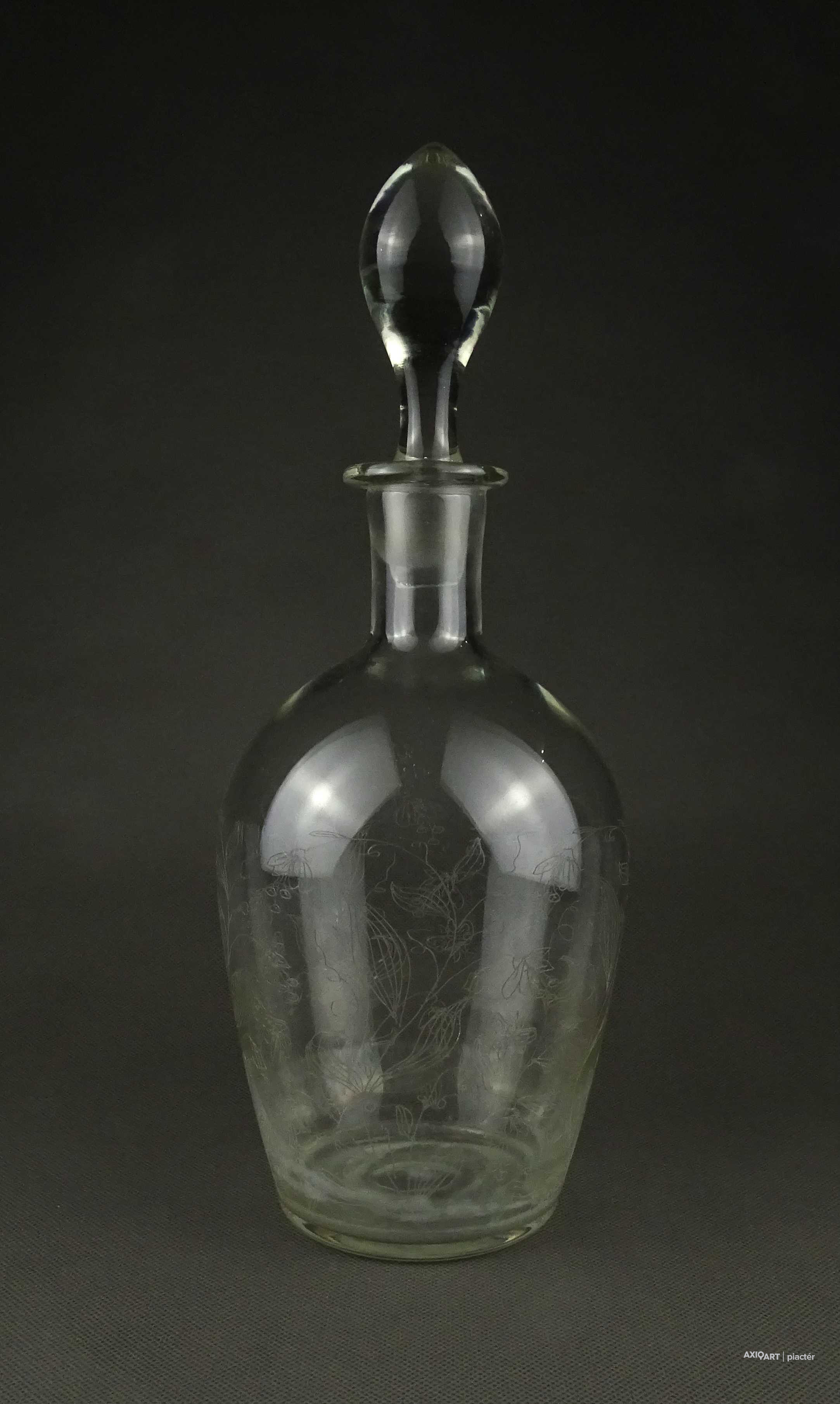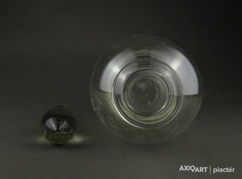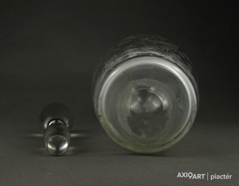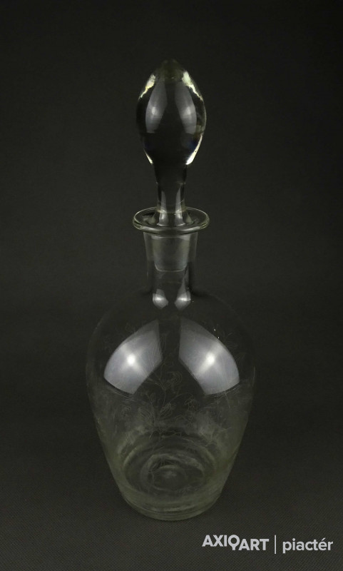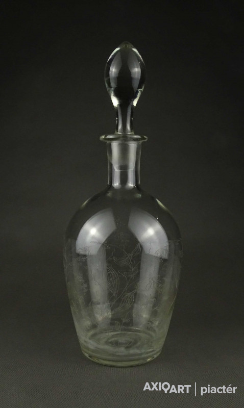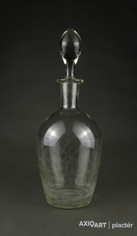 Hibátlan állapotú, régi maratott fújt üveg kiöntő, nagyméretű dugóval. Oldalán körben gazdag maratott díszítés virágokkal és pillangóval.