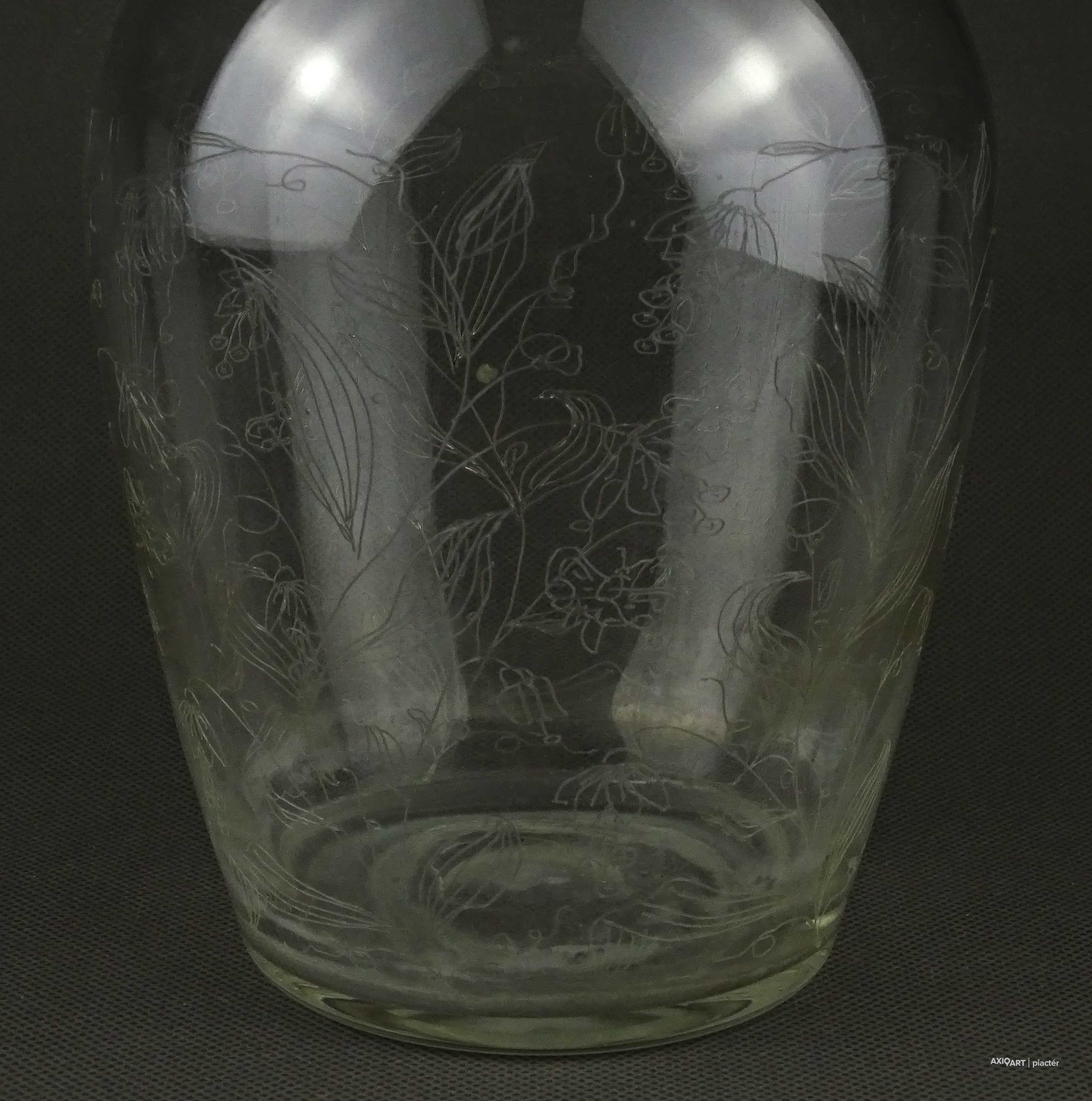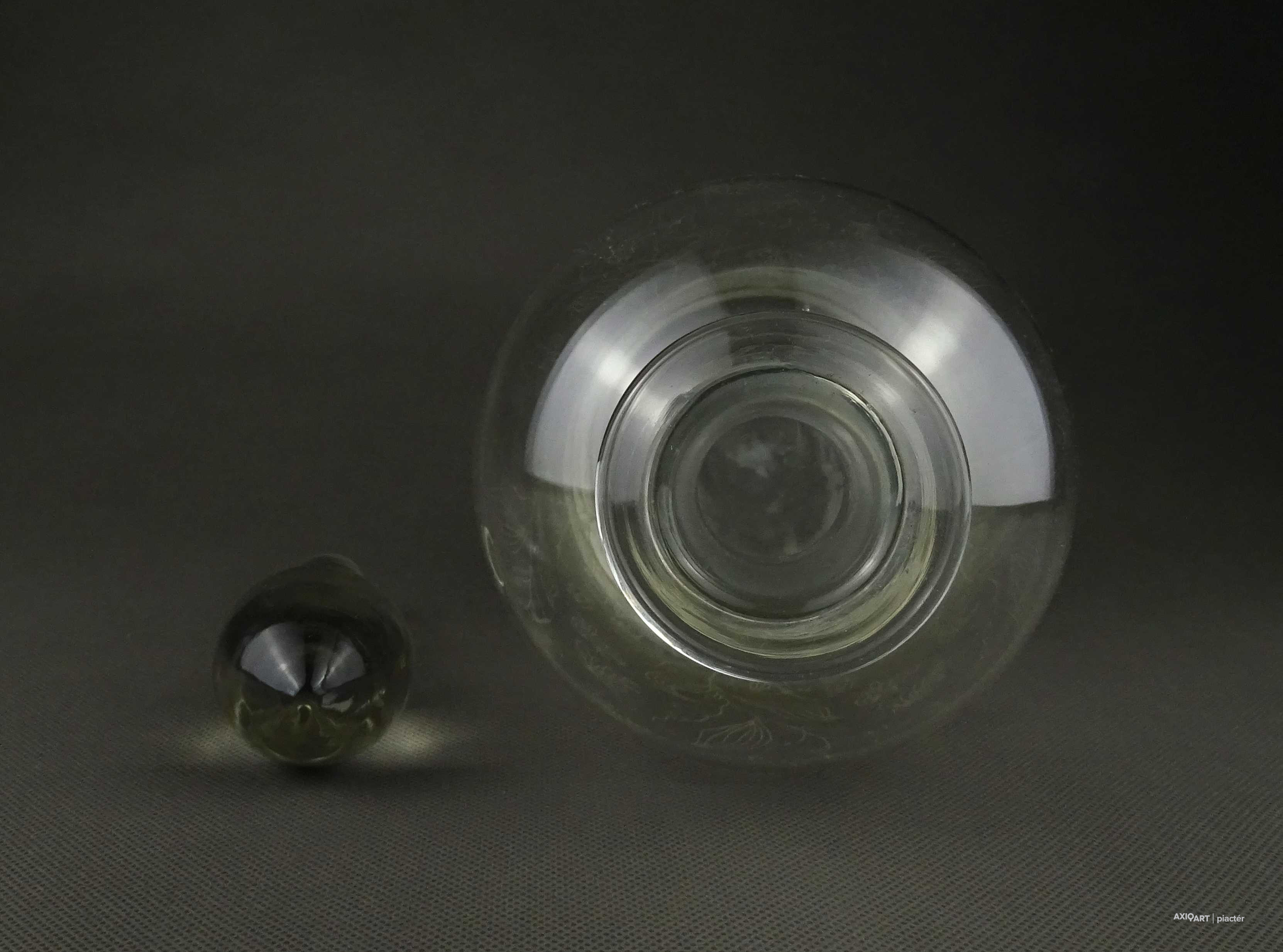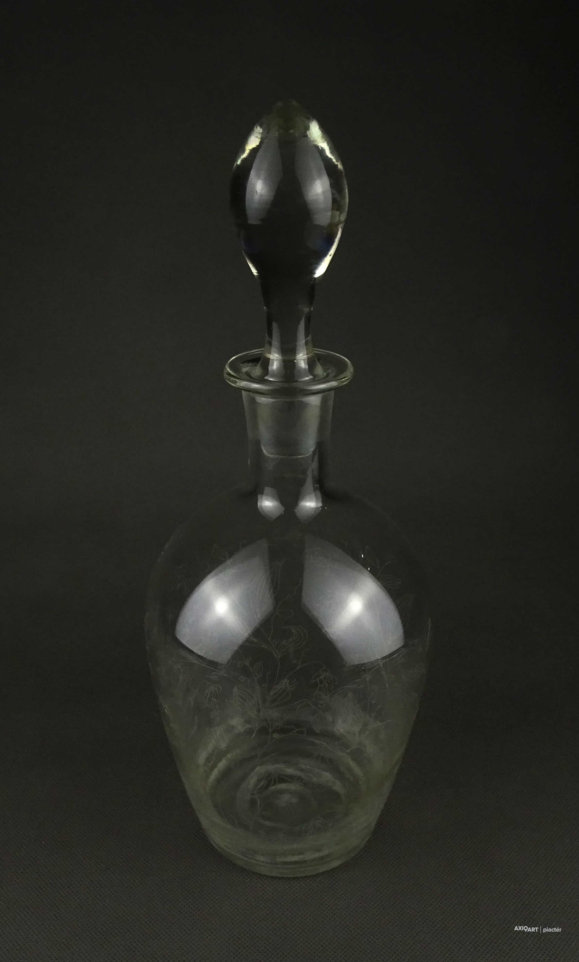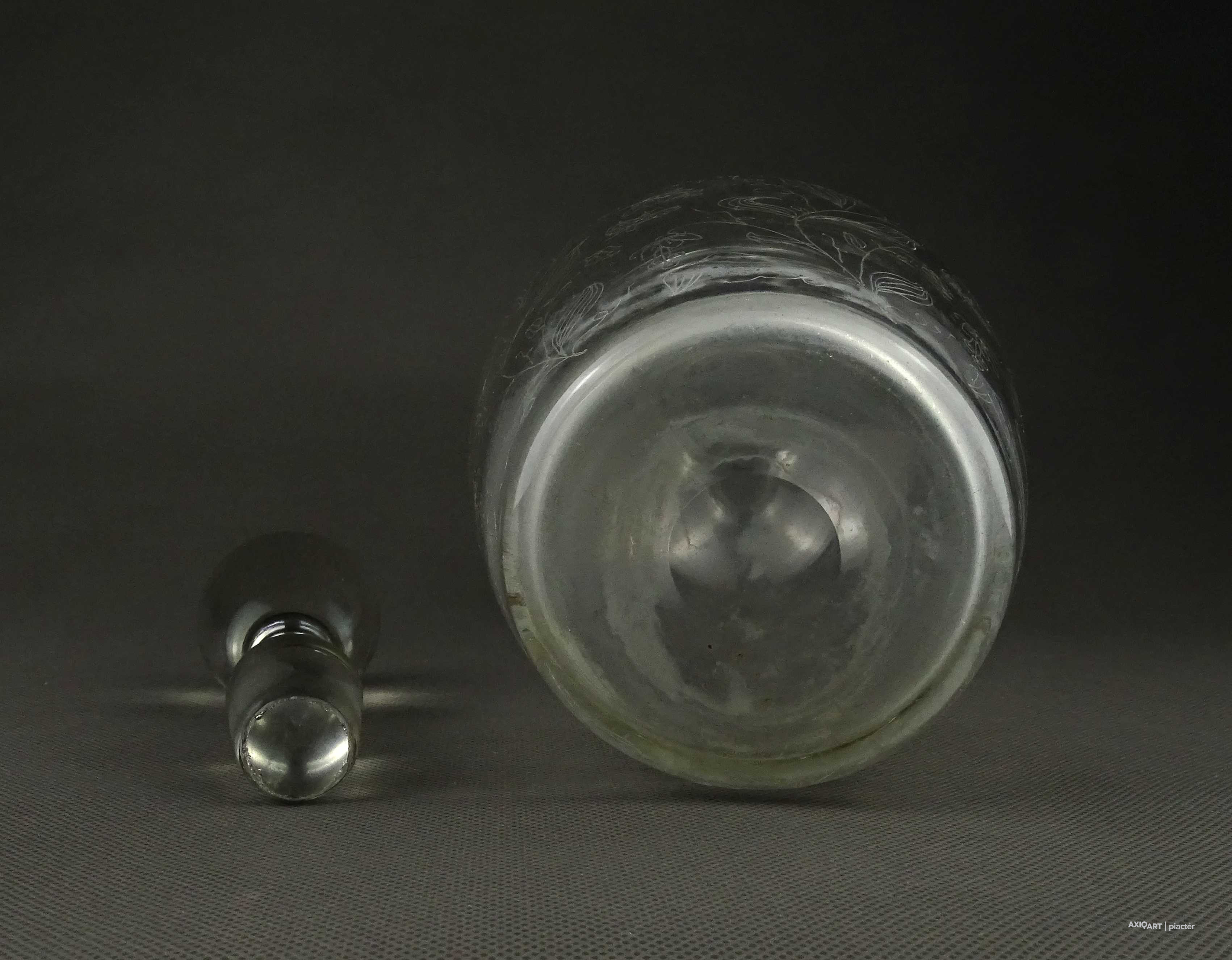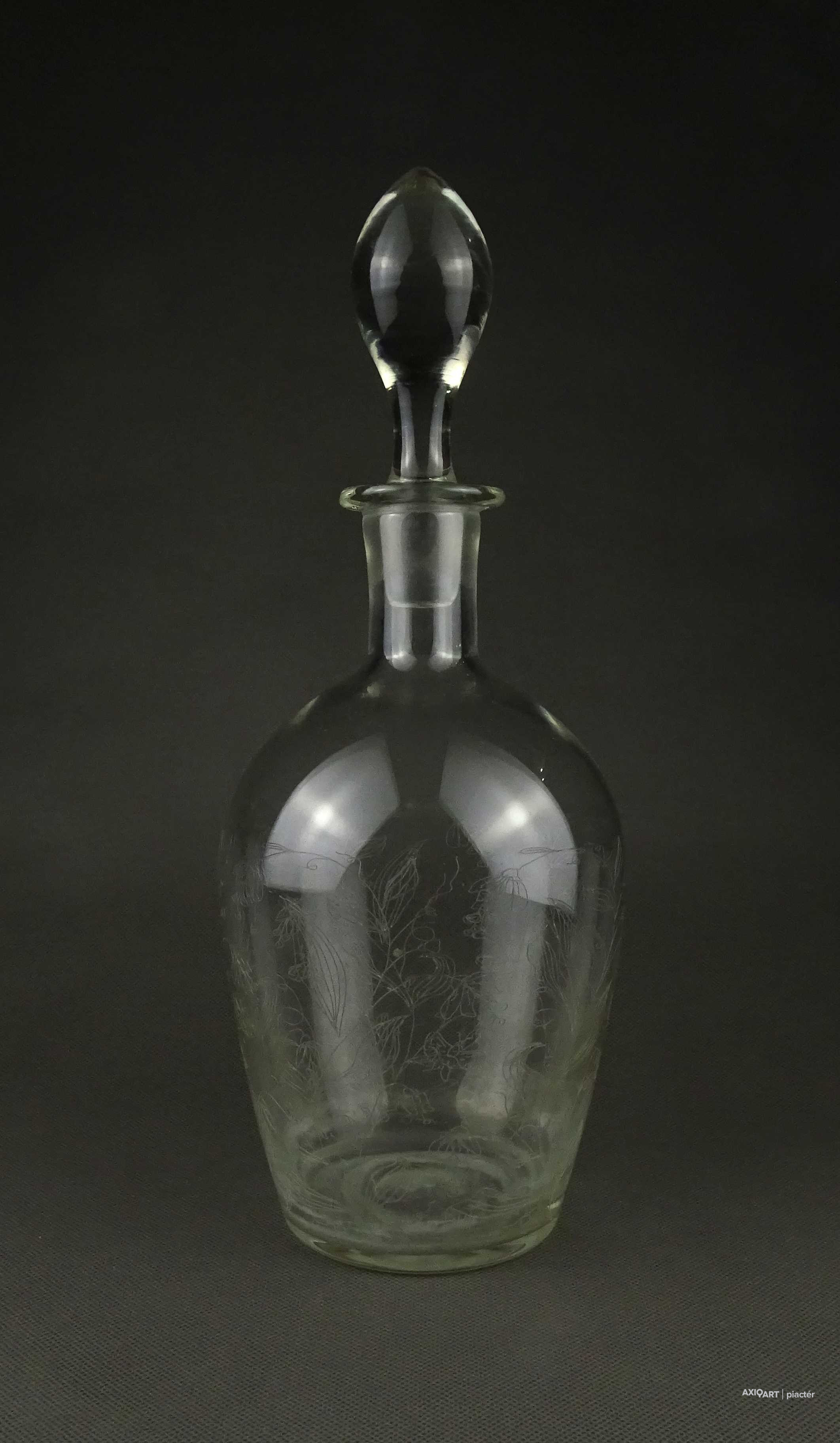 Hibátlan állapotú, régi maratott fújt üveg kiöntő, nagyméretű dugóval. Oldalán körben gazdag maratott díszítés virágokkal és pillangóval.