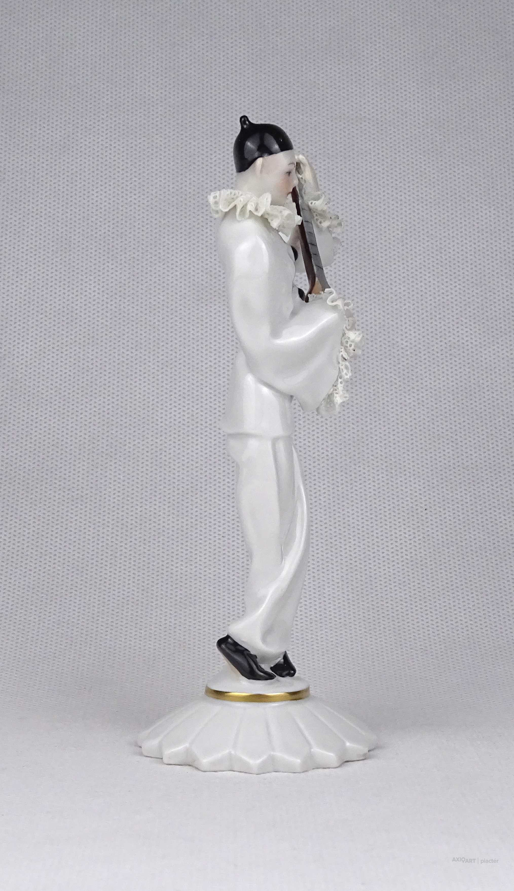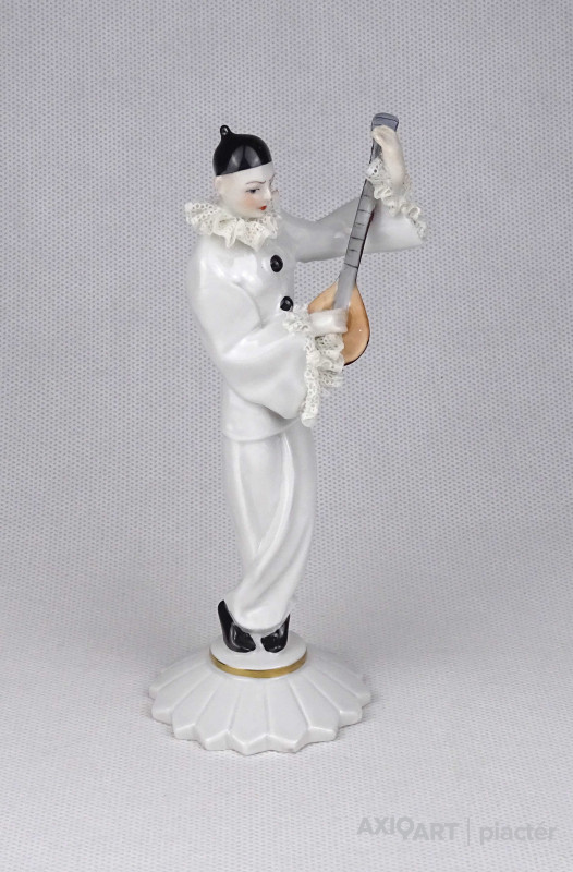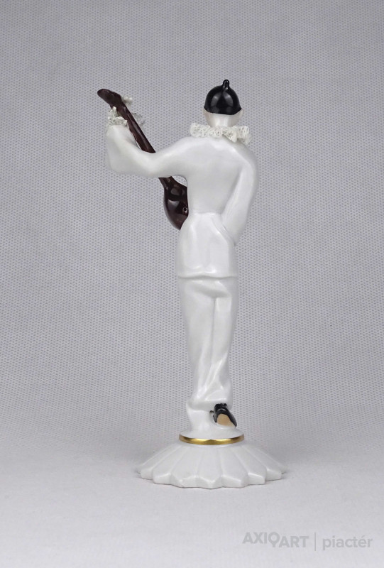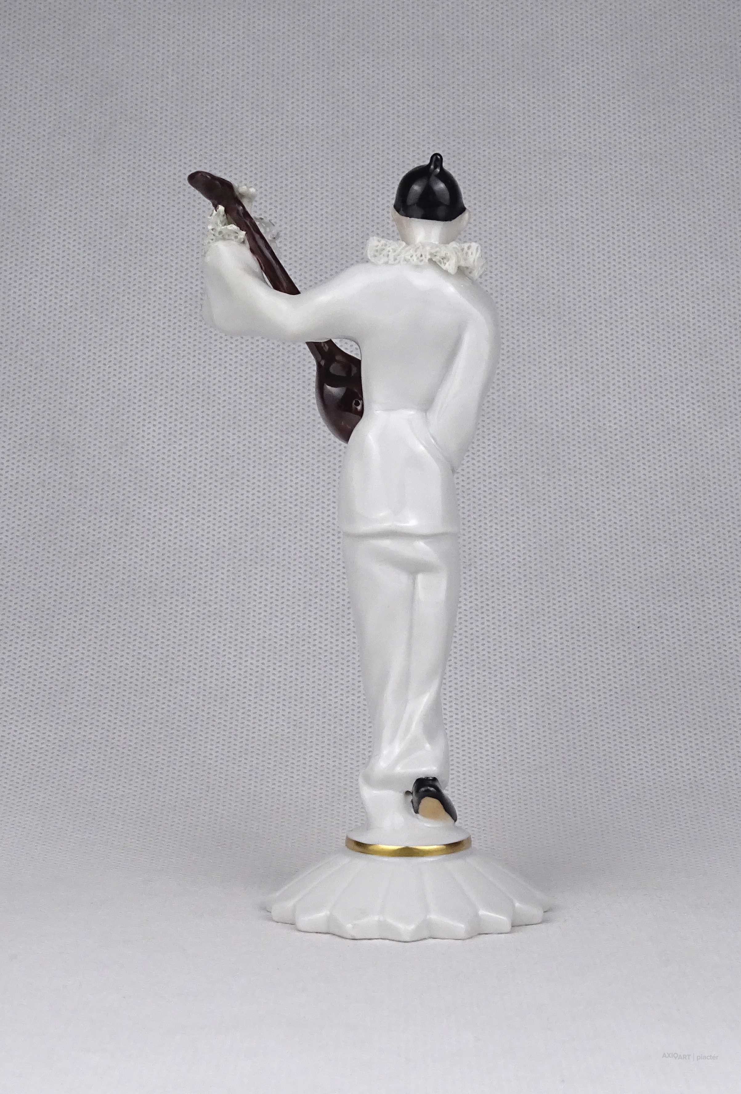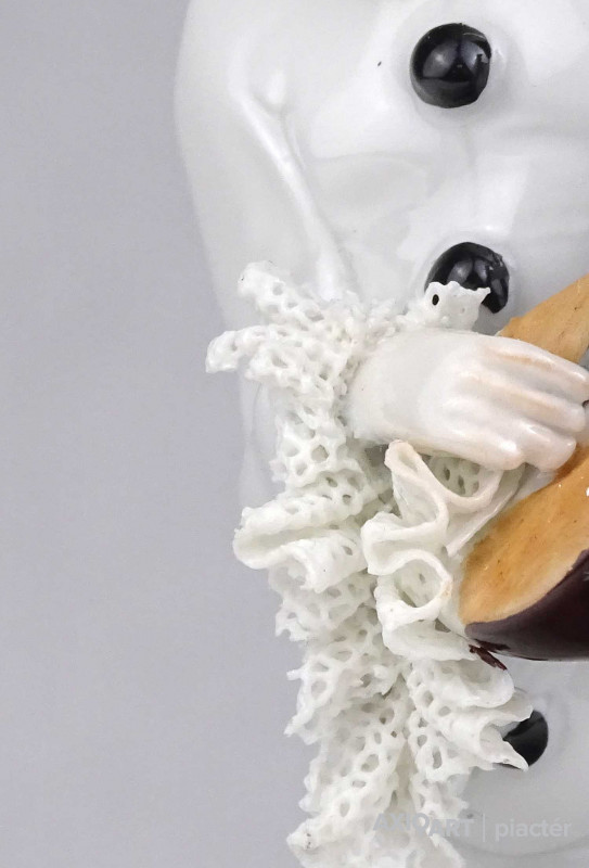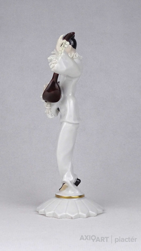 Antik, hibátlan állapotú, kézi festéssel díszített lanton játszó bohóc porcelán figura. A lant vége illetve a figura bal kézfeje restaurátor által szakszerűen javított.