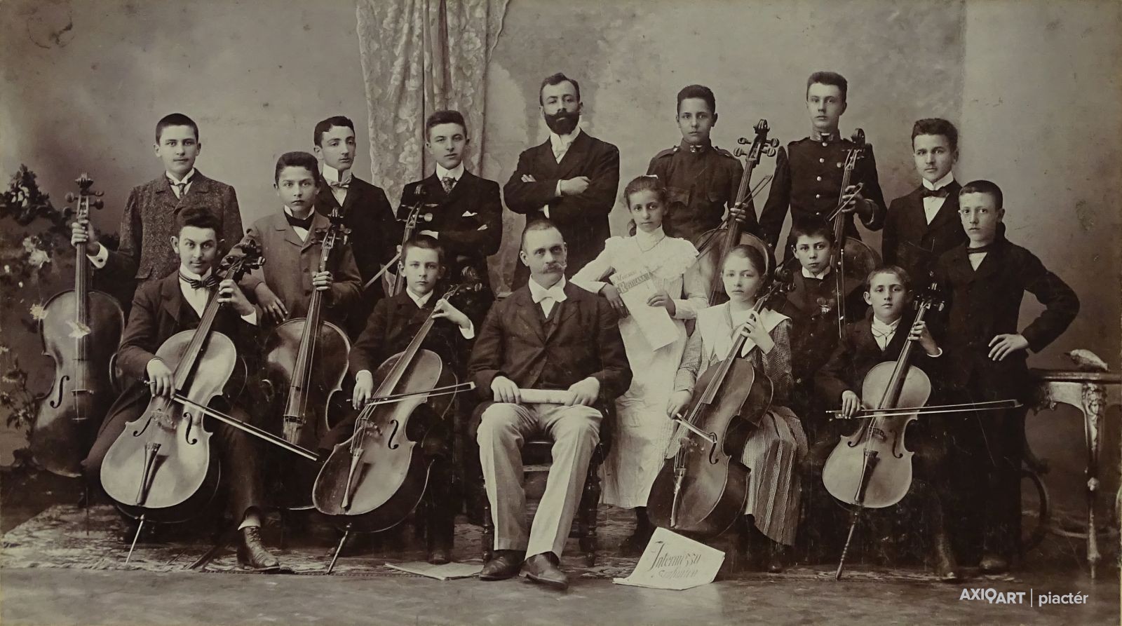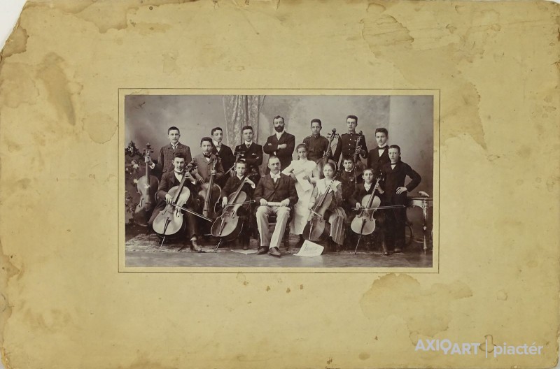 Antik, kartonra ragasztott, fekete-fehér fotográfia, melyen egy 16 fős zenekar látható. A kép a század forduló környékén készülhetett.