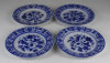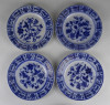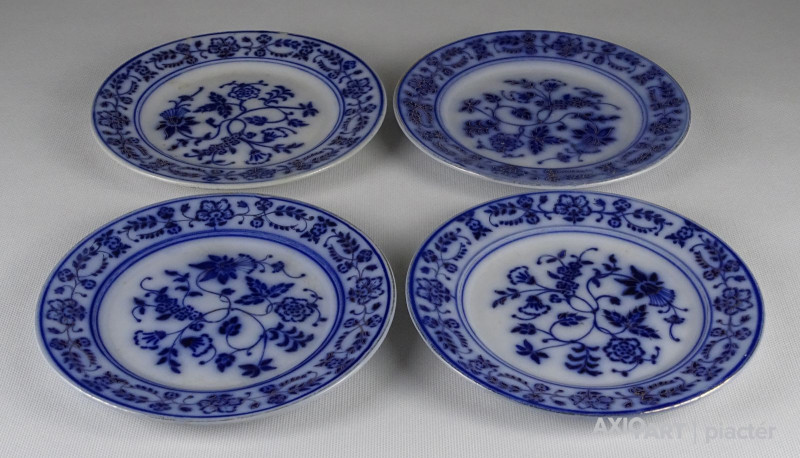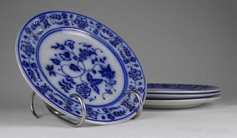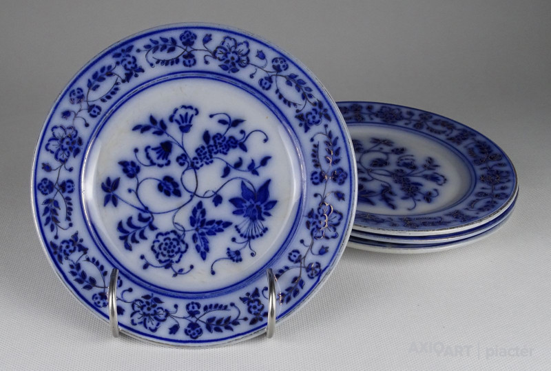Antik, hibátlan állapotú gazdagon aranyozott, kobaltkék virágokkal díszített porcelán tányér készlet, süteményes tányérkészlet, négy darab.