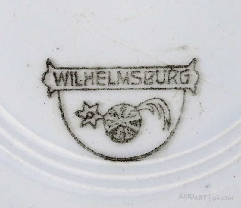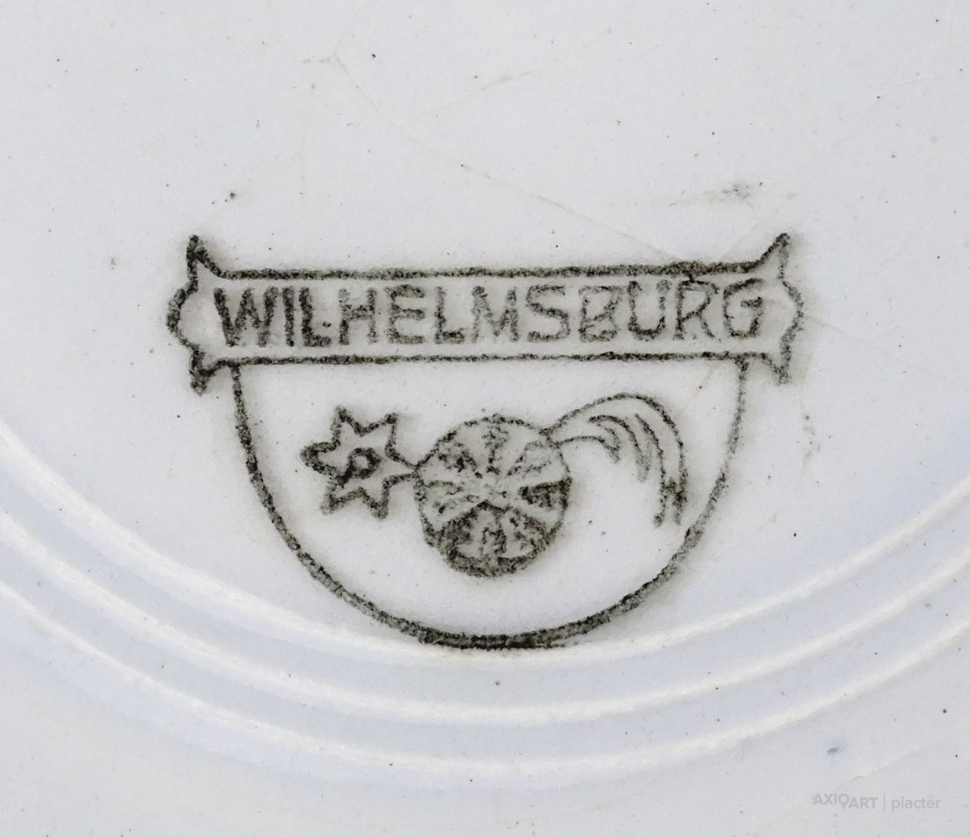 [1R208/X298] Antik, hibátlan állapotú kakasos, jelzett porcelán falitányér, dísztányér az 1900-as évek első feléből. Akasztási lehetőséggel rendelkezik. Alján jelzés: WILHELMSBURG Szélesség: 23 cm Súly: 0.41 kg