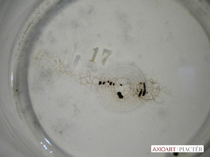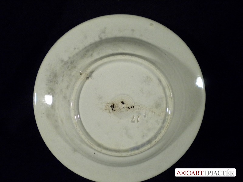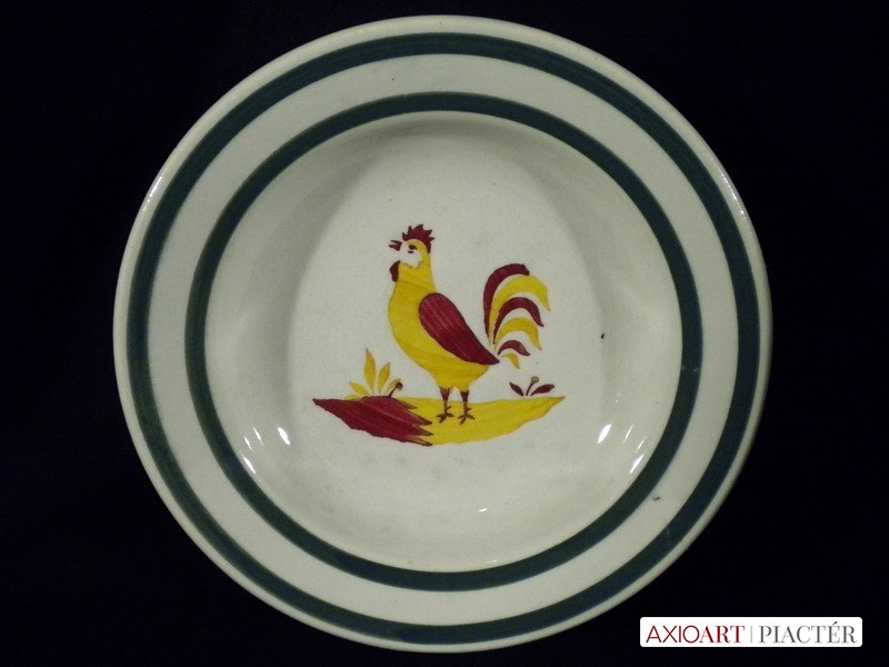 [R191/UZ-N] Állapot: Ép, hibátlan Az 1900-as évek első feléből származik ez a zöld csíkos, kakasos hibátlan kerámia falitányér. Alján mélynyomású körpecsétes jeltöredék látható: OPAQUE WILHELMSBURG Szélesség: 20 cm