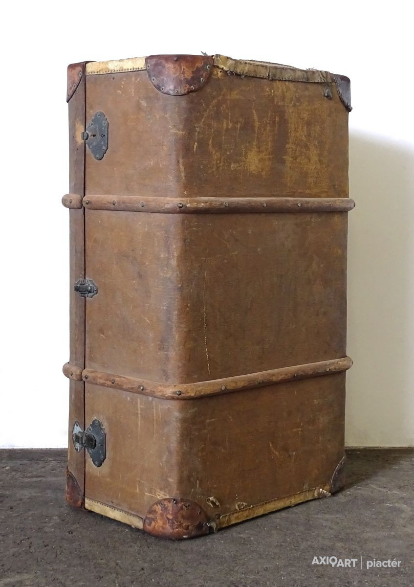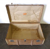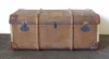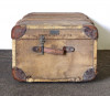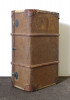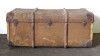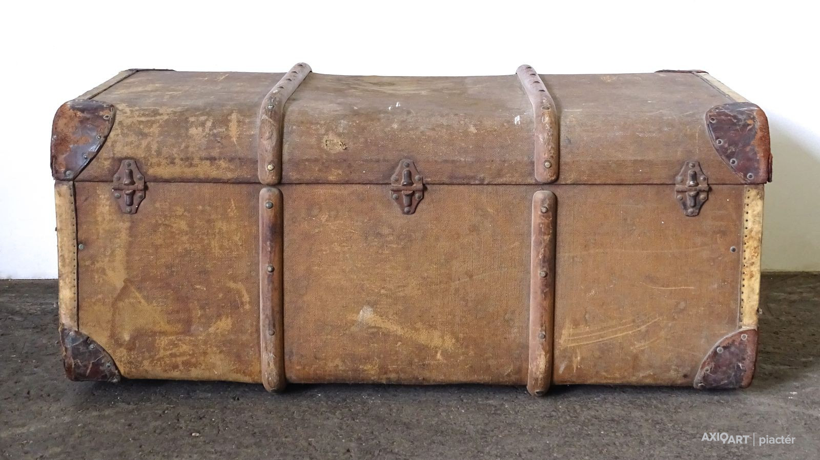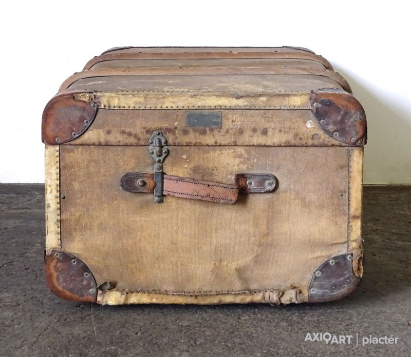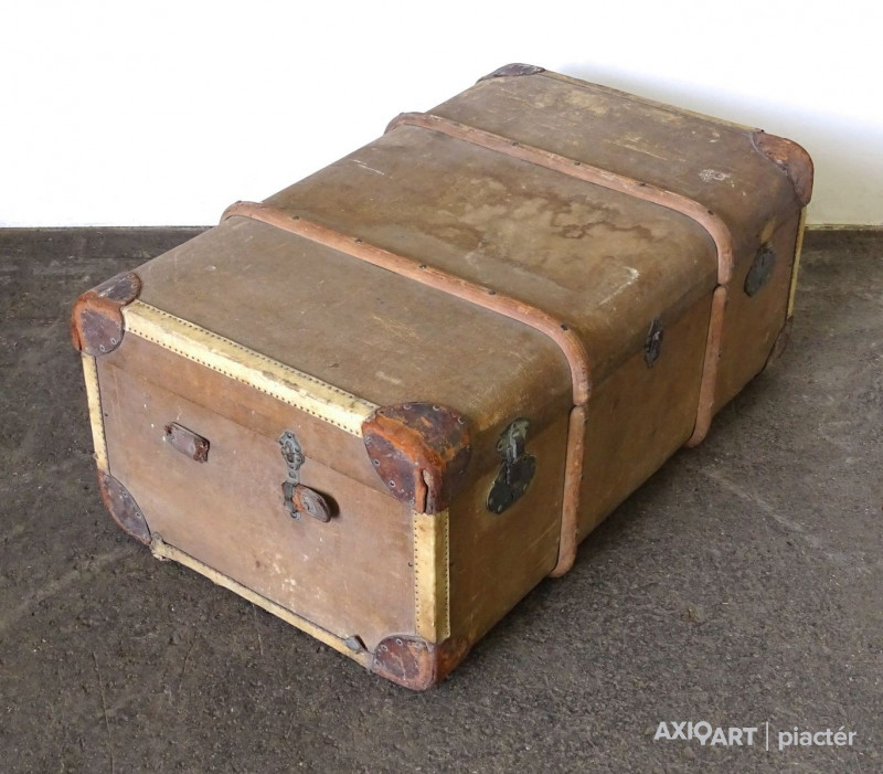Antik monarchia korabeli, fából készült, gőzölt, hajlított keményfa pántokkal erősített, bőr koptatókkal rendelkező, nagyméretű utazó láda, hajóláda, koffer, bőrönd réz veretekkel.