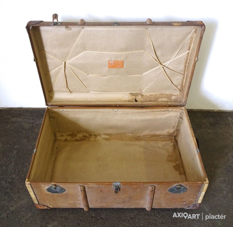 [0Y215/KCS] Antik monarchia korabeli, fából készült, gőzölt, hajlított keményfa pántokkal erősített, bőr koptatókkal rendelkező, nagyméretű utazó láda, hajóláda, koffer, bőrönd réz veretekkel. Benne gyönyörű címke, rajta felirat: WÜRZL M. ÉS FIAI CS. KIR. UDV. ÉS KAMARAI SZÁLLÍTÓ BUDAPEST - WIEN - KARLSBAD Magasság: 37 cm Szélesség: 56 cm Hosszúság: 90 cm