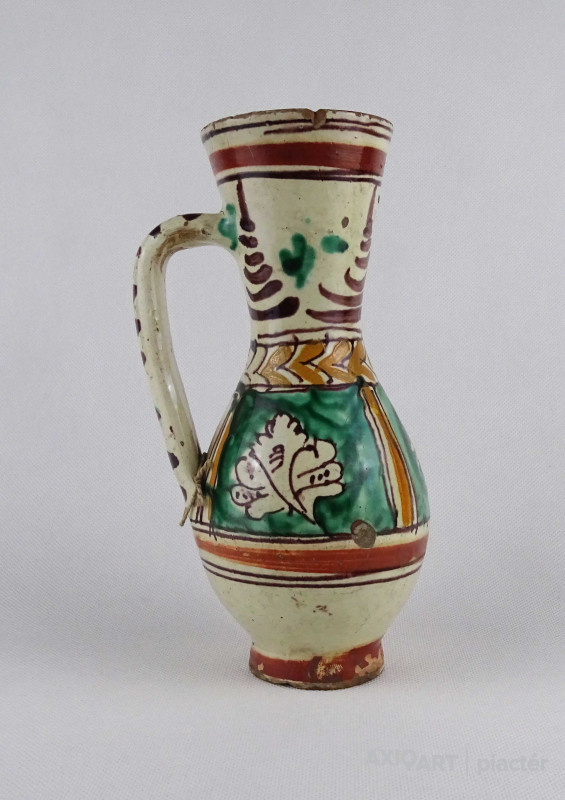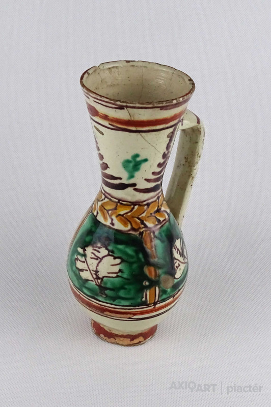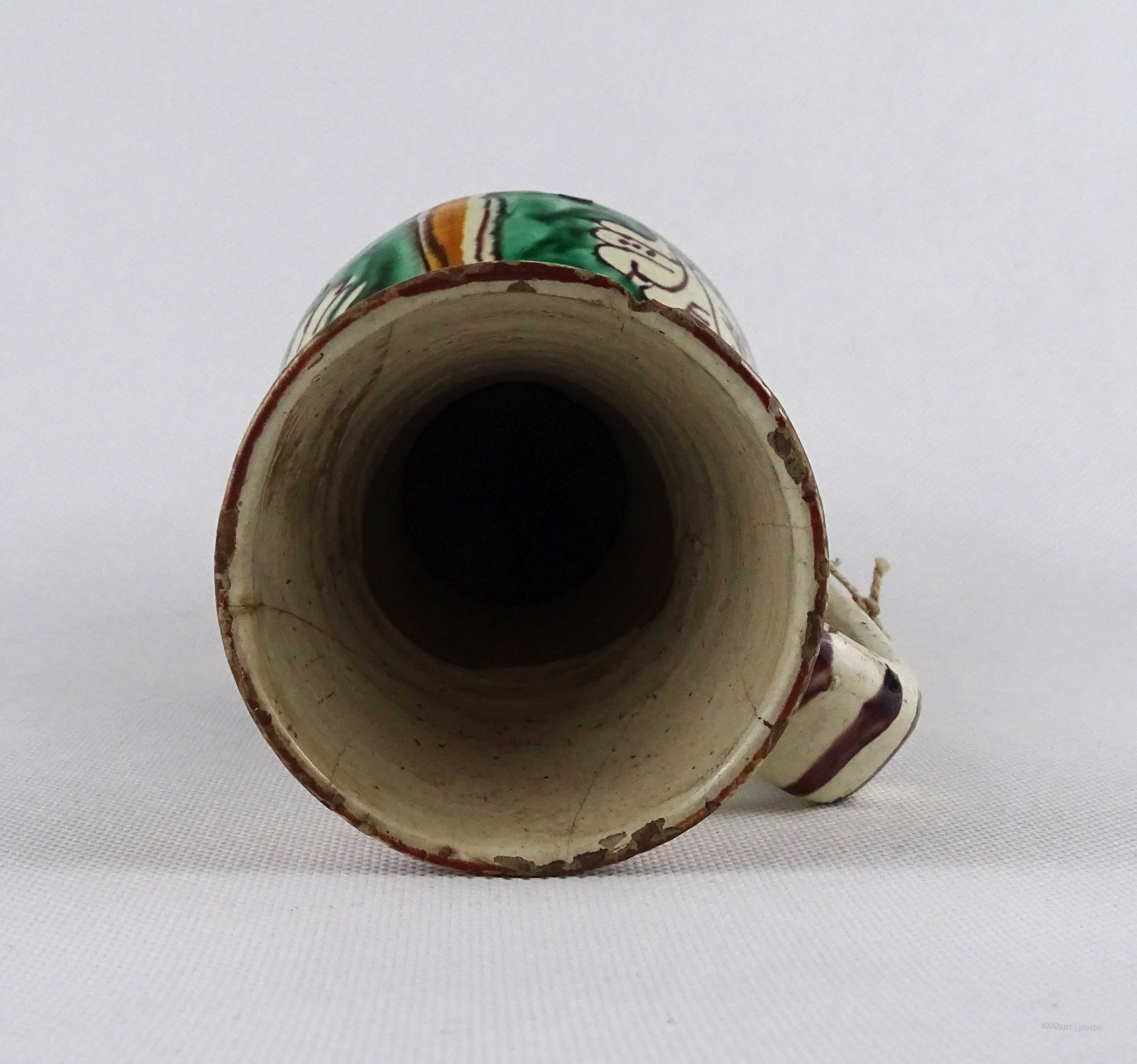 [1V537/X318/2] Antik, szép állapotban megmaradt, a XIX. század végén, az 1880-as években készült erdélyi néprajzi fazekas munka, székelyudvarhelyi bokály. Magasság: 22.8 cm Szélesség: 10 cm Hosszúság: 12.5 cm Súly: 0.47 kg