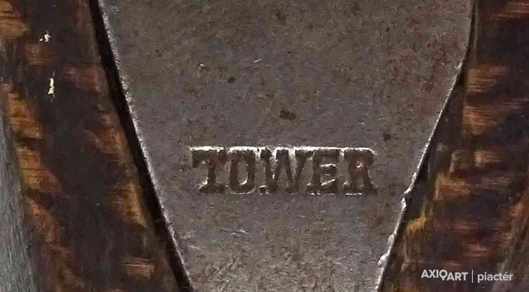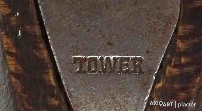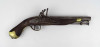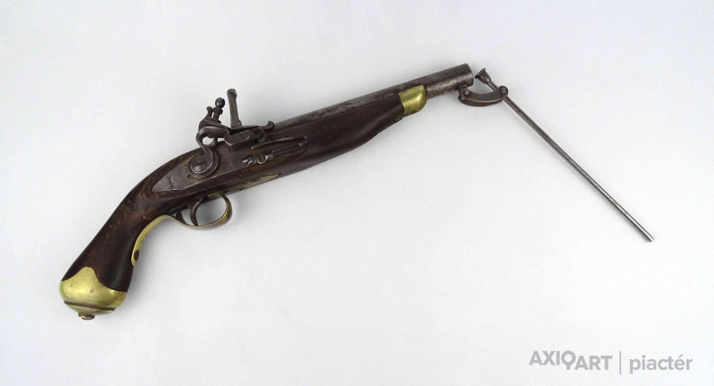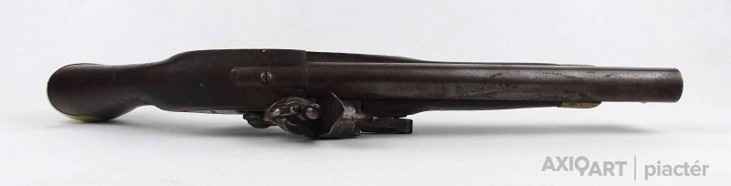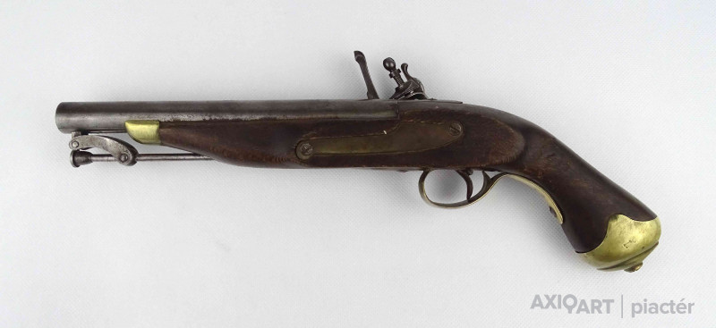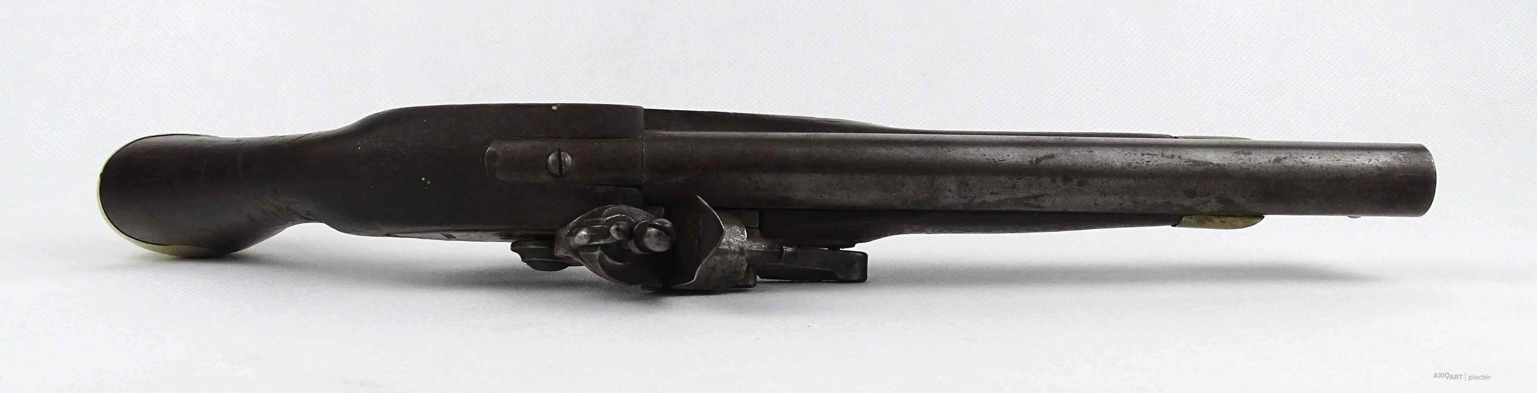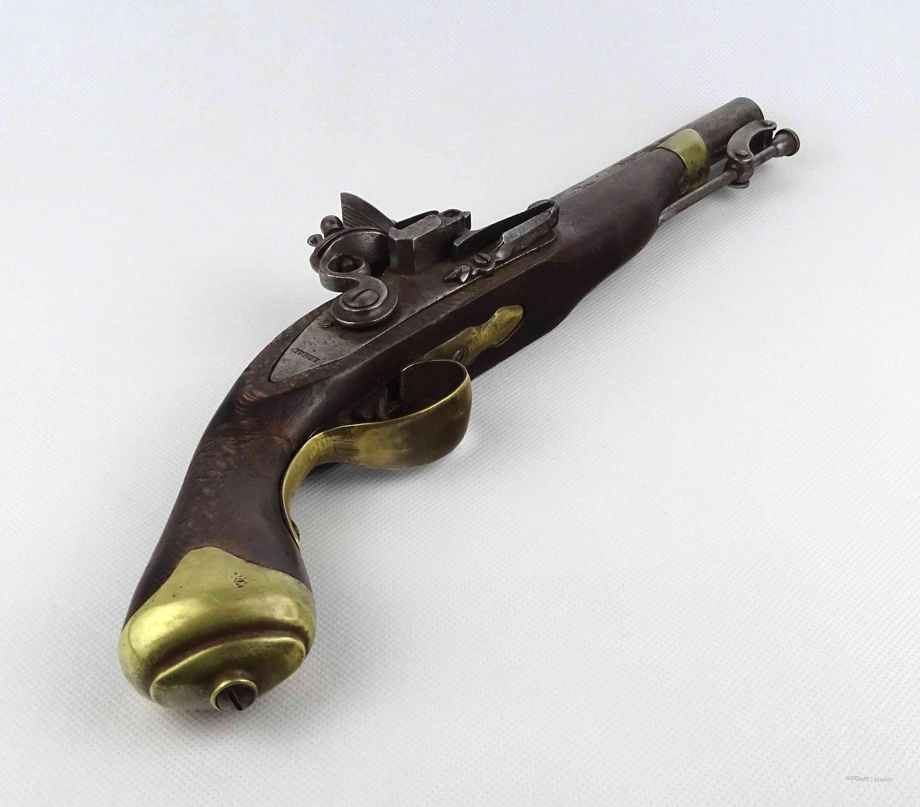 [1Y474/Z064] Antik jelzett angol elöltöltős feketelőporos pisztoly, szép állapotú fa ágyazattal, kovácsoltvas szerkezettel az 1800-as évekből. A szerkezet takarólemezén koronás jelzés melette felirat: TOWER Szélesség: 5 cm Hosszúság: 37 cm Súly: 0.93 kg