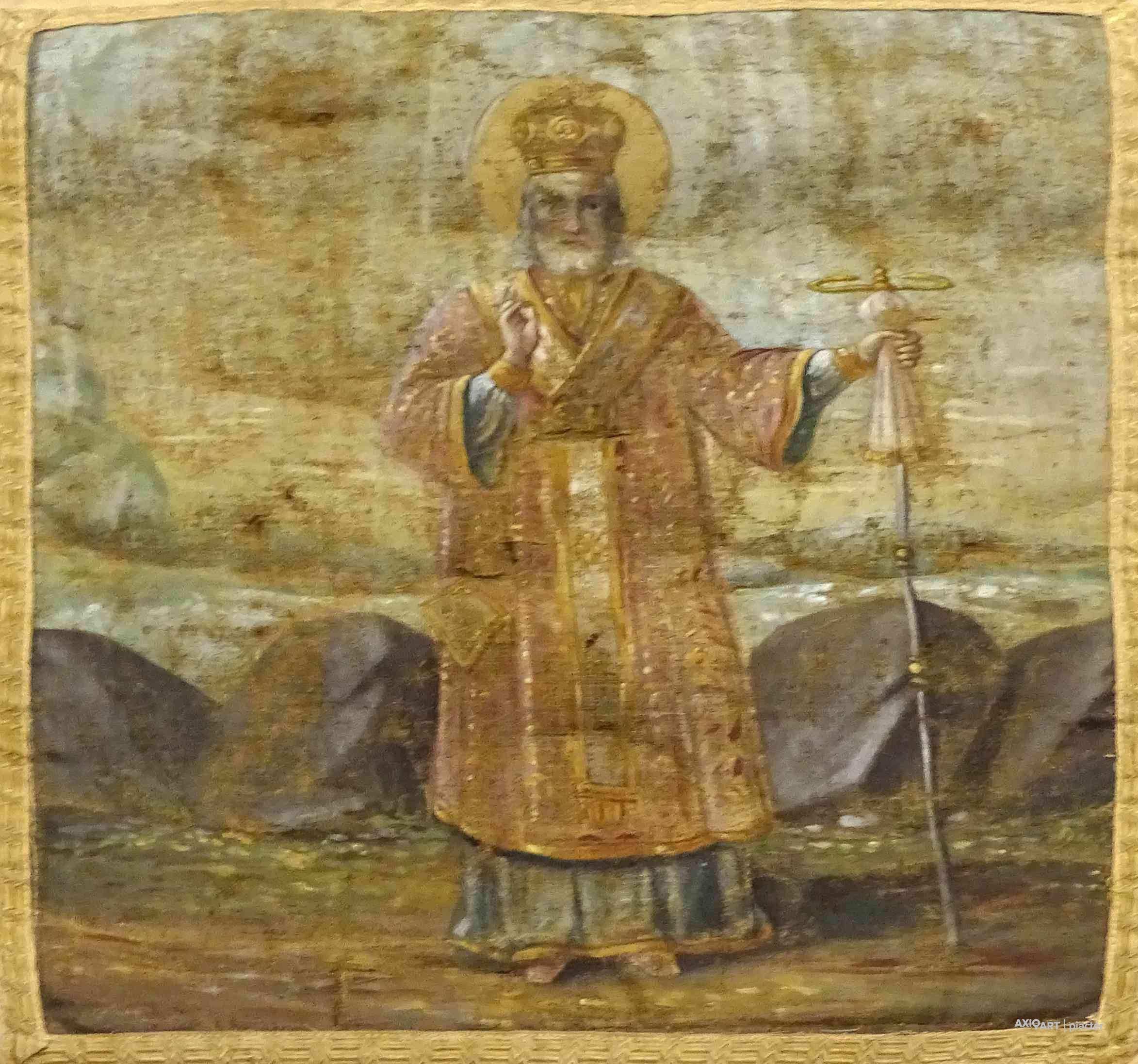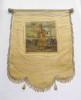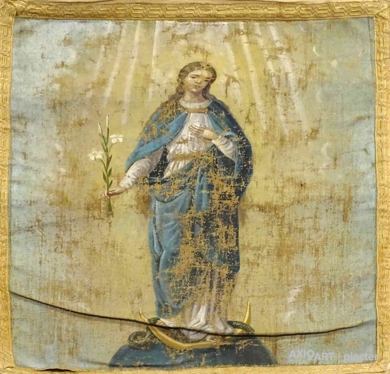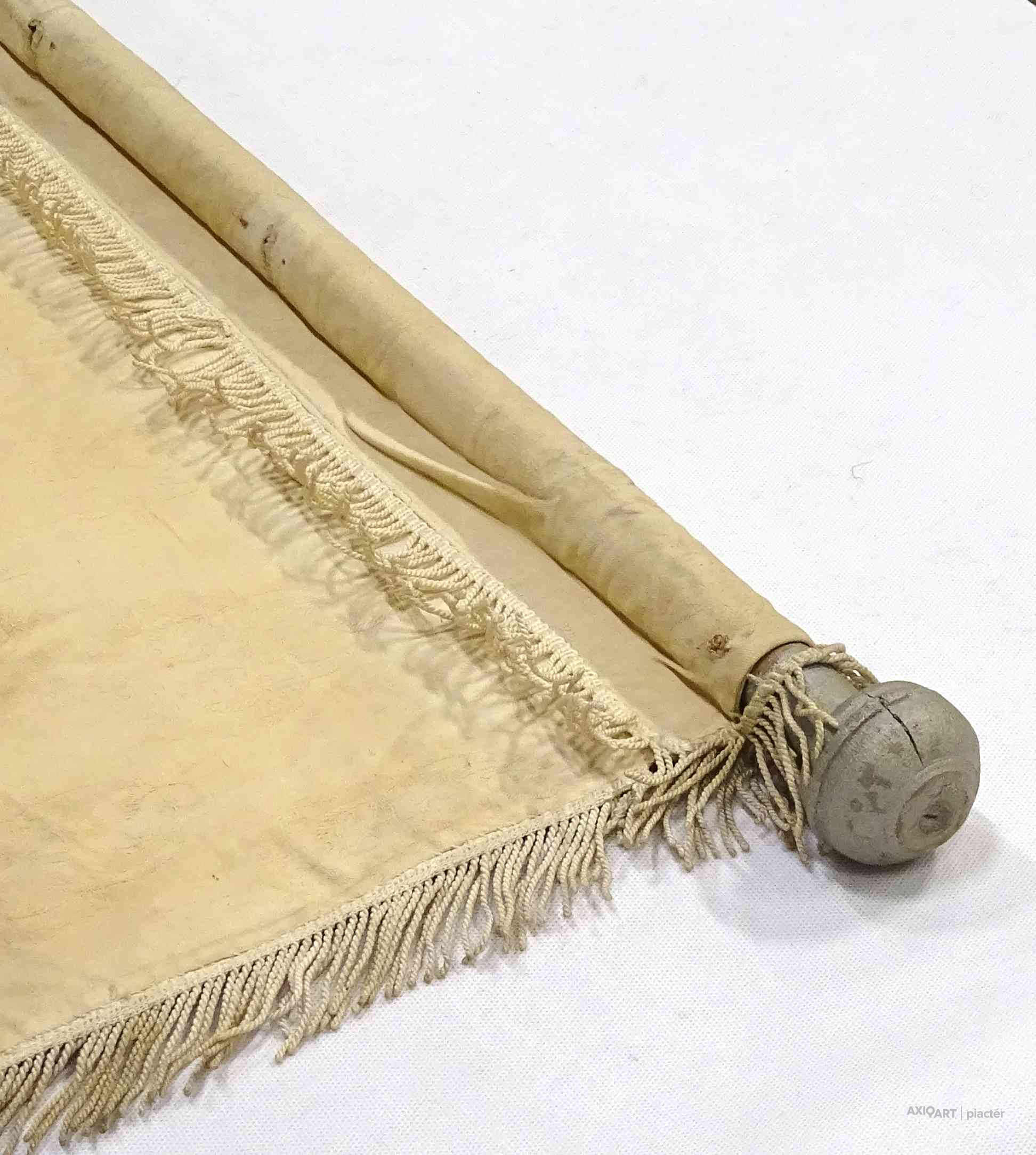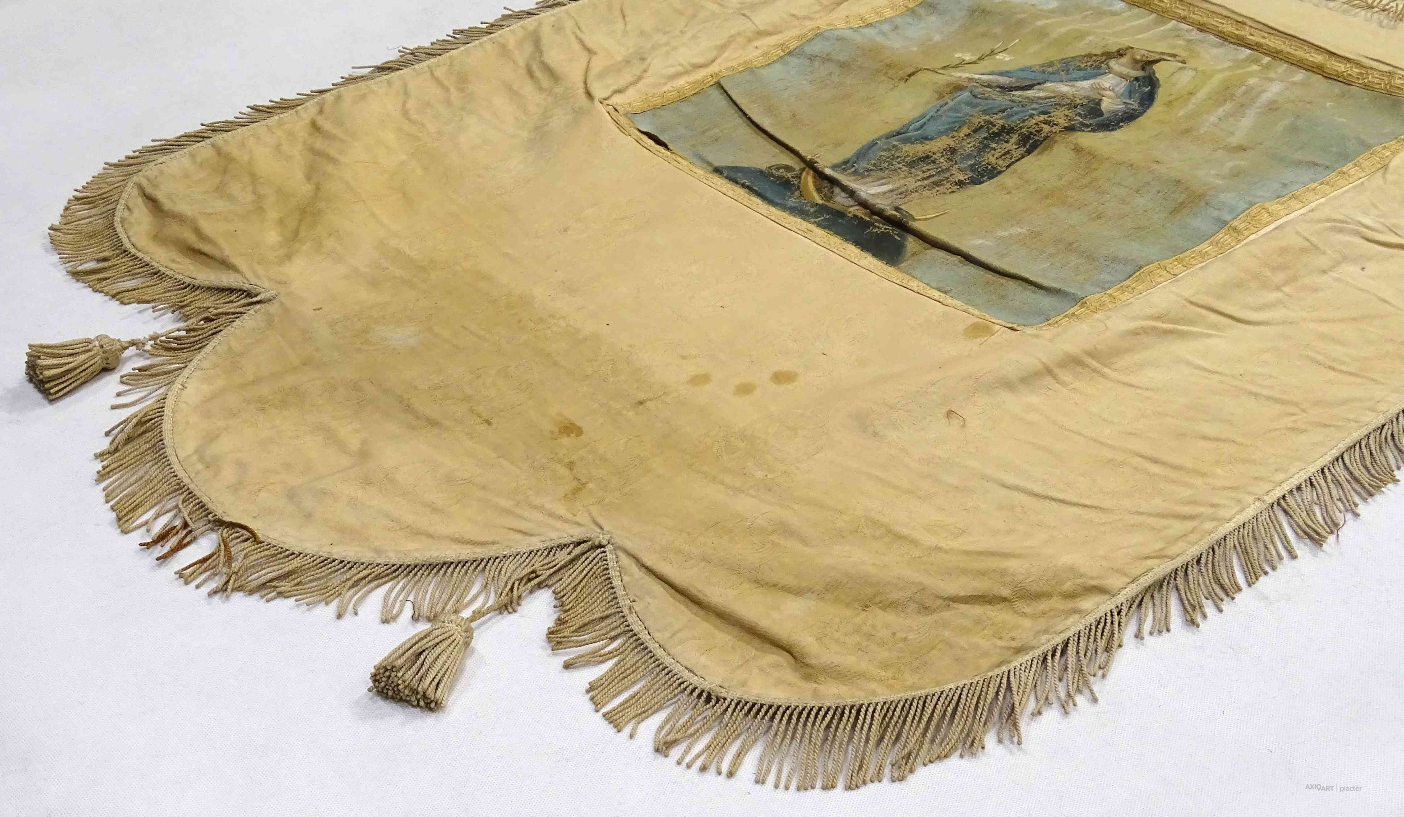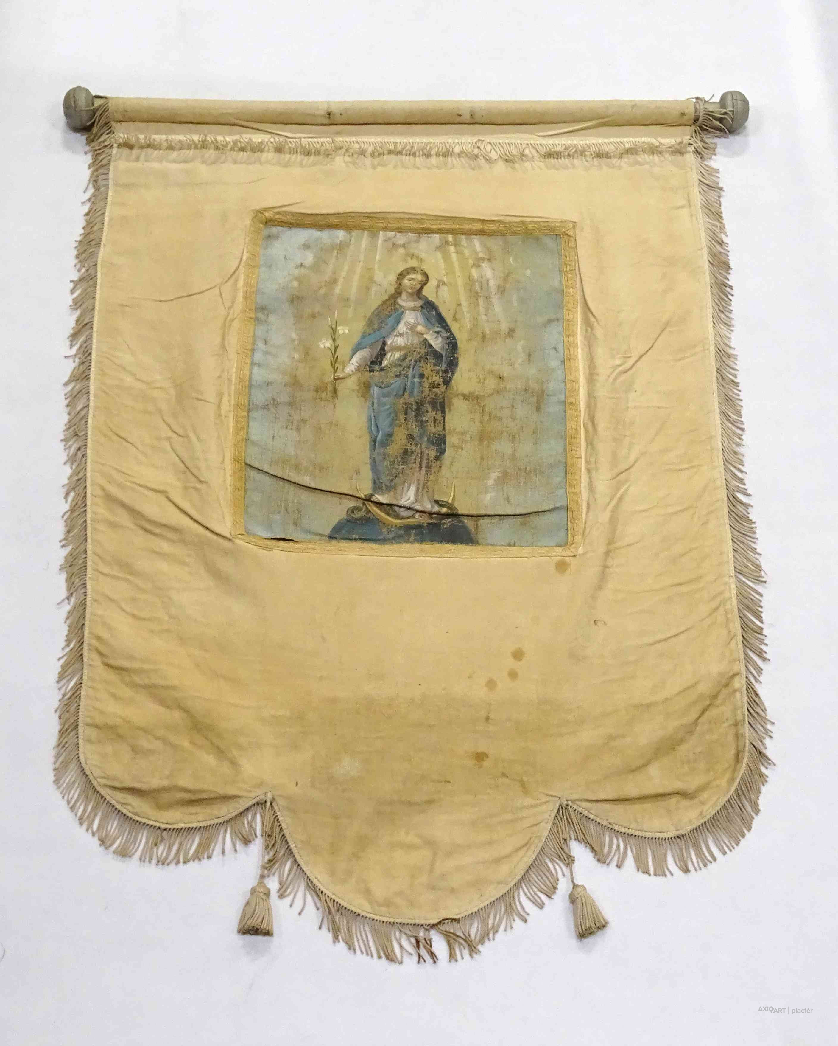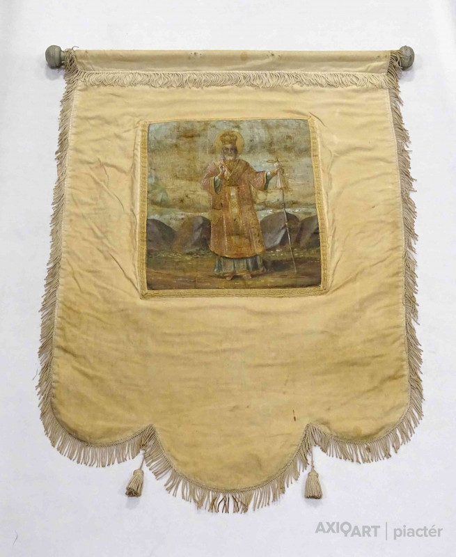 [1Y564/X256] Antik, XIX. századi templomi körmeneti zászló. Mindkét oldalán kézzel festett szentképekkel díszített templomi drapéria. A szentképeket hordozó vászon sérült, a festmények kopott állapotúak, míg maga a zászló jó állapotban van. A zászló anyaga világos, aranyszínű brokát, körben rojtozott, egy ezüst színű fa zászlórúd tartja. Szélesség: 80 cm Hosszúság: 115 cm Súly: 0.84 kg