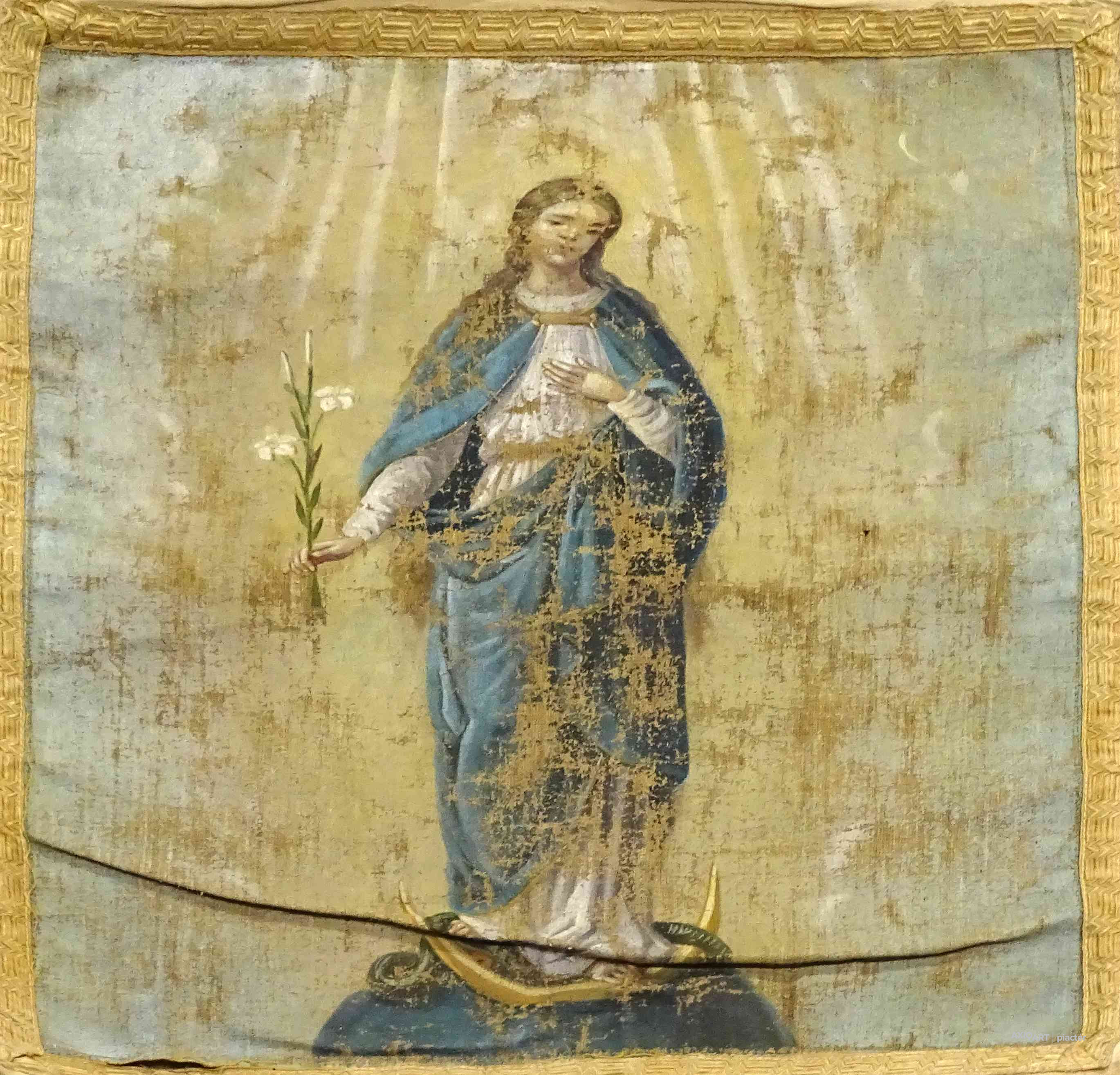 Antik XIX. századi világos templomi körmeneti zászló kétoldalán festett szentképekkel.