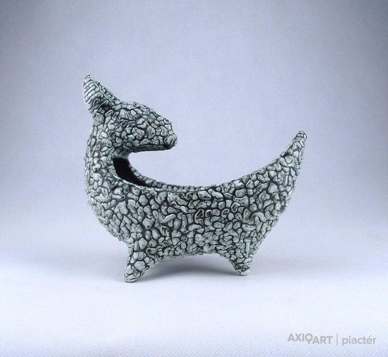 [2A010/Z023] Hibátlan állapotú, jelzett, részben mázas biszkvit porcelán szobor. Hátoldalán mélynyomott jelzés: SJ *C ( SARKANTYU JUDIT ) Magasság: 28.6 cm Szélesség: 5.8 cm Hosszúság: 8 cm Súly: 0.64 kg Sarkantyu Judit keramikus Születési hely: Szakály Születési dátum: 1947 Honlap: Kiállítások az adatbázisban:  "Meséim" - Sarkantyu Judit keramikusművész kiállítása Mesterei: Csekovszky Árpád, Litkei József. 1968-tól a Magyar Iparművészeti Főiskolán tanul, tanárai: Csekovszky Árpád, Litkei József. 1973: FIM burkolóanyag-pályázat, III. díj; 1975: Az év legszebb terméke, Iparművészeti Vállalat; 1976: A Csontváry Teremben megrendezett csoportos kiállításon a Művészeti Alap nívódíja; 1985: a Magyar Alkotóművészek Országos Egyesületének nívódíja. 1973-tól az Iparművészeti Vállalat Mázsa utcai Kerámia Üzemének volt a tervezője, majd 1979-től önálló tervezőként dolgozik saját műtermében. 1977-ben részt vett a Kerámia a kertben szimpóziumon, 1981-ben a Kecskeméti Kerámia Stúdió ösztöndíjasa volt. 1985-ben Siklóson dolgozott egy tíztagú szobrászcsoporttal. 1973-79 között az üzemi tervezés mellett anyagkísérleteket és építészeti munkákat végzett. Ezt követően az önálló technika és stílus kialakítása, folyamatos anyag- és formakísérletek következnek. Alapvetően enteriőr kerámiákat készít, figurális kőplasztikákat és faliképeket samottból és porcelánból. Egyéni kiállítások 1984 • Kossuth Lajos Művelődési Ház, Kölesd [Sarkantyu Simonnal] • Babits Mihály Művelődési Ház, Szekszárd • Kölcsey Ferenc Megyei Művelődési Központ, Debrecen 1988 • Vigadó Galéria, Budapest 1990 • Csók Galéria, Budapest • Kastélygaléria, Szirák 1996 • Csók Galéria, Budapest [Kiss Roóz Ilonával, Pannonhalmi Zsuzsával] 2000 • Szárnyak és árnyak, Szent Mihály-kápolna • Vincze Galéria, Szentendre. Válogatott csoportos kiállítások 1971 • Magyar Iparművészeti Főiskola Jubileumi Kiállítása, Ernst Múzeum, Budapest 1974 • Mai magyar iparművészet, Iparművészeti Múzeum, Budapest 1975 • Köztulajdon 1945-75, Műcsarnok, Budapest 1976 • Műcsarnok Szoborkiállítása, Őszi Budapesti Nemzetközi Vásár, Budapest 1981 • A kéz intelligenciája, Műcsarnok, Budapest 1982, 1984 • VII., VIII. Országos Kerámia Biennálé, Pécs 1983 • A tervezés értékteremtés. Országos Iparművészeti Kiállítás, Műcsarnok, Budapest Nemzetközi Mini Kerámia Triennálé, Zágráb 1985 • Iparművészeti Vállalat Jubileumi Kiállítása, Vigadó Galéria, Budapest 1986 • A zsennyei Művésztelep tíz éve, Szombathely 1986, 1990 • Pest Megyei Iparművészeti Tárlat, Képtár, Szentendre 1987 • Kölesdi program 10 éve, Művészetek Háza, Szekszárd 1990, 1993, 1995, 1996 • MKT kiállítása, Csók Galéria, Budapest 1994 • Magastűzön, A MKT kiállítása, Gödöllői Galéria Őszi Kerámia Kiállítás, Palme Ház, Budapest 2001 • Szentendre Salonban, MűvészetMalom, Szentendre. Művek közgyűjteményekben Nemzetközi Kerámia Stúdió Gyűjtemény, Kecskemét • Janus Pannonius Múzeum, Pécs. Köztéri művei kerámia fríz (terrakotta, 1975, Somoskőújfalu, határátkelő állomás vámkezelő terem fala) térelválasztó rács és nagyméretű virágtartók (samott-porcelán keverék, mázatlan, 1986, Budapest, Államigazgatási Számítógépes Központ aulájában) plasztika, kerámia csobogókút (samott, 1990, Szekszárd, Mezőgazdasági Kombinát kajmádi kastélyának kertje) Irodalom  ~ kerámia képei és figurái, Művészet, 1984/4. VADAS J.: ~ kiállítása, Magyar Ifjúság, 1988. június 10. porcelán és samott faliképei, Magyar Iparművészet, 2000/4.  Szentendre, 2000. Forrás: www.artportal.hu