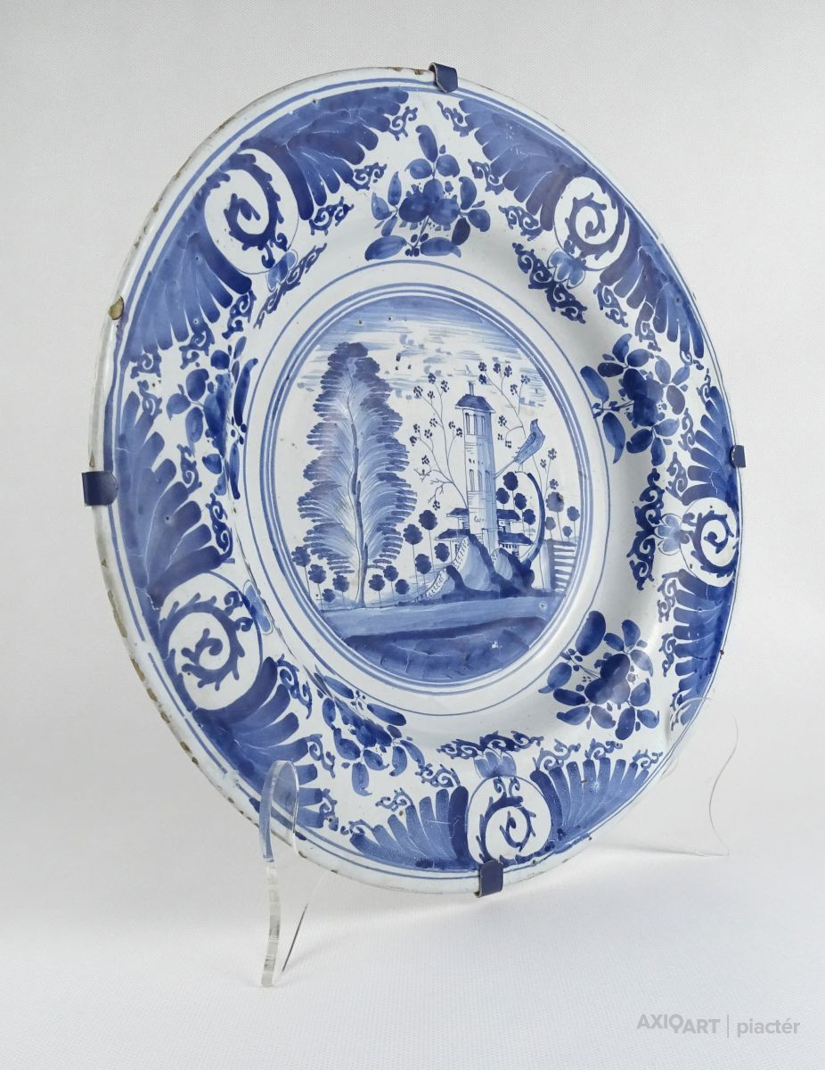 Antik, nagy méretű, nyugat-európai, kézzel festett kék motívumokkal díszített fajansz tál, fali tál az 1700-as évekből. Pántolt akasztási lehetőséggel rendelkezik.