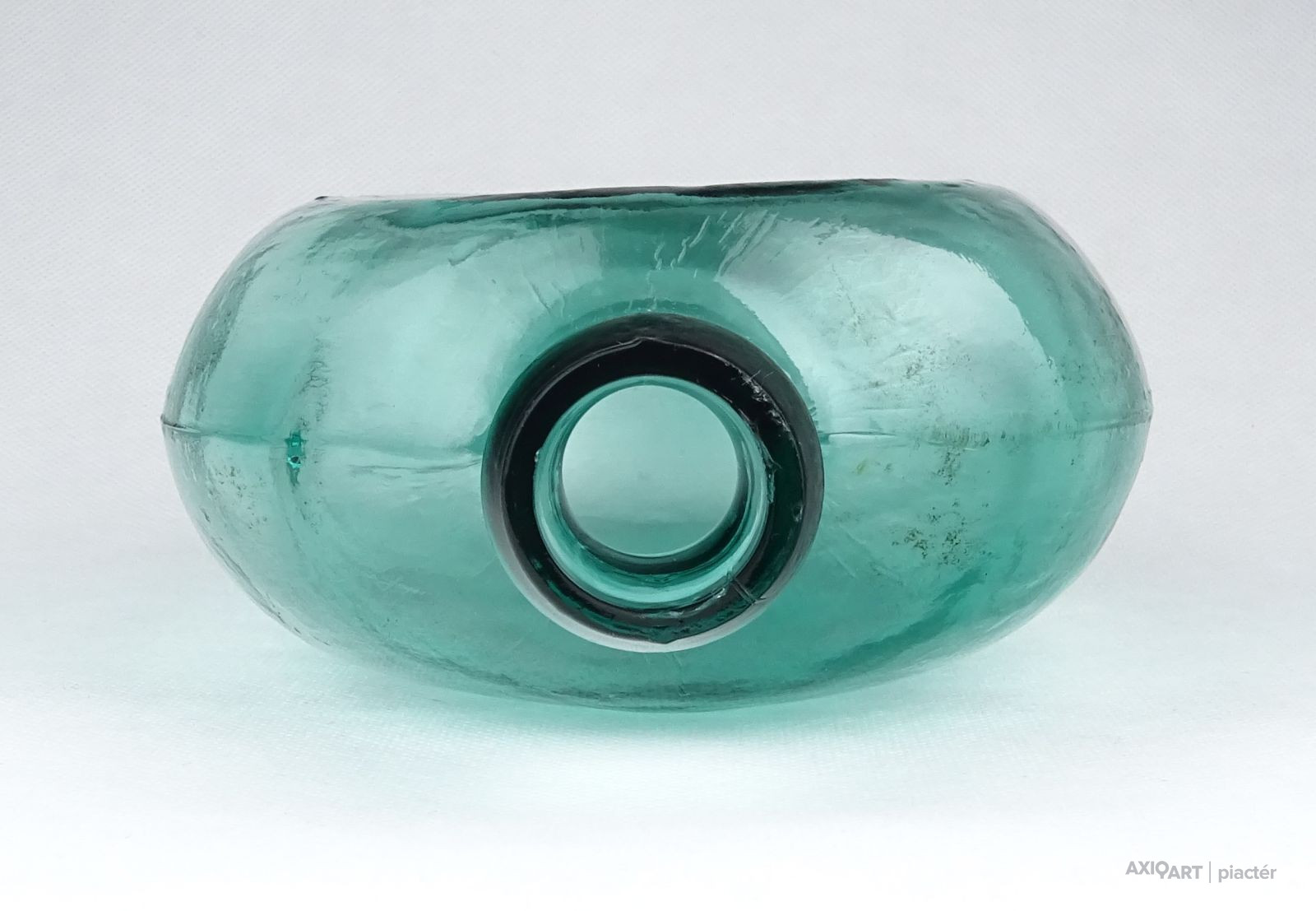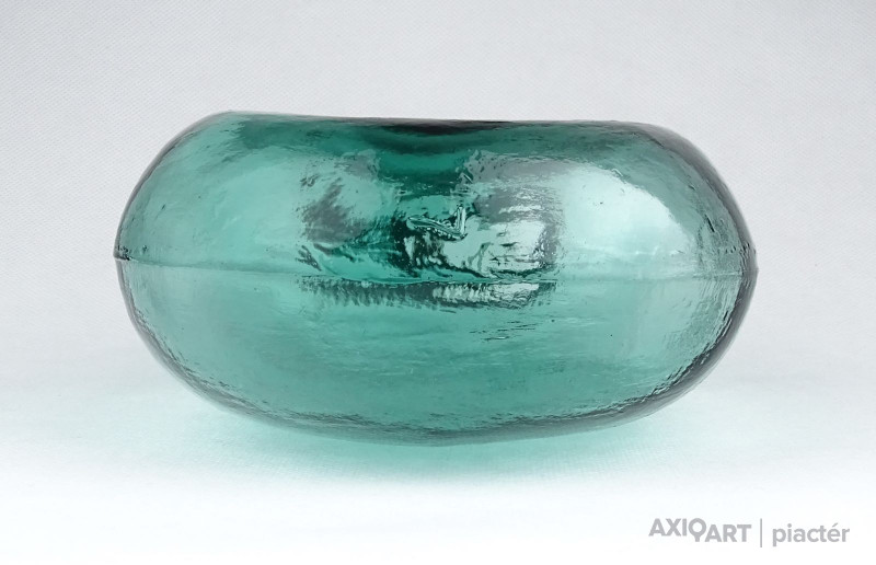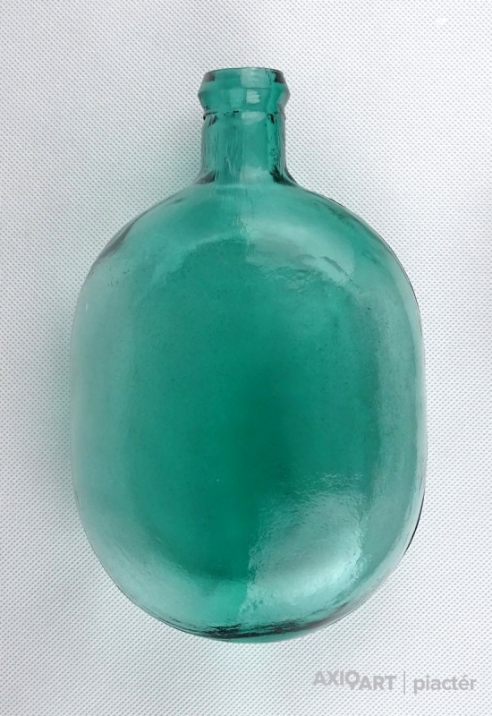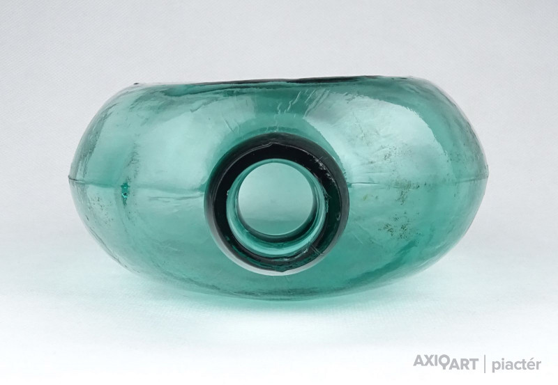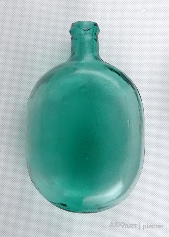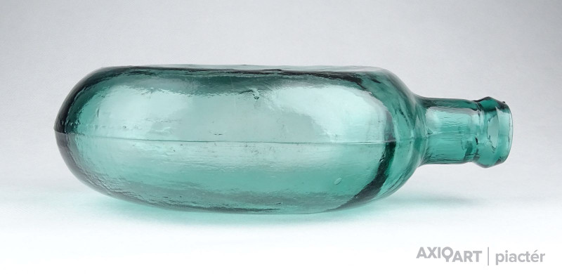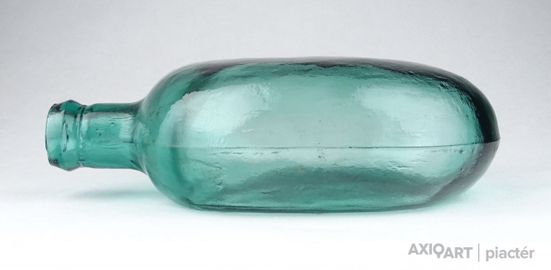 [0Z932/UZ-N] Antik, hibátlan állapotú, formába préselt vagy fújt zöld üveg butykos, üveg flaska. Gyújteménybe való, ritka darab! Szélesség: 12.5 cm Hosszúság: 20.3 cm Súly: 0.435 kg