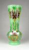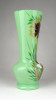 Antik, szép állapotú, halványzöld színű fújt üveg váza, díszváza. Rajta kézzel festett, aranyozott virág díszítés.