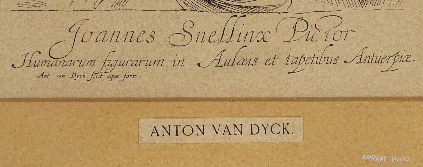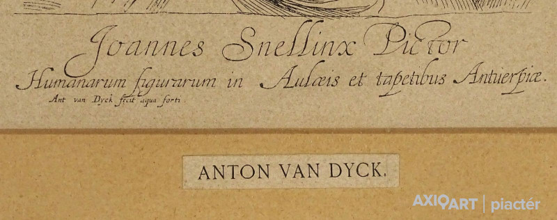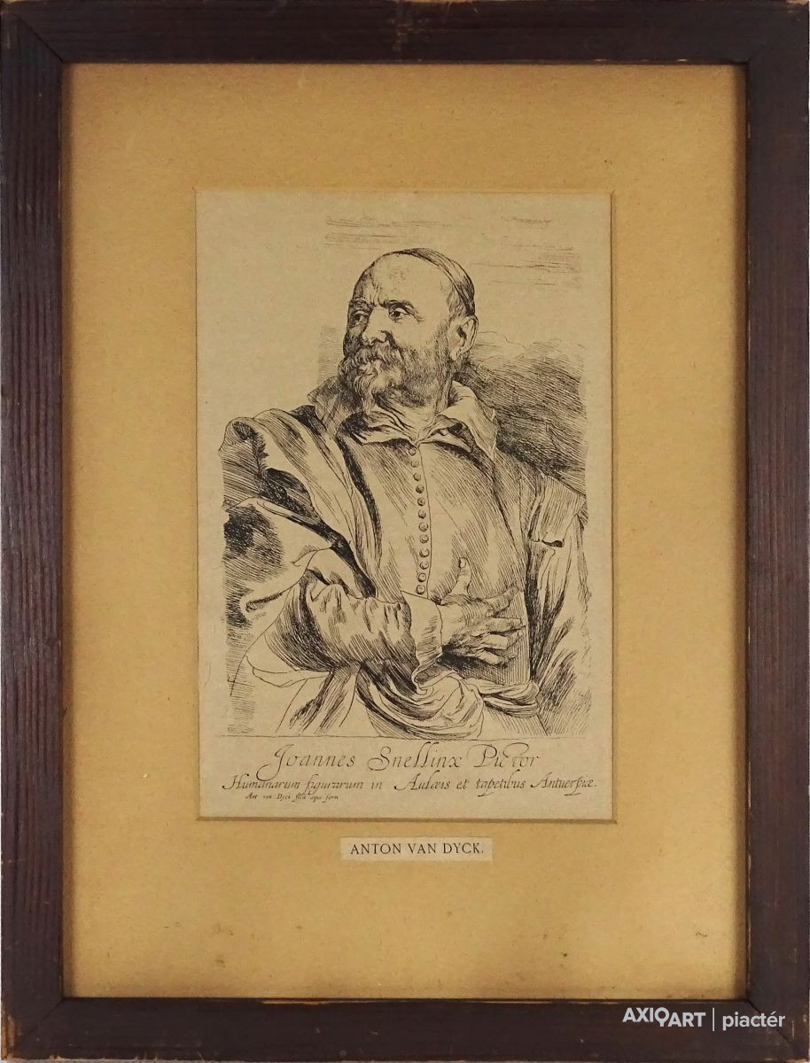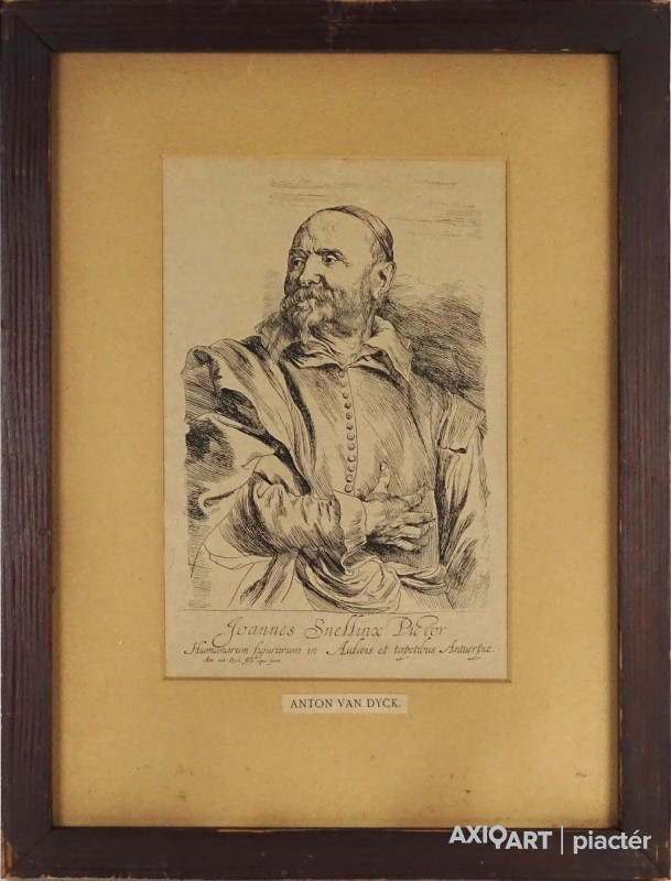 [1J362/094] Papír rézkarc üveglap mögött, paszpartuban, régi keretben. Akasztási lehetőséggel rendelkezik. Feliratok: JOANNES SNELLINX PICTOR HUMANARUM FIGURARUM IN AULCEIS ET TAPETIBUS ANTUERPICE ANT VAN DYCK FECIT AQUA FORTI ANTON VAN DYCK Magasság: 37 cm Szélesség: 28 cm Súly: 0.63 kg Anthony van Dyck Ugrás a navigációhozUgrás a kereséshez Anthony van Dyck Önarckép napraforgóval – Levey szerint a napraforgó királyi patrónusát jelképezi, a keresztbe vetett aranylánc pedig a tőle kapott ajándék Született 1599. március 22. Antwerpen Meghalt 1641. december 9. (42 évesen) London Sírhely Szent Pál-székesegyház Sir Anthony van Dyck (Anthonis van Dyck) (ejtése hollandosan: [antónisz fan dejk], angolosan: [entoni ven dájk]), (Antwerpen, 1599. március 22. – London, 1641. december 9.) flamand festő. Peter Paul Rubens tanítványa és segítőtársa, majd udvari portréfestő I. Károly angol király udvarában. Keresztnevének ismert változatai: az angolos Anthony [entoni], a latinos Anthonis [antónisz], a franciás Anthonie [antoni], a németes Anton [Anton] és az eredeti flamand Antoon [antón].      Tanulóévei  Van Dyck Antwerpenben született, jómódú családban. Tehetsége korán megmutatkozott, és 1609-re már Hendrick van Balennél tanult festészetet. 1615 körül vált független festővé, és közös műhelyt állított fel a még nálánál is fiatalabb ifj. Jan Brueghellel. Tizenöt éves korára már magasan kvalifikált, rutinos művész volt, amit 1613–14 közt datált önarcképe is mutat. 1618 februárjában felvették szabad mesternek az antwerpeni Szent Lukács-festőcéhbe. Néhány év múlva már Antwerpen és egész Észak-Európa fő segéde volt. Így Peter Paul Rubensé is, aki sokszor alkalmazott művészeket alvállalkozónak óriási műhelyében. Roppant nagy hatással volt a fiatal művészre. Rubens így hivatkozott a tizenkilenc éves fiatal művészre: „embereim legjobbja.” Kapcsolatuk eredete és igazi mivolta nem tisztázott. A feltételezések szerint Van Dyck már 1613-tól Rubens embere volt, mivel még korai munkái sem mutatnak Van Balen-stílusnyomokat, de erre nincs egyértelmű bizonyíték. Ugyanakkor Rubens dominanciájával a kicsi és hanyatló Antwerpenben érthető, hogy Van Dyck pályája nagy részét külföldön futotta be, és csak időszakonként tért vissza szülővárosába. 1620-ban például Rubens Antwerpen jezsuita templomának (mára megsemmisült) falfestményeire vonatkozó, a főtanács és közte létrejött szerződésben Van Dyck megjelölése: a szakember, aki a Rubens-tervek festését elvégzi. Jelentősége Holbein részleges említése mellett Van Dyck és kortársa, Diego Velázquez voltak az első festők, akik tehetségük folytán udvari portréfestők lettek. A kissé fiatalabb Rembrandt van Rijn egy ideig ugyancsak portréfestőként dolgozott. A zsánerkép portréfestészeti hierarchiának kortárs teóriájában munkáik az összesnek relatíve kis részét képviselik, a velük töltött idővel összevetve (ami abszolút értékben számos azért). Például Rubens csak közvetlen környezetében festett portrét, de Európa legtöbb udvarának dolgozott, anélkül, hogy szorosabban kapcsolódott volna egyikükhöz is.  Művei Marie-Louise Tassis arcképe (Lichtenstein-gyűjtemény, Vaduz) Több ok miatt a 17. században nagyobb igény mutatkozott a portrék iránt, mint bármely más műfaj után. Van Dyck megpróbálta rávenni Károlyt, hogy a fehérház bankettermének díszítésére a térdszalag rend történetét ábrázoló nagyszabású sorozatokkal bízza meg. A terem mennyezetét korábban Rubens óriási mennyezetfestményekkel díszítette – amiket Antwerpenből küldött. Egy fal tervrajza maradt meg, de 1638-ra Károly szűkös büdzséje nem tette lehetővé a munkák folytatását. Ilyen problémája nem volt Velazqeznek, ugyanúgy Van Dyck mindennapjai nem voltak triviális udvari kötelezettségekkel tele, ahogy Velazquezé. Párizsi látogatásai alkalmával, utolsó éveiben Van Dyck megpróbált elnyerni egy megbízást a Louvre nagy galériájának kifestésére, eredménytelenül. Fennmaradt Van Dyck történelmi festményeinek egy listája, melyet Belliori készített, Sir Kenelm Digby információira támaszkodva. Ismereteink szerint ezek egyetlen darabja sem maradt fenn, bár a királynak készült Erosz és Psziché igen. Sok más munkája azonban látható. Ezek inkább vallási, mint mitológiai témájúak, és bár nagyon szép művek, nem érik el Velasquez történelmi vásznainak szintjét. Korai művei inkább Rubens stílusát mutatják, bár van köztük néhány rendkívül egyéni szicíliai képe. Van Dyck portréi természetesen hízelgőbbek, mint Velasquezéi. Mikor Sophia, később Hannover választófejedelem asszonya, 1641-es hollandiai száműzetésében ezt írta: „Van Dyck csinos portréi minden angol női szépség gyönyörű érzetét keltik bennem. Úgyhogy meglepődve tapasztaltam, hogy a királyné, aki gyönyörű a festményen, igenis alacsonynak tűnt, amint felemelkedett székéből, hosszú vékony karjaival és védelmi fegyvernek beillő fogaival a szájában… ” [3] Ebből kiderül, Van Dyck olyannak festette az angol arisztokratákat, amilyeneknek ők magukat láttatni szerették volna, ez azonban nem ellenkezett a festő természetével, aki saját arisztokratikus magatartásával közéjük tartozónak érezte magát. Néhány kritikus Van Dycknek tulajdonítja, hogy a stílus a már kialakult, nehézkes angol portréfestési tradíciótól – legfontosabb képviselőik William Dobson, Robert Walker és Issax Fuller – egy természetesen elegáns lágyság felé tért el Van Dyck követőinek kezében, ezek például Lely vagy Kneller. Mondván, a konvencionális nézőpont mindig kedveltebb volt: „Ahogy Van D