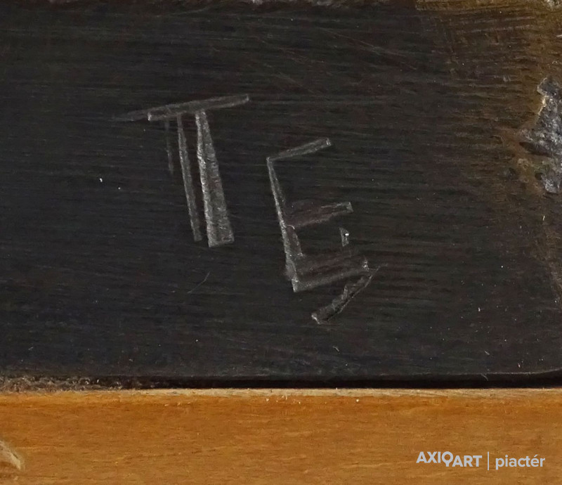 [1Y029/Z018] Olaj farost festmény, üveglap mögött, hibátlan képcsarnokos keretben. Hátoldalán Képcsarnok Vállalat papír címkéje: A művész neve: SCHÉNER MIHÁLY A kép címe: TÁJ Magasság: 66.5 cm Szélesség: 86 cm Súly: 6.54 kg Schéner Mihály festő, grafikus, szobrász, keramikus, bábtervező Medgyesegyháza, 1923-01-9 Elhalálozott: Budapest, 2009. május 11. Honlap: http://www.kormendigaleria.hu/kiadvany.html 1942-1947: Magyar Képzőművészeti Főiskola, tanára: Rudnay Gyula. 1978: Munkácsy-díj; 1984: érdemes művész; 1989: kiváló művész; 1995: Kossuth-díj. 1992-től a Magyar Művészeti Akadémia, 1993-tól a Széchenyi Irodalmi és Művészeti Akadémia tagja. 1956-ig tanított. 1982: Nagyatádi Faszobrász Alkotótelep, 1985: Nemzetközi Acélszobrász Alkotótelep, Dunaújváros. A stílusában felismerhető, mégis sokféle műtárgyat létrehozó ~ gazdag, állandóan alakuló életműve a folyton változó világban helyét kereső, az alkotói szabadságot megvalósító XX. századi képzőművész példázata lehetne. Magát expresszív-szürrealista alkotónak nevezi. Egyaránt dolgozik festékkel, textillel, fával, fémmel. Rajzol, szerkeszt, farag, épít, gyúr, varr és ragaszt, felhasználja a mézesbábok öntőformáit. Festő, rajzoló, textilszobor- és bábkészítő, fazekas, asztalos, esztergályos. Háromlépcsős folyamatban gondolkozik: rajzban tervez, majd fest, szobrot készít, “formába önt”, mindig a végső plasztikai megoldást keresi. Ami állandó és mégis játékosan változékony megjelenésű Schéner művészetében, az a gyermekkori emlékek által meghatározott népi mesterségek iránti tiszteletet kifejező motívumkincs, a tárgyi folklór formakészlete, amely már-már kézjegyként ismétlődik munkáin. Mitologikussá nőtt képzelete új lényeket teremt, pl: a Pigulát, amely disznótestű, emberfejű teremtmény. Schéner festményein a szürrealista motívumokat konstruktív szerkezetbe rendezi, a geometriát és az organikus természeti motívumokat egyaránt beépíti műveibe. A népi, népművészeti formakincsből merített lovas huszárok, betyárok, szegénylegények cifra szűr mentéje, piros csákója, fekete csizmája, az önálló életet élő zsinórdíszek és mézeskalács bábok, a kiskocsik a gyermekkori vásárok, búcsúk színes forgatagába vezet. A primér motívumokat aztán felváltják a vastagon felhordott felületbe karcolt jelek, vonalhálózatok, amelyek a játszó gyermek homokba rajzolt ábráit, a pásztorember fába vésett üzeneteit, az ősember barlang falába rótt mágikus jeleneteit idézik meg. A művész pillanatnyi érdeklődésének megfelelően a színek búvópatakként tűnnek el és jelennek meg ismét. A 60-as években leginkább a formákkal való játék érdekelte, a festmények felülete egyre gazdagodott: a táblaképek felületén applikációk jelentek meg, vagy lemállasztott rétegek hagyták maguk után hiányukat, motívumok nélküli ősformák, archetipikus képzetek bukkantak fel művészetében. A véletlenszerűnek látszó rétegekkel való játék azonban tudatos komponálás eredménye, amely később nyilvánvaló ritmusnak és formai szerkesztettségnek adja át a helyét, mint a Törvénytáblák c. sorozaton. A különböző művészi kifejezési formák egymásra termékenyítő hatással vannak, át- meg áthatják egymást. Textilszobrai, amelyekkel új műfajt teremtett, ugyanazzal az automatikus, expresszív-szürrealista módszerrel készülnek, mint festményei. A hagyományosan a népművészetben alkalmazott anyag, a filc lehetőséget ad a népi formakincs felelevenítésére, amely azonban a művész különös szürrealista átiratában jelenik meg. A szívekkel kivarrt, zsinórdíszes Posztókotlós c. művén mézesbábok lógnak, hátán huszárok lovagolnak. Egész sor textilből készült kéz-plasztikát alkot, amelyeket az ujjakra rávarrt díszekkel öltöztet, személyesít meg. A színes-különös világból aztán ~ újra puritán képi és formai rendbe juttatja el a nézőt, majd nemsokára tépett, gyűrt, vágott, csorgatott, repedezni hagyott szenvedélyesen vonagló képi felületeket hagy hátra. Schéner készített apró gyermekjátékokat, térstruktúra-tereket, mászókákat is. A magyar népi formák mellett szürreális játékaiban gyakran alkalmaz görög mitológiai alakokat, “elkentaurosodott” lovakat, Gorgó-fejeket, sellőket, hárpiákat, Pán-ábrázolásokat. Schéner nemcsak saját művészetéről publikál, hanem művésztársairól is számos írása jelenik meg, elsősorban az Új Auróra c. folyóiratban, amelynek egy ideig főmunkatársa volt. Irodalom kiállítása, Magyar Építőművészet, 1962/4. Húsz év után, Művészet, 1965/4. BOZÓKY M.: ~, Tiszatáj, 1968/5. PERNECZKY G.: Nincs uborkaszezon, Élet és Irodalom, 1969. augusztus 8. BARÁNSZKY-JÓB L.: ~, Művészet, 1969/9. LÁSZLÓ GY.: ~ kaposvári kiállítása, Jelenkor, 1969/4. MAJOR M.: Pásztorok, betyárok, huszárok - kezek, Tükör, 1970. szeptember 15. FRANK J.: Bemutatjuk ~t, Élet és Irodalom, 1972. május 6. ról kiállítása ürügyén, Képzőművészeti Almanach, Budapest, 1972 Sötétkék kokasok, Élet és Irodalom, 1973. szeptember 9. MAJOR M.: ~ játékai, Élet és Irodalom, 1974. július 27. BARTA J.: Egy különös művész, Alföld, 1974/6. VADAS J.: Szárnykészítők, Élet és Irodalom, 1975. október 4. JUHÁSZ F.: A halál ellen játszani, Élet és Irodalom, 1975. május 17. PAP G.: Kincsek és műkincsek, Művészet, 1975/6. P. SZŰCS J.: Az utak kettéválnak, Művészet, 1978/3. Békési művészet, Művészet, 1978/7. SZAMOSI F.: ~ [kismonográfia], Budapest, 1978 VADAS J.: Játék a játékkal, Élet és Irodalom, 1979. augusztus 18. NÉMETH L.: ~ műveiről, Művészet, 1979/4. MIKLÓS P.: Mit akar ez a múzeum?, Művésze