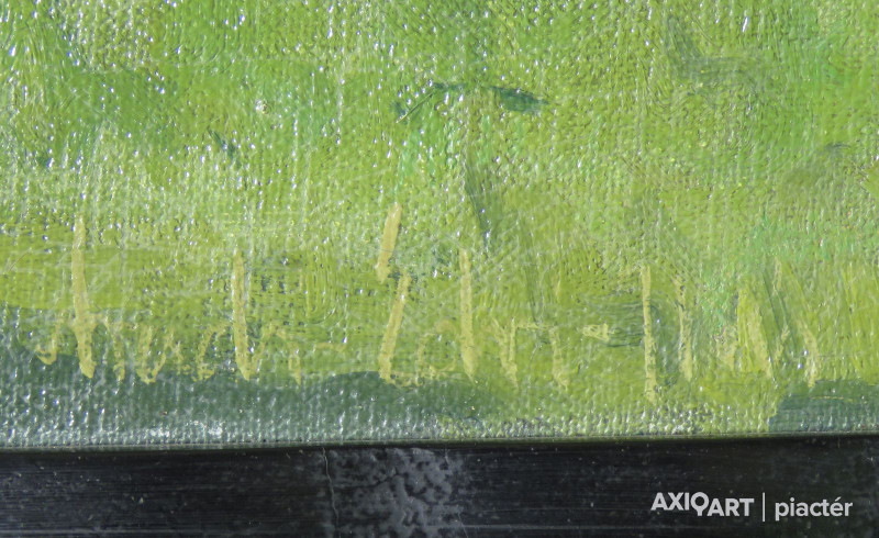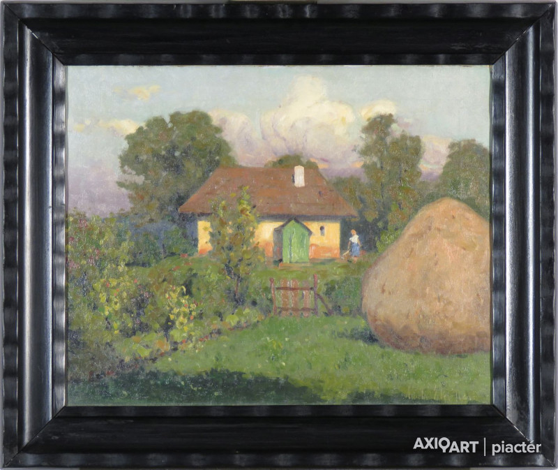 [FKC876/Bp92/46] A kép mérete: 100 x 81 cm keret nélkül. Készült: Olaj, Vászon A kép Ujváry Ignác (Pest, 1860, Kisoroszi, 1927) alkotása. Jelezve balra lent "Újváry I." A festmény jó állapotban van. Keret: Ép Magyar festők és grafikusok életrajzi lexikona I-II. Festő. Budapesten Lotz Károly mellett, a Benczúr-mesteriskolában, majd Münchenben és Párizsban tanult. Eleinte nagyobb kompozíciókkal szerepelt a fővárosi tárlatokon (Szent István szentté avatása), később visszavonulva Kisorosziba, erőteljes, friss tájfestményekkel lépett fel (virágos rét, Eresz alatt, stb.). 1928-ban a Műcsarnokban hagyatéki kiállítást rendeztek műveiből. Tanára volt a budapesti Iparművészeti Iskolának. Több díjat kapott. 1891-ben a Rökk-díjat, 1894-ben a Műbarátok-díját, 1895-ben pedig az Ipoly-díjat nyerte. Tagja volt a Magyar Képzőművészek Egyesületének. Néhány munkája a Magyar Nemzeti Galéria tulajdona. (Éber, ML, VNML) Magyar festők és grafikusok életrajzi lexikona I-II. Műgyűjtők és kereskedők kézikönyve Festő. Budapesten Lotz Károly mellett, a Benczúr-mesteriskolában, Münchenben és Párizsban tanult. Eleinte nagyobb kompozíciókkal szerepelt (Szent István szentté avatása), majd visszavonulván Kisorosziba, erőteljes, friss tájképekkel lépett fel. Tanára volt a fővárosi Iparművészeti Iskolának. 1891-ben Rökk-díjat, 1894-ben a Műbarátok díját, 1895-ben az Ipoly-díjat nyerte. Néhány képe a MNG tulajdona. (Éber) Művészeti lexikon I-II. Festő, szül. Budapest 1860. szept. 20. U. o. végezte tanulmányait s eleinte nagyobb kompozíciókkal szerepelt (Szent István szentté avatása), később visszavonulván Kisorosziba, erőteljes, friss tájképekkel lépett fel (Virágos rét, Eresz alatt). Tanára az Iparművészeti Iskolának. Művészeti lexikon I-IV. Festő. Bp.-en Lotz Károly tanítványaként, majd a Benczúr-mesteriskolában, később Münchenben és Párizsban végezte tanulmányait. Eleinte nagyobb kompozíciókkal szerepelt a bp.-i tárlatokon (Sz. István szentté avatása), később Kisorosziba visszavonulva erőteljes ecsetkezelésű, friss tájképeit állította ki. Több művésszel együtt részt vett a Feszty-körkép festésében. Az Iparművészeti Iskola tanára volt. Számos díjat nyert. Néhány képét a Nemz. Gal. őrzi. 1928-ban a Műcsarnok hagyatéki kiállítást rendezett műveiből. Magyar festők és grafikusok adattára Korai képei nagyobb történelmi kompozíciók, legjobb művei azonban Kisorosziban festett tájai. 1928-ban rendezték meg hagyatéki kiállítását a Műcsarnokban. Zsellérudvar, Őszi est, Hajóépítés a Dunaparton c. munkáit a Magyar Nemzeti Galéria őrzi. - Irod.: Lyka Károly: Ujváry Ignác, Magyar Művészet, 1927.