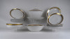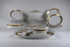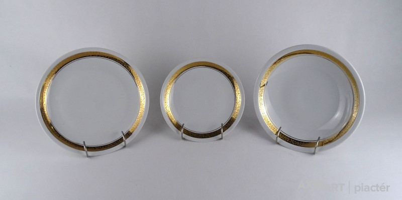 Hat személyes 26 darabos alföldi porcelán étkészlet, tányérkészlet. A készletet körben aranyozott virágdíszes szalag díszíti.