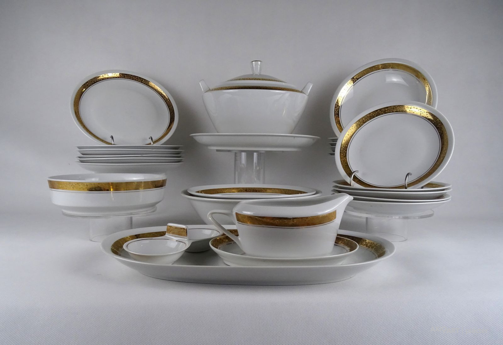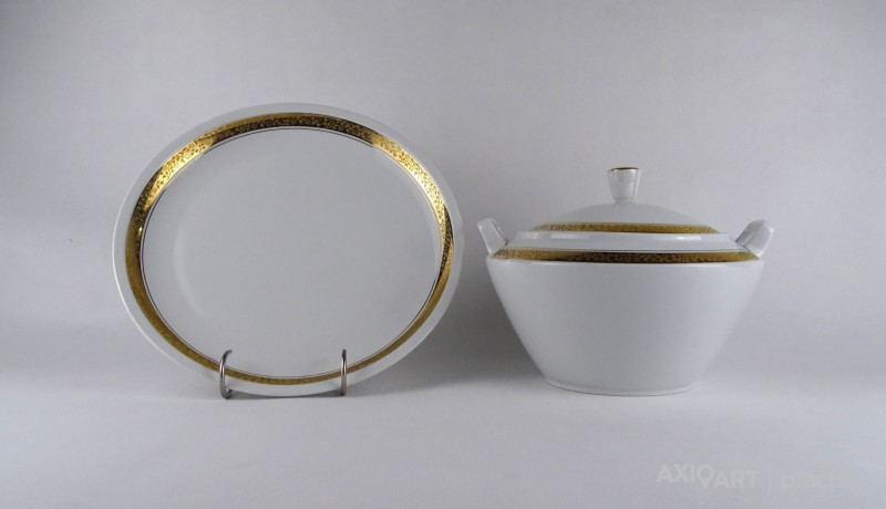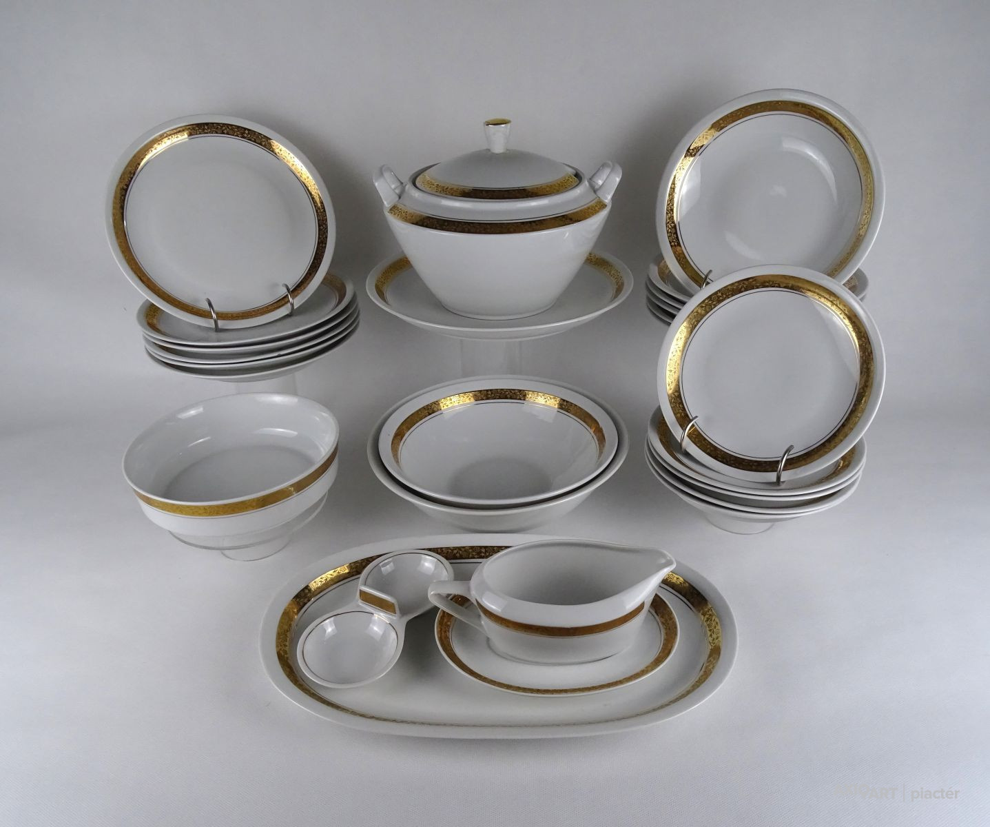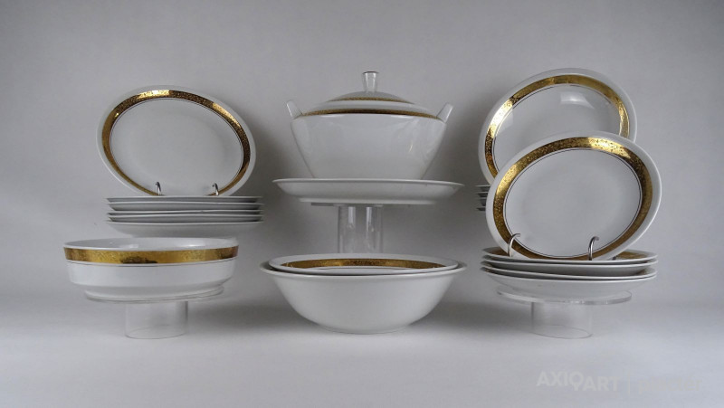 [1T257/X186] Hat személyes 26 darabos alföldi porcelán étkészlet, tányérkészlet. A készletet körben aranyozott virágdíszes szalag díszíti. Alján kék márkajelzés: ALFÖLDI PORCELÁN HUNGARY Készlet darabjai: - 1 darab levesestál (19 x 23 x 25 cm) Teteje sérült, ragasztott. - 6 darab levesestányér, mélytányér (22.8 cm) Egyiken lepattanás található. - 6 darab lapostányér (23.3 cm) Két darabon lepattanás található. - 1 darab magasfalú kerek tésztástál, kínáló tál (7.7 x 25.2 cm) - 1 darab magasfalú kerek zöldséges tál, kínáló tál (6.8 x 23 cm) - 1 darab nagyméretű ovális alakú húsostál, pecsenyéstál (22 x 37 cm) - 1 darab kerek kínáló tál (5.5 x 19.2 cm) - 1 darab kerek kínáló tál, tortatál (28.5 cm) - 5 darab süteményes kistányér (19.2 cm) - 1 darab fűszertartó, sószóró (4 x 8 x 16 cm) - 1 darab mártásos szószos kiöntő (8 x 9.3 x 18.5 cm) - 1 darab szószos alátét tányér (14 x 19 cm) Súly: 11.81 kg