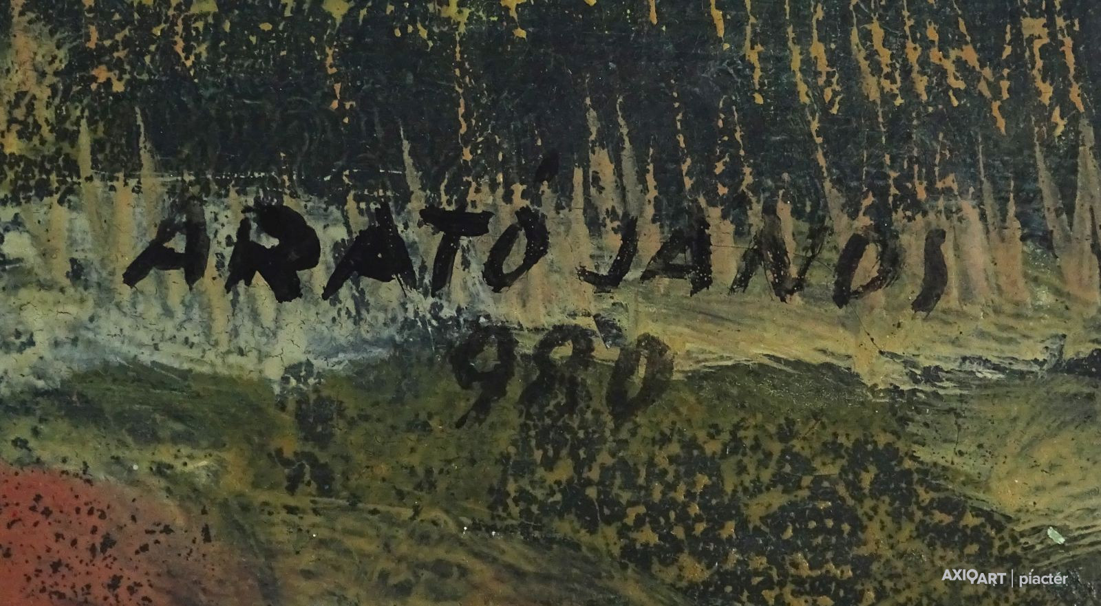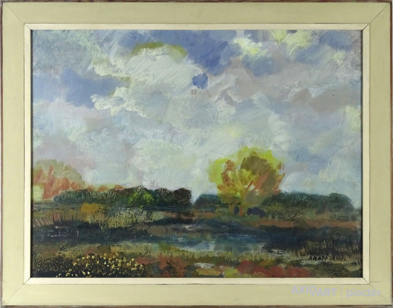 [1K600/025] Olaj farost festmény, üveglap mögött, keretben. Jobbra lent datált jelzés: ARATÓ JÁNOS '980 Magasság: 73 cm Szélesség: 93 cm Súly: 6.79 kg Arató János festő Szentes, 1919-01-3 Elhalálozott: Szentendre, 1989. szeptember 26. 1939-1943: Magyar Képzőművészeti Főiskola; mestere: Szőnyi István. A főiskola után a Budapesti Műszaki Egyetem Rajz és Formaismereti Tanszékének oktatója, majd docense, tíz éven át tanszékvezető tanár. 1947 óta kiállító művész. 1959-ben a Szentendrei Művésztelepen kezdett el dolgozni, amelynek több mint tíz éven keresztül volt aktív tagja. A nyolcvanas évek elejétől a Balaton mellett festett. Szentendrei korszakában elsősorban tájképeket és enteriőröket festett, visszafogott színekkel. Képeinek meghatározó elemei a konstruktív jellegű szerkezet és a formákat hangsúlyosan elhatároló kontúrvonal. Későbbi periódusában jelentős stílusváltozás következett be. A Balaton vidékén készült képein a korábbi, mértaniasabb szerkezetet felváltja egy nagyvonalúbb, atmoszferikus hatásokat is érzékeltető stílus. Az egymásba mosódó formákat elevenebb színekkel érzékelteti. Egyéni kiállítások Egyéni kiállítások 1982 • Képcsarnok, Győr.    Forrás: artportal.hu