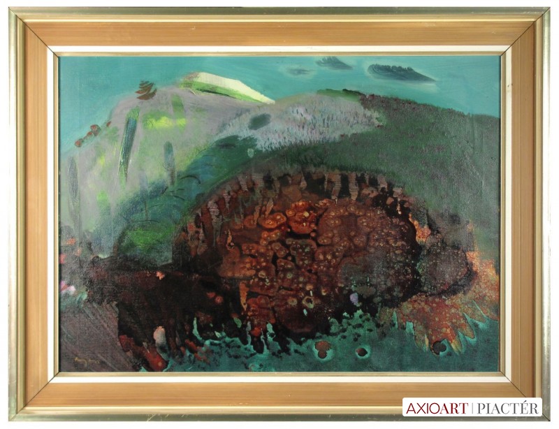 [1Y029/Z018] Olaj farost festmény, üveglap mögött, hibátlan képcsarnokos keretben. Hátoldalán Képcsarnok Vállalat papír címkéje: A művész neve: SCHÉNER MIHÁLY A kép címe: TÁJ Magasság: 66.5 cm Szélesség: 86 cm Súly: 6.54 kg Schéner Mihály festő, grafikus, szobrász, keramikus, bábtervező Medgyesegyháza, 1923-01-9 Elhalálozott: Budapest, 2009. május 11. Honlap: http://www.kormendigaleria.hu/kiadvany.html 1942-1947: Magyar Képzőművészeti Főiskola, tanára: Rudnay Gyula. 1978: Munkácsy-díj; 1984: érdemes művész; 1989: kiváló művész; 1995: Kossuth-díj. 1992-től a Magyar Művészeti Akadémia, 1993-tól a Széchenyi Irodalmi és Művészeti Akadémia tagja. 1956-ig tanított. 1982: Nagyatádi Faszobrász Alkotótelep, 1985: Nemzetközi Acélszobrász Alkotótelep, Dunaújváros. A stílusában felismerhető, mégis sokféle műtárgyat létrehozó ~ gazdag, állandóan alakuló életműve a folyton változó világban helyét kereső, az alkotói szabadságot megvalósító XX. századi képzőművész példázata lehetne. Magát expresszív-szürrealista alkotónak nevezi. Egyaránt dolgozik festékkel, textillel, fával, fémmel. Rajzol, szerkeszt, farag, épít, gyúr, varr és ragaszt, felhasználja a mézesbábok öntőformáit. Festő, rajzoló, textilszobor- és bábkészítő, fazekas, asztalos, esztergályos. Háromlépcsős folyamatban gondolkozik: rajzban tervez, majd fest, szobrot készít, “formába önt”, mindig a végső plasztikai megoldást keresi. Ami állandó és mégis játékosan változékony megjelenésű Schéner művészetében, az a gyermekkori emlékek által meghatározott népi mesterségek iránti tiszteletet kifejező motívumkincs, a tárgyi folklór formakészlete, amely már-már kézjegyként ismétlődik munkáin. Mitologikussá nőtt képzelete új lényeket teremt, pl: a Pigulát, amely disznótestű, emberfejű teremtmény. Schéner festményein a szürrealista motívumokat konstruktív szerkezetbe rendezi, a geometriát és az organikus természeti motívumokat egyaránt beépíti műveibe. A népi, népművészeti formakincsből merített lovas huszárok, betyárok, szegénylegények cifra szűr mentéje, piros csákója, fekete csizmája, az önálló életet élő zsinórdíszek és mézeskalács bábok, a kiskocsik a gyermekkori vásárok, búcsúk színes forgatagába vezet. A primér motívumokat aztán felváltják a vastagon felhordott felületbe karcolt jelek, vonalhálózatok, amelyek a játszó gyermek homokba rajzolt ábráit, a pásztorember fába vésett üzeneteit, az ősember barlang falába rótt mágikus jeleneteit idézik meg. A művész pillanatnyi érdeklődésének megfelelően a színek búvópatakként tűnnek el és jelennek meg ismét. A 60-as években leginkább a formákkal való játék érdekelte, a festmények felülete egyre gazdagodott: a táblaképek felületén applikációk jelentek meg, vagy lemállasztott rétegek hagyták maguk után hiányukat, motívumok nélküli ősformák, archetipikus képzetek bukkantak fel művészetében. A véletlenszerűnek látszó rétegekkel való játék azonban tudatos komponálás eredménye, amely később nyilvánvaló ritmusnak és formai szerkesztettségnek adja át a helyét, mint a Törvénytáblák c. sorozaton. A különböző művészi kifejezési formák egymásra termékenyítő hatással vannak, át- meg áthatják egymást. Textilszobrai, amelyekkel új műfajt teremtett, ugyanazzal az automatikus, expresszív-szürrealista módszerrel készülnek, mint festményei. A hagyományosan a népművészetben alkalmazott anyag, a filc lehetőséget ad a népi formakincs felelevenítésére, amely azonban a művész különös szürrealista átiratában jelenik meg. A szívekkel kivarrt, zsinórdíszes Posztókotlós c. művén mézesbábok lógnak, hátán huszárok lovagolnak. Egész sor textilből készült kéz-plasztikát alkot, amelyeket az ujjakra rávarrt díszekkel öltöztet, személyesít meg. A színes-különös világból aztán ~ újra puritán képi és formai rendbe juttatja el a nézőt, majd nemsokára tépett, gyűrt, vágott, csorgatott, repedezni hagyott szenvedélyesen vonagló képi felületeket hagy hátra. Schéner készített apró gyermekjátékokat, térstruktúra-tereket, mászókákat is. A magyar népi formák mellett szürreális játékaiban gyakran alkalmaz görög mitológiai alakokat, “elkentaurosodott” lovakat, Gorgó-fejeket, sellőket, hárpiákat, Pán-ábrázolásokat. Schéner nemcsak saját művészetéről publikál, hanem művésztársairól is számos írása jelenik meg, elsősorban az Új Auróra c. folyóiratban, amelynek egy ideig főmunkatársa volt. Irodalom kiállítása, Magyar Építőművészet, 1962/4. Húsz év után, Művészet, 1965/4. BOZÓKY M.: ~, Tiszatáj, 1968/5. PERNECZKY G.: Nincs uborkaszezon, Élet és Irodalom, 1969. augusztus 8. BARÁNSZKY-JÓB L.: ~, Művészet, 1969/9. LÁSZLÓ GY.: ~ kaposvári kiállítása, Jelenkor, 1969/4. MAJOR M.: Pásztorok, betyárok, huszárok - kezek, Tükör, 1970. szeptember 15. FRANK J.: Bemutatjuk ~t, Élet és Irodalom, 1972. május 6. ról kiállítása ürügyén, Képzőművészeti Almanach, Budapest, 1972 Sötétkék kokasok, Élet és Irodalom, 1973. szeptember 9. MAJOR M.: ~ játékai, Élet és Irodalom, 1974. július 27. BARTA J.: Egy különös művész, Alföld, 1974/6. VADAS J.: Szárnykészítők, Élet és Irodalom, 1975. október 4. JUHÁSZ F.: A halál ellen játszani, Élet és Irodalom, 1975. május 17. PAP G.: Kincsek és műkincsek, Művészet, 1975/6. P. SZŰCS J.: Az utak kettéválnak, Művészet, 1978/3. Békési művészet, Művészet, 1978/7. SZAMOSI F.: ~ [kismonográfia], Budapest, 1978 VADAS J.: Játék a játékkal, Élet és Irodalom, 1979. augusztus 18. NÉMETH L.: ~ műveiről, Művészet, 1979/4. MIKLÓS P.: Mit akar ez a múzeum?, Művésze