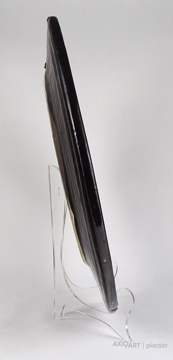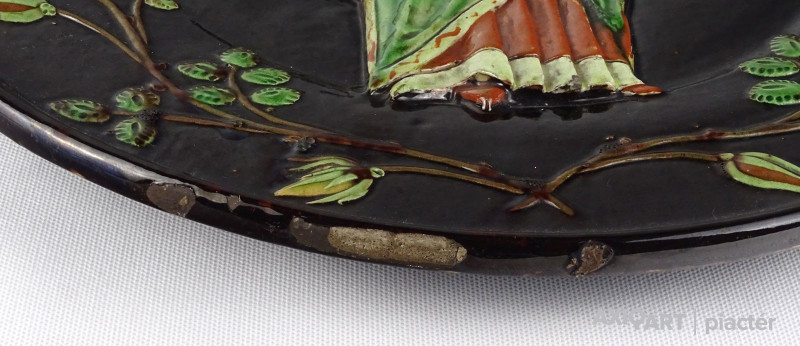 [1Q841/Z266] Gyönyörű, nagy méretű, plasztikusan díszített cserép falitál a XIX.-XX. század fordulójáról. "Gyárilag" kialakított akasztási lehetőséggel rendelkezik. Körben indás, rózsa minta fut kőrbe. Közepén nagy méretű Mária ábrázolás, kezében Árpád-házi Szent Erzsébet-plébániatemplom. Feltehetően a templom avatásának alkalmából készült gyönyörű, ritka és gyűjtői darab! Jelzetlen Steindl tétel. Szélesség: 42 cm Súly: 3.205 kg