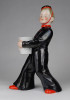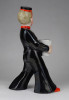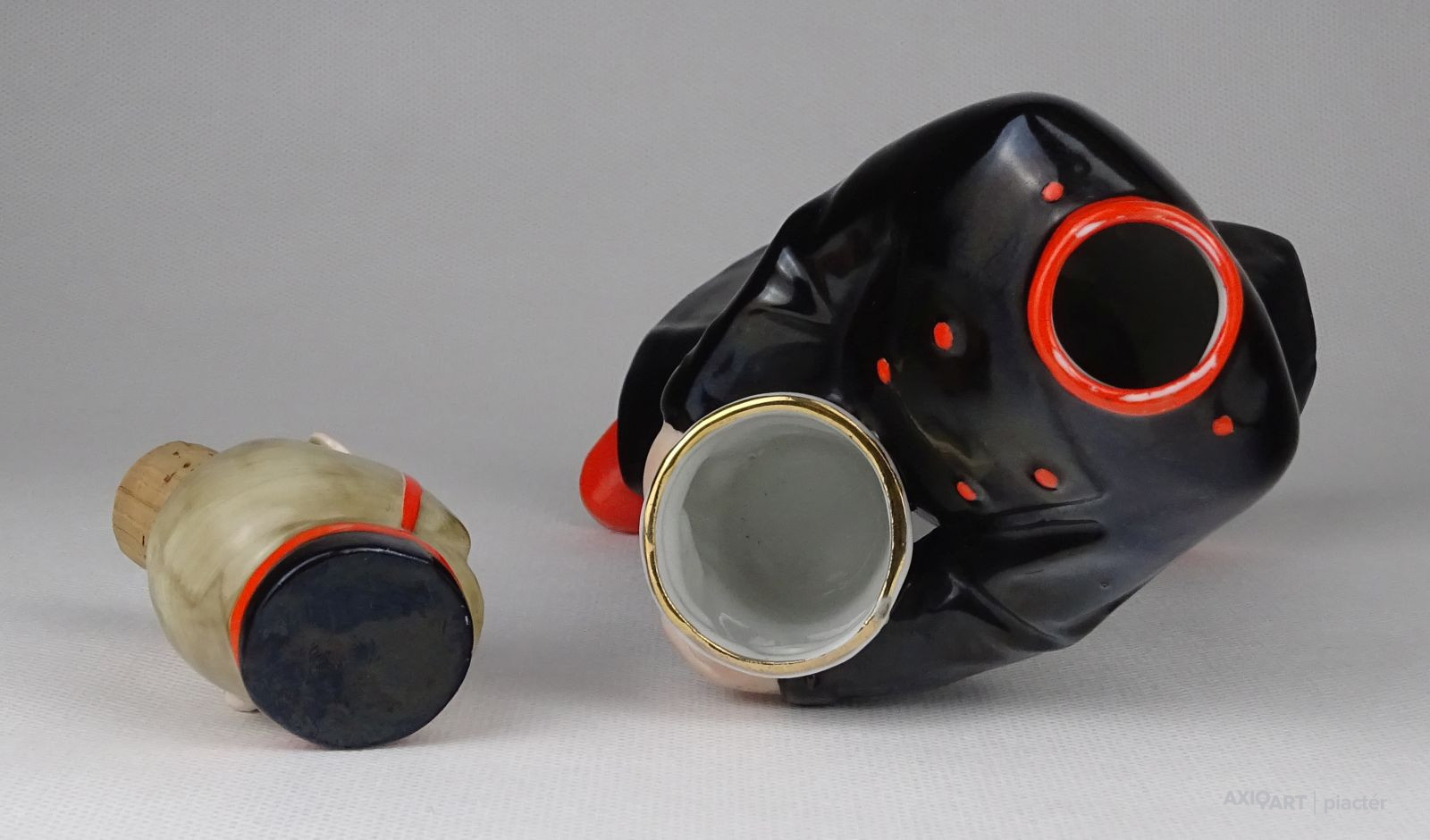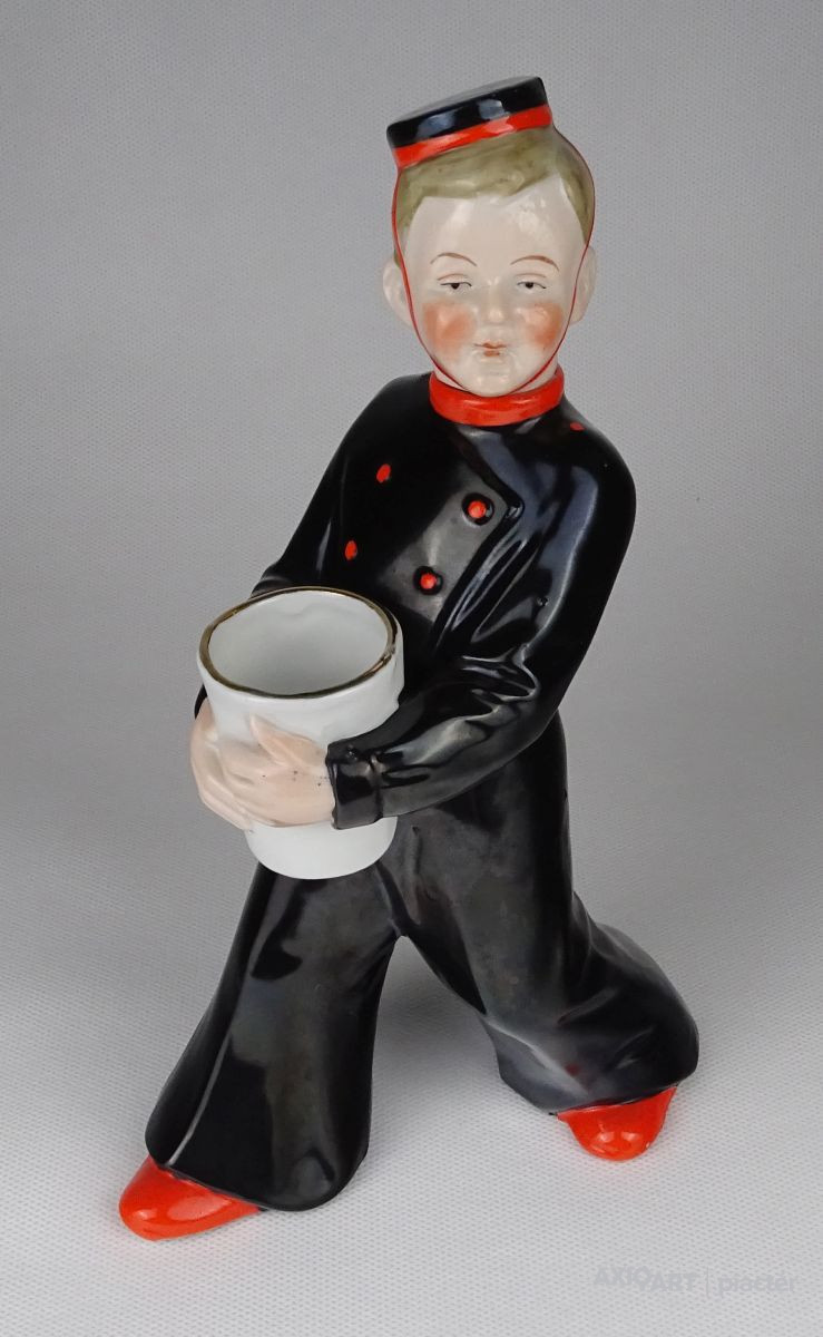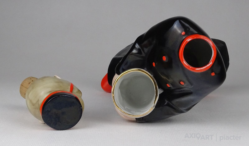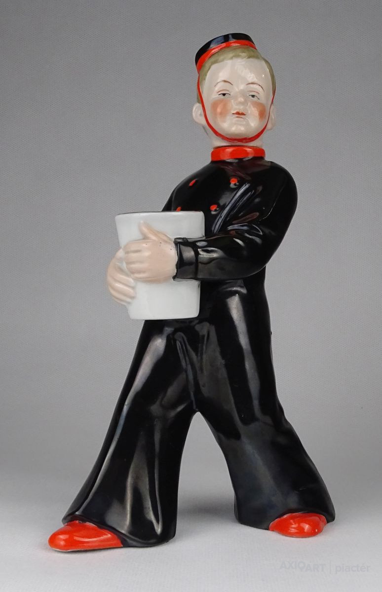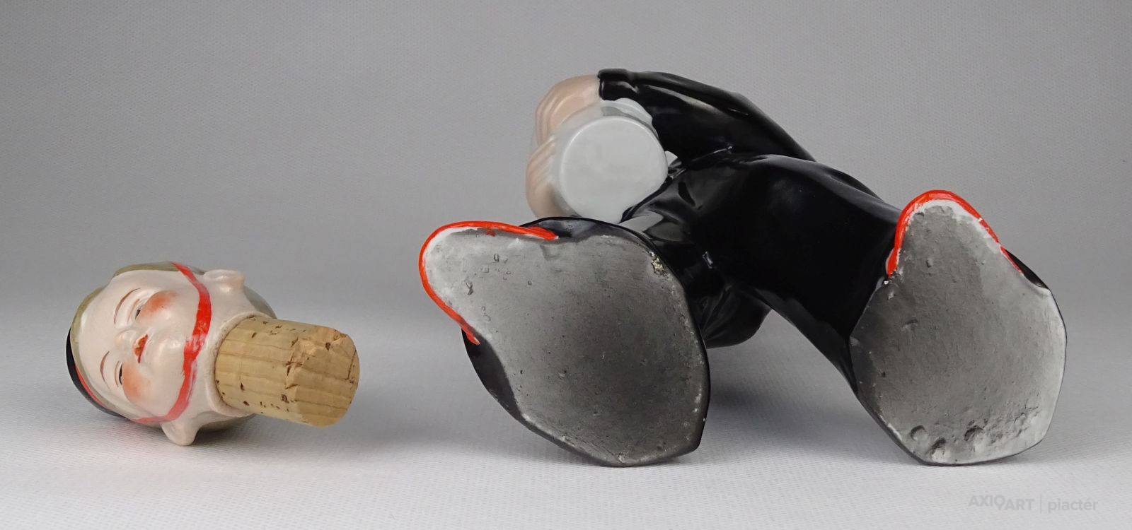 Régi, hibátlan állapotú, fekete mázas narancs cipős porcelán figura. Kivehető fejű porcelán palack, ital felszolgáló fiú.