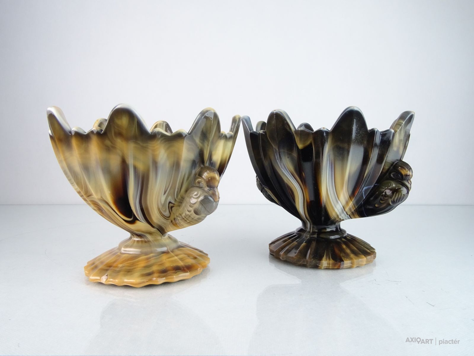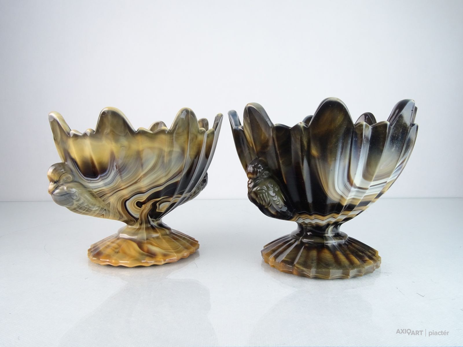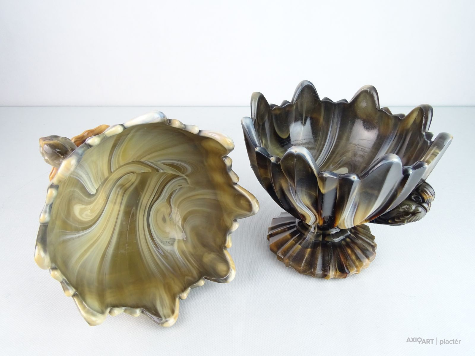 Antik, szép állapotú, talpon álló, márványszerű folyatott mintával díszített, két oldalán madaras kehely alakú asztali kínáló. STS ABEL üveg kínáló az 1930-as évekből.