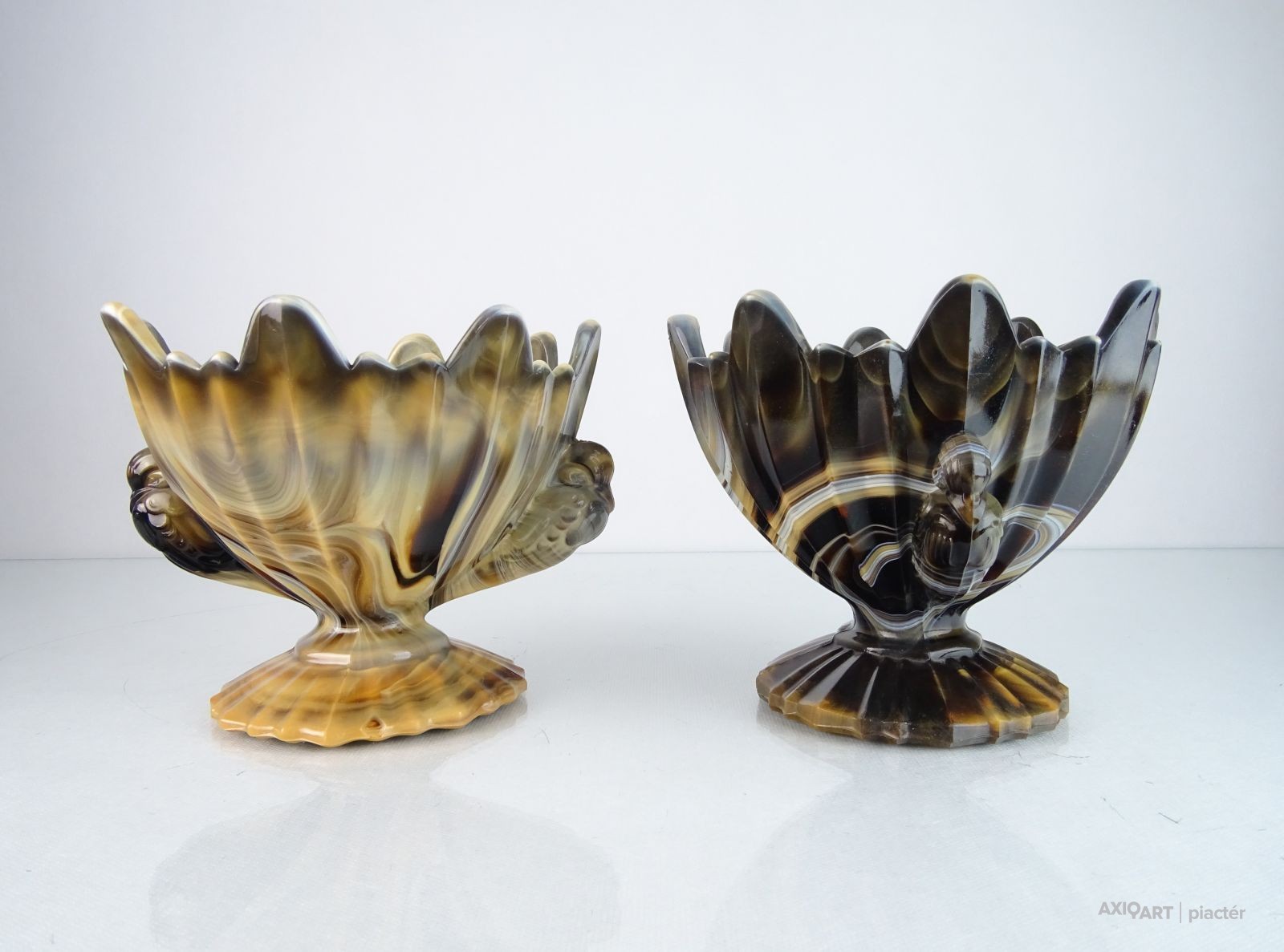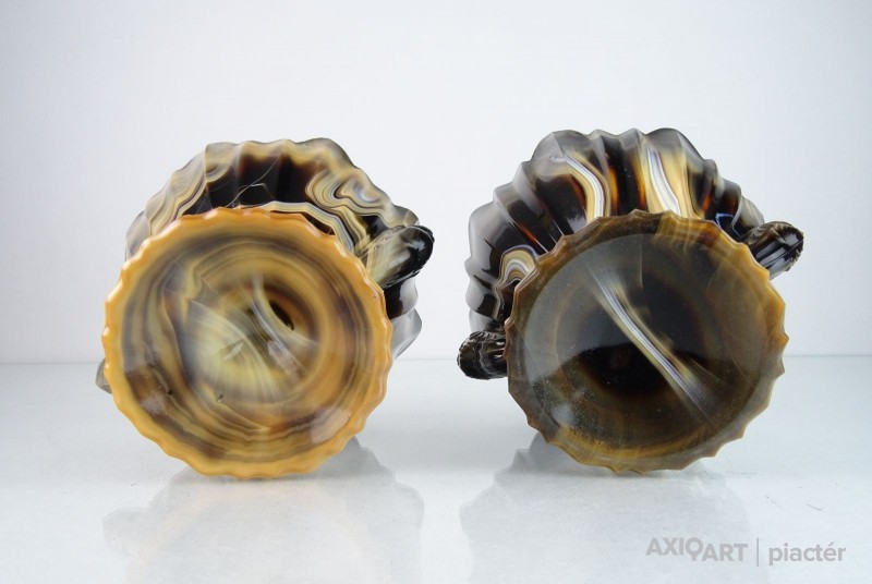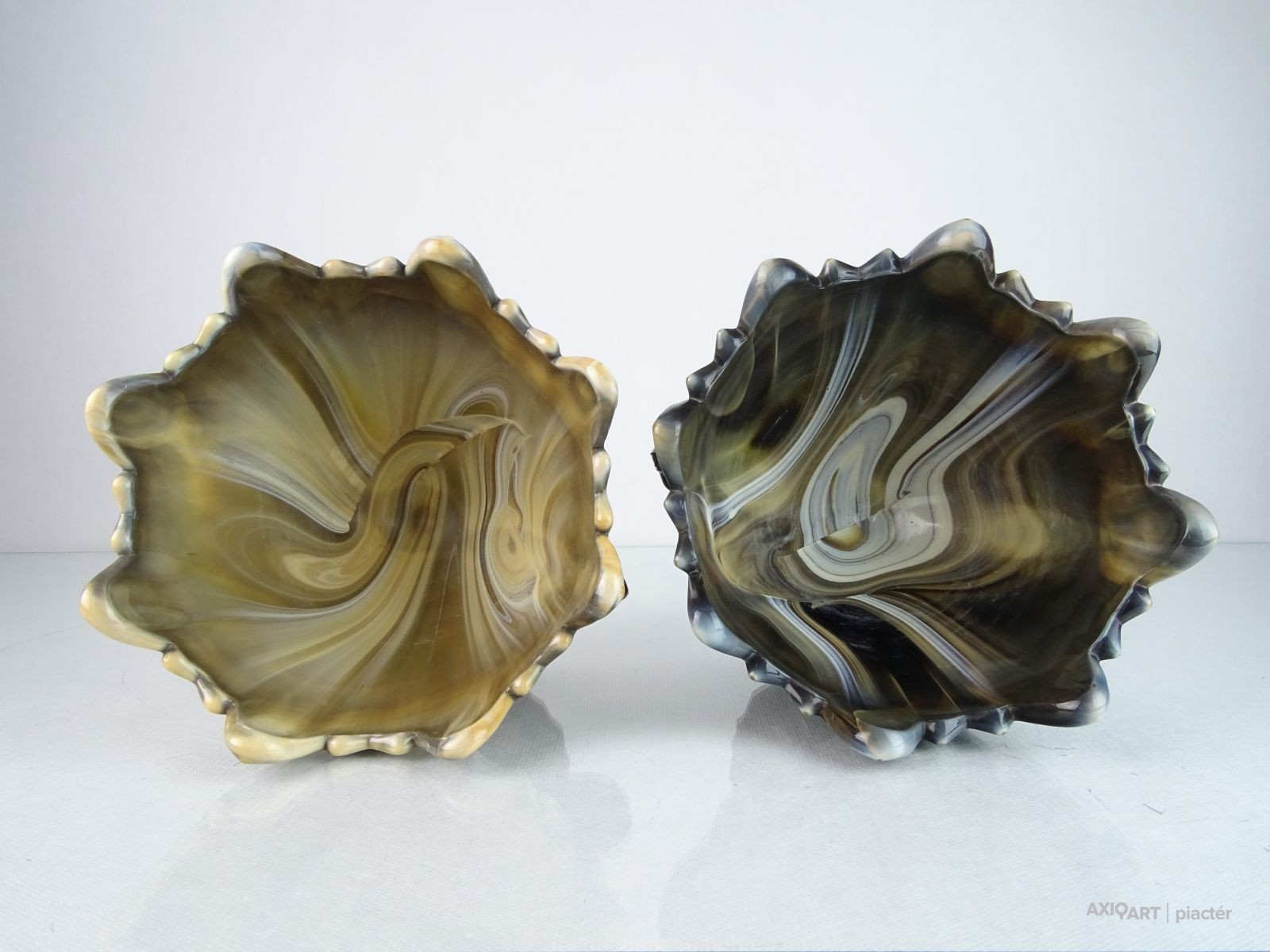 Antik, szép állapotú, talpon álló, márványszerű folyatott mintával díszített, két oldalán madaras kehely alakú asztali kínáló. STS ABEL üveg kínáló az 1930-as évekből.