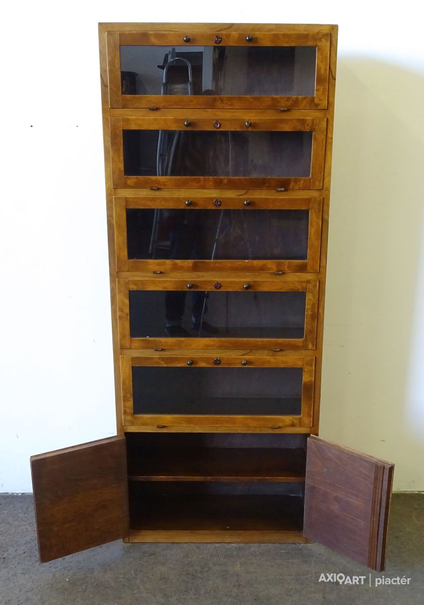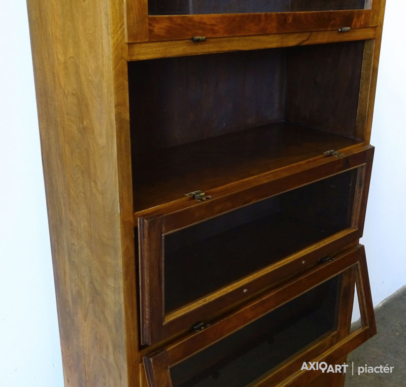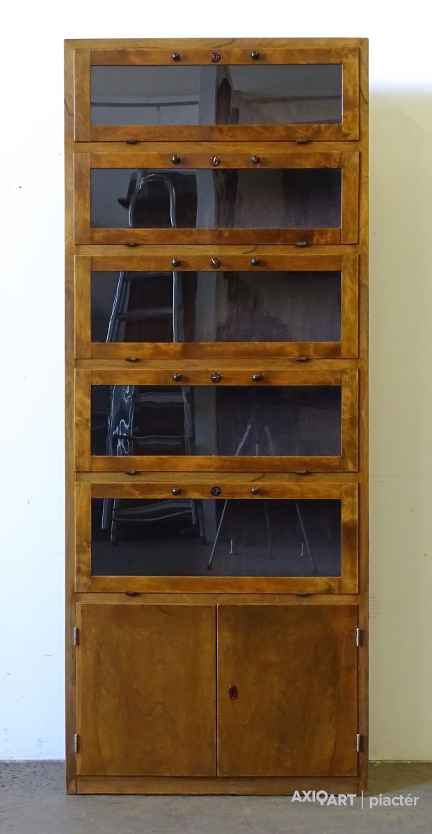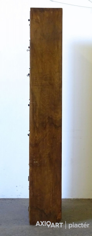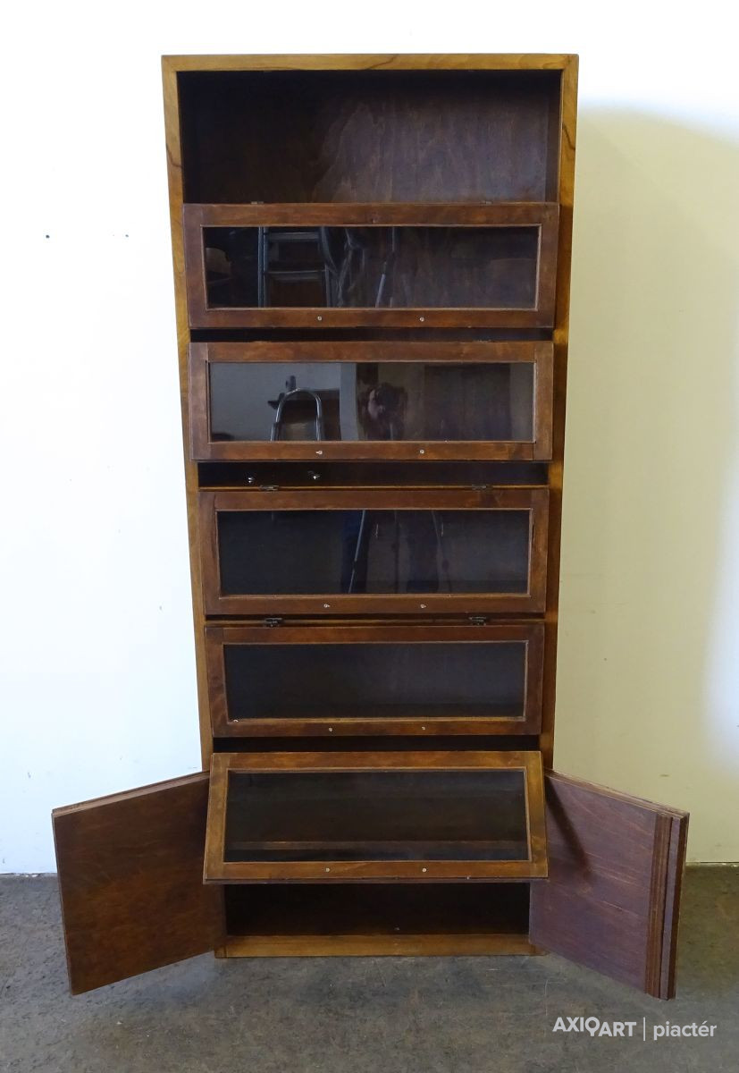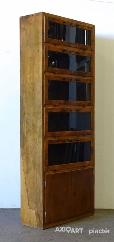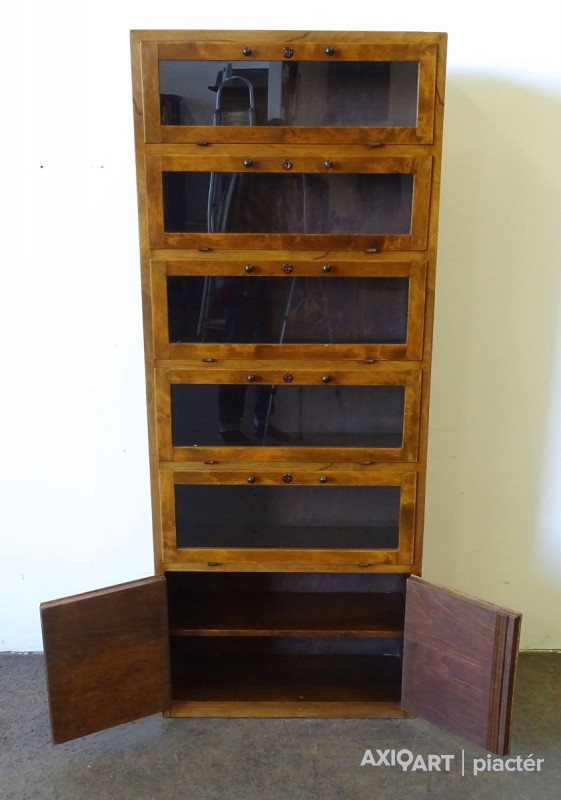 Ritkán előforduló minimalista dizájnt követő art deco üveges szekrény, vitrin. Folyosói vagy szertári bemutató vitrin. Alsó részében két ajtó mögött egy darab polc található. Felette zárral rendelkező, lefelé nyíló üveges ajtók találhatók. Egy üveg minimálisan sérült, lásd fotó.