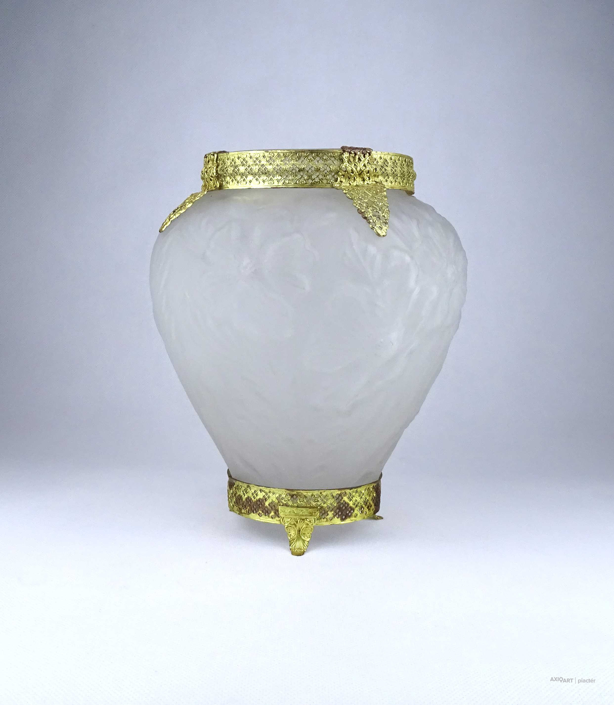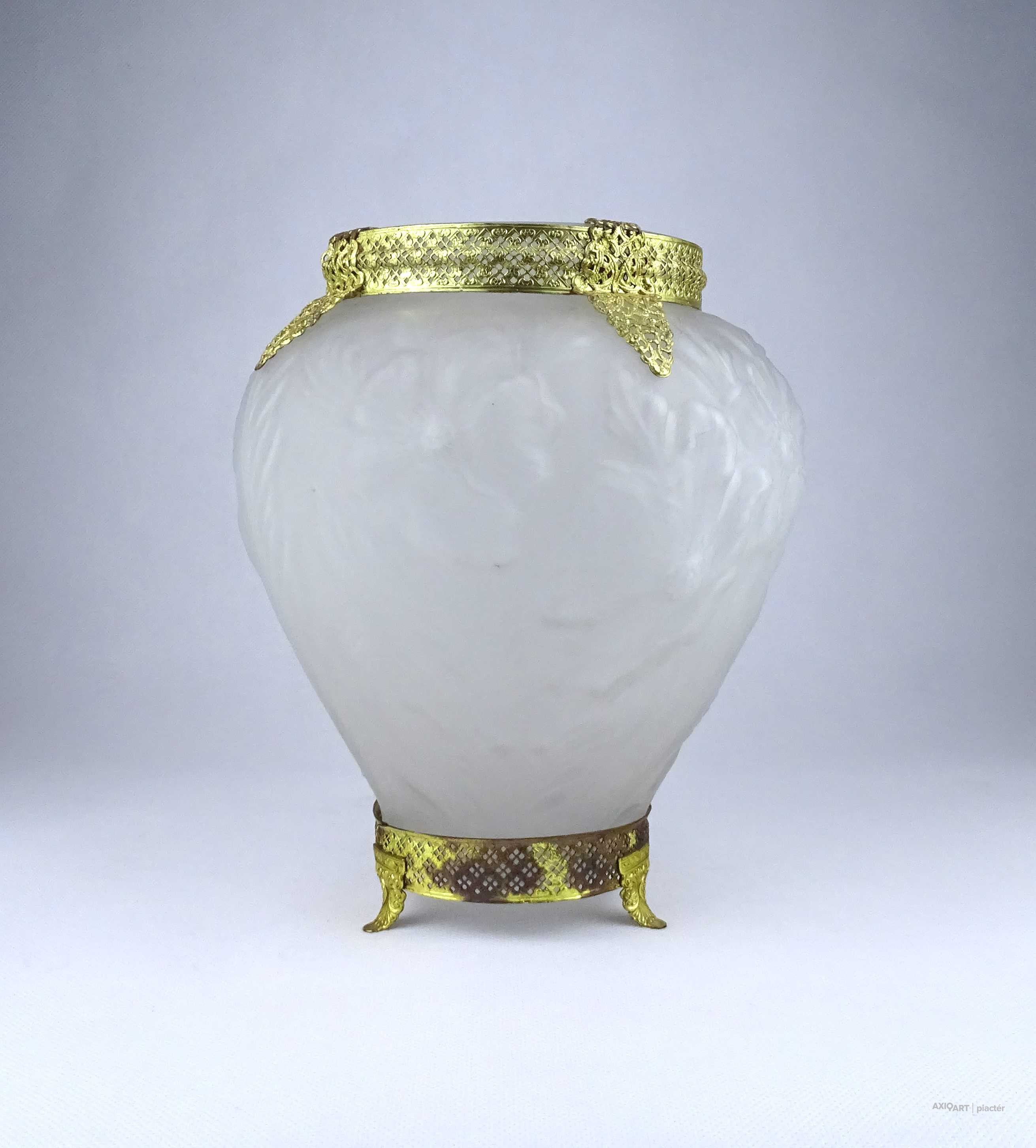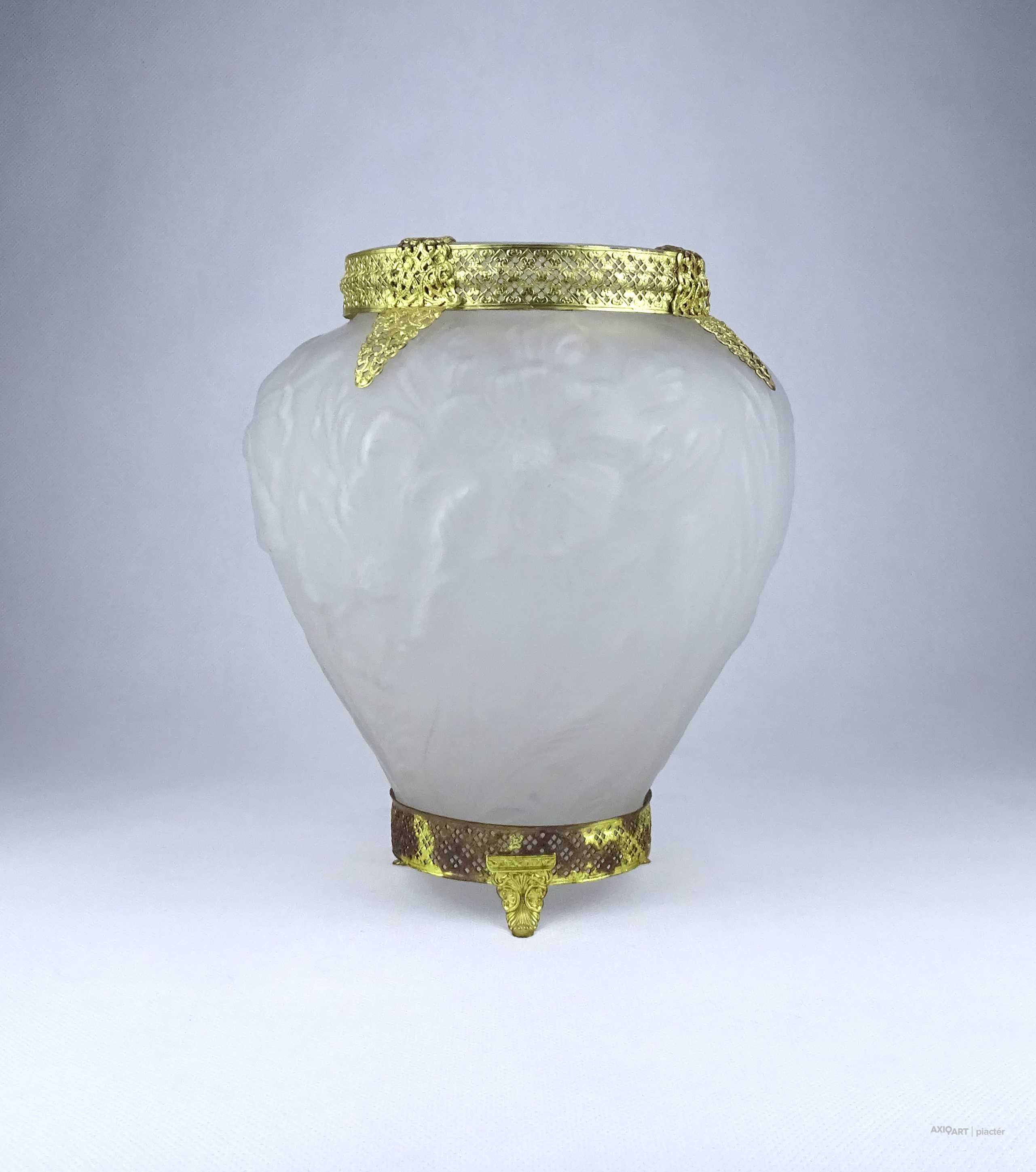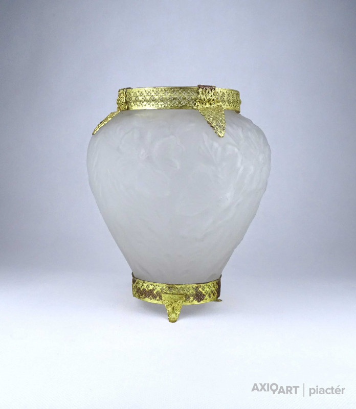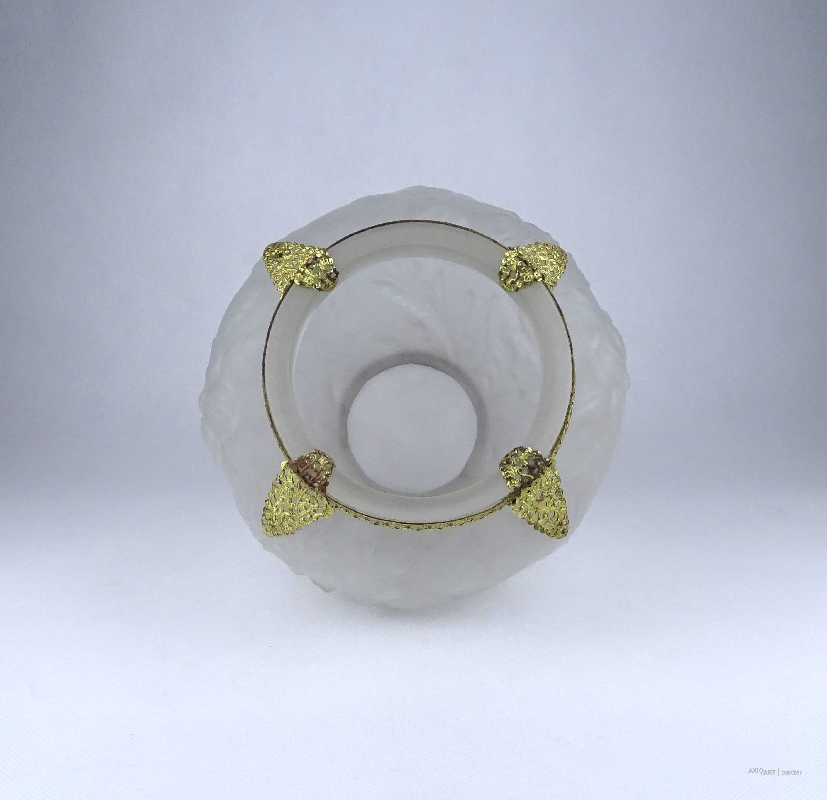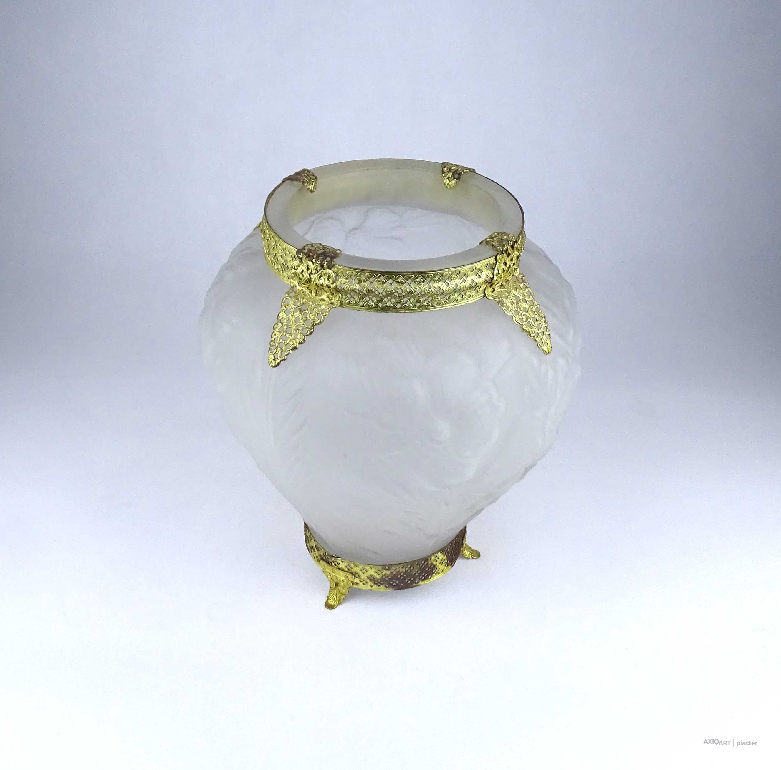 [1Z904/X304] Antik, szép állapotú, az 1930-as években készült art deco Tiffin Co. Poppy Line vastag falú, formába préselt, domború felületű virágmintás opál üveg váza, virágváza. „Ormolu” arany-filigrán díszítéssel. A talpán található fémpánt aranyozása sérült, kopott. Magasság: 24 cm Szélesség: 20 cm Súly: 1.575 kg