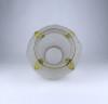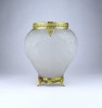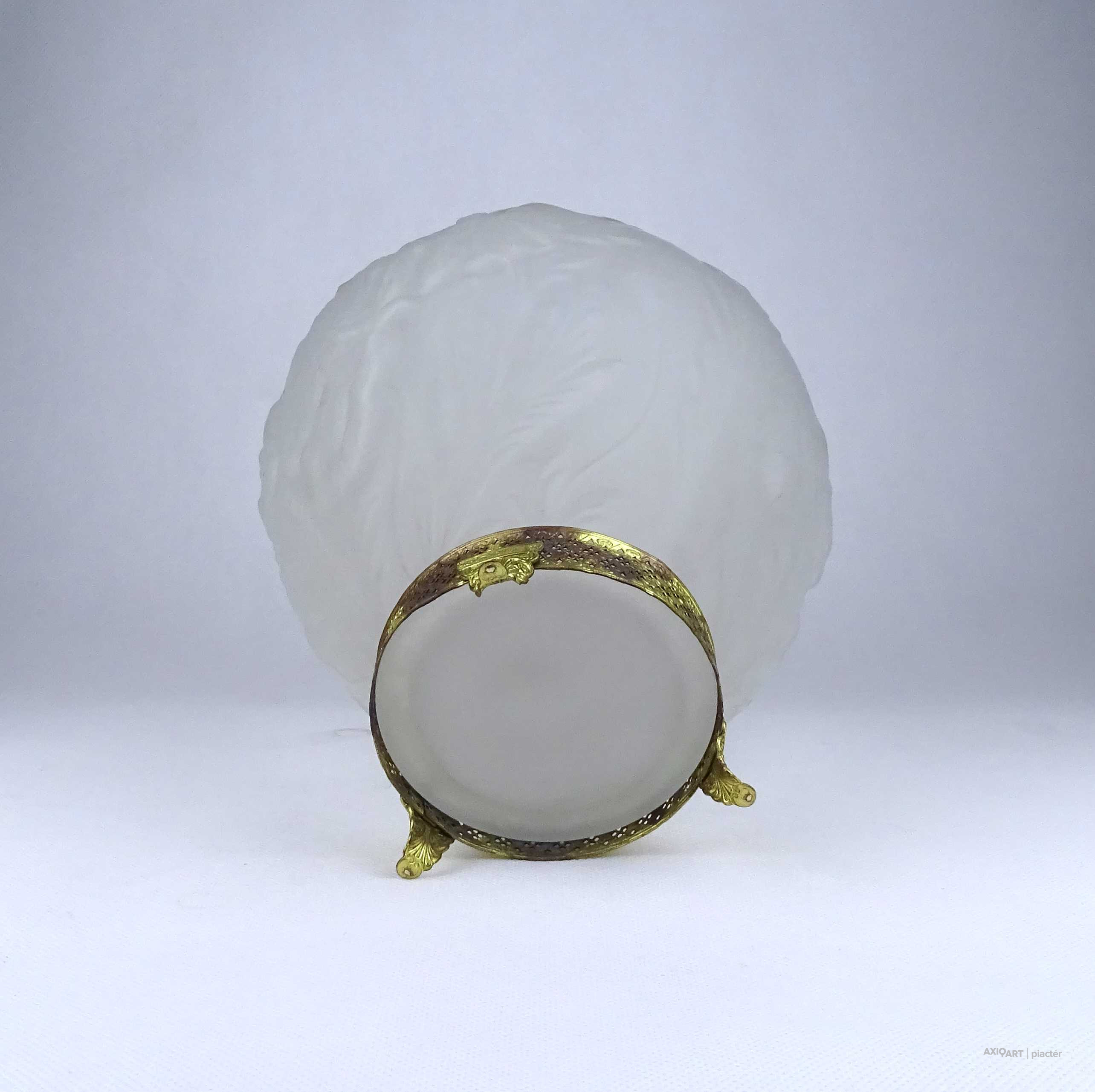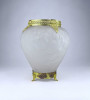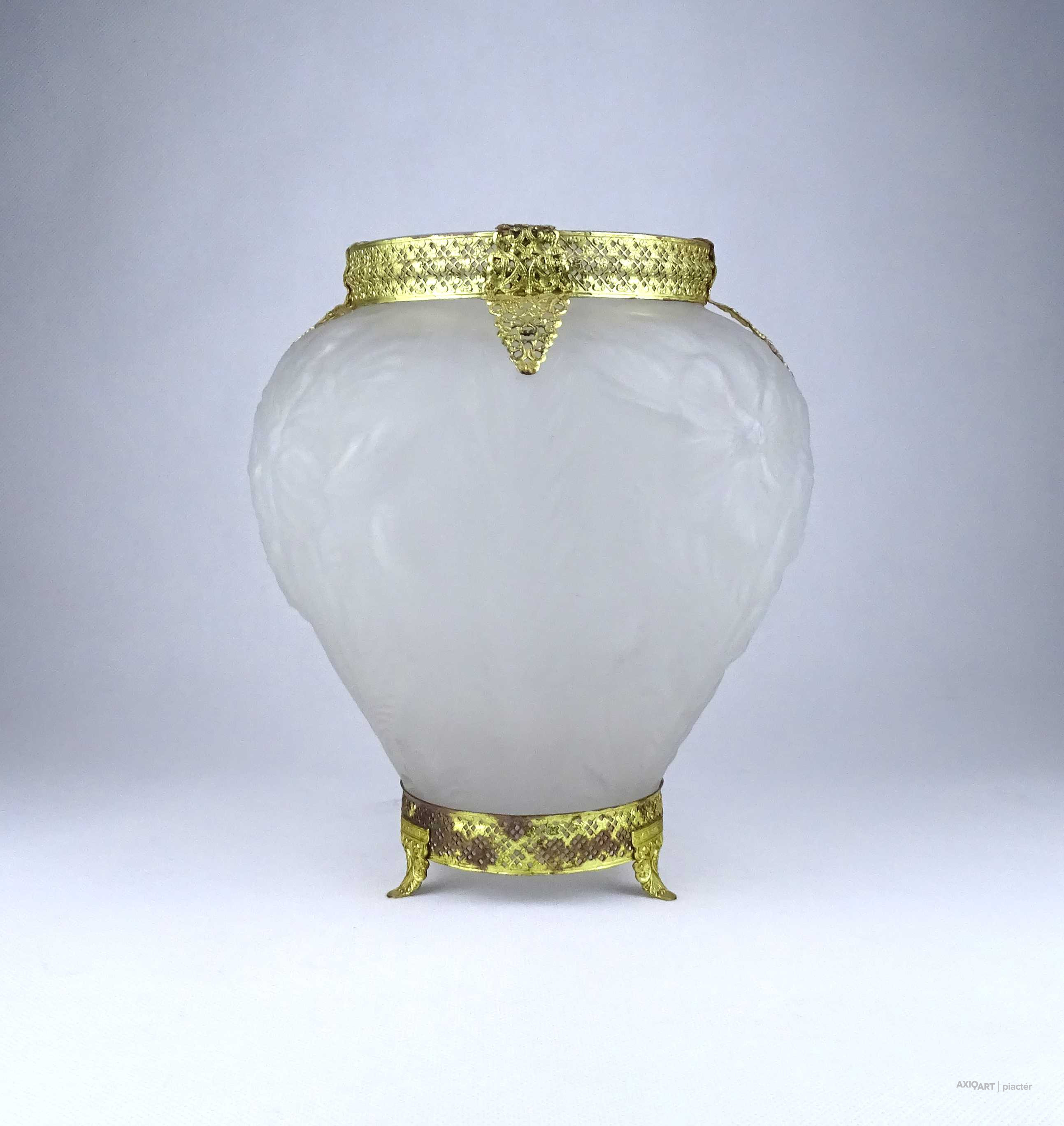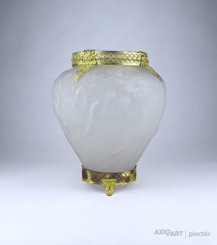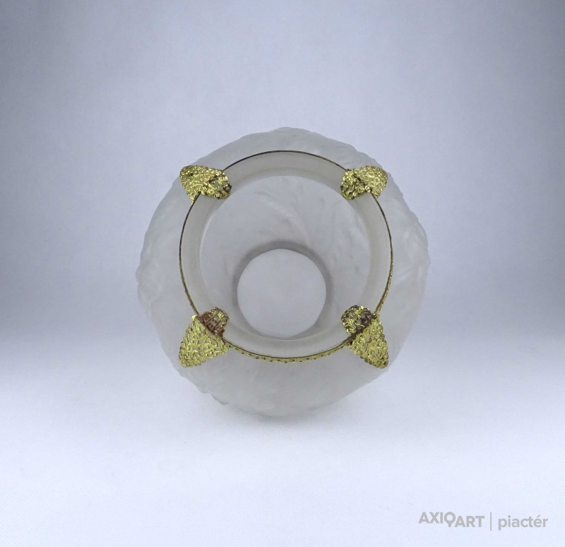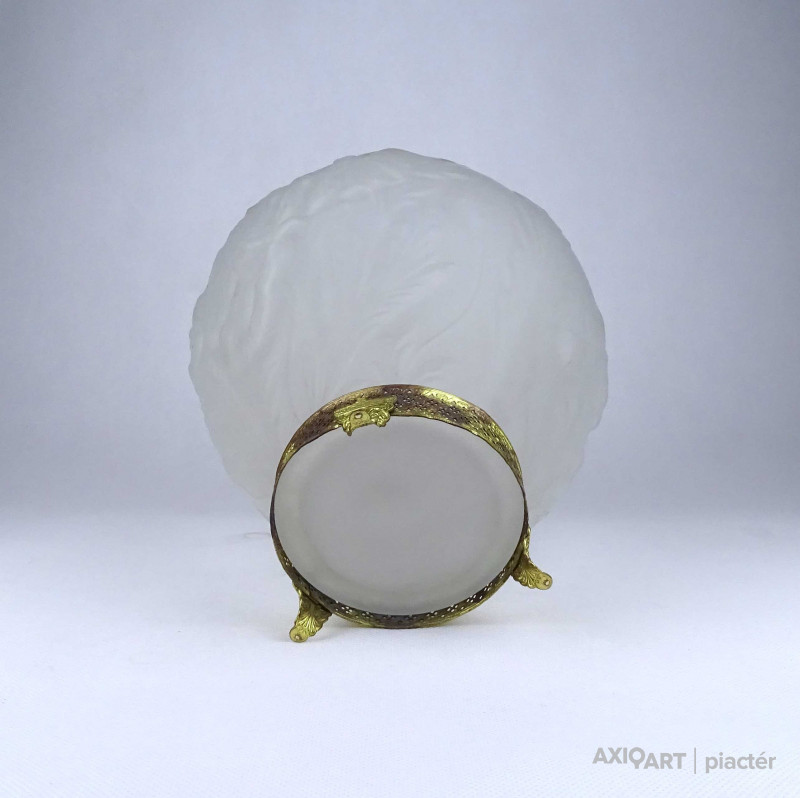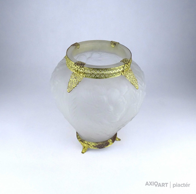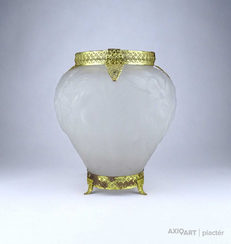 [1Z904/X304] Antik, szép állapotú, az 1930-as években készült art deco Tiffin Co. Poppy Line vastag falú, formába préselt, domború felületű virágmintás opál üveg váza, virágváza. „Ormolu” arany-filigrán díszítéssel. A talpán található fémpánt aranyozása sérült, kopott. Magasság: 24 cm Szélesség: 20 cm Súly: 1.575 kg