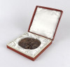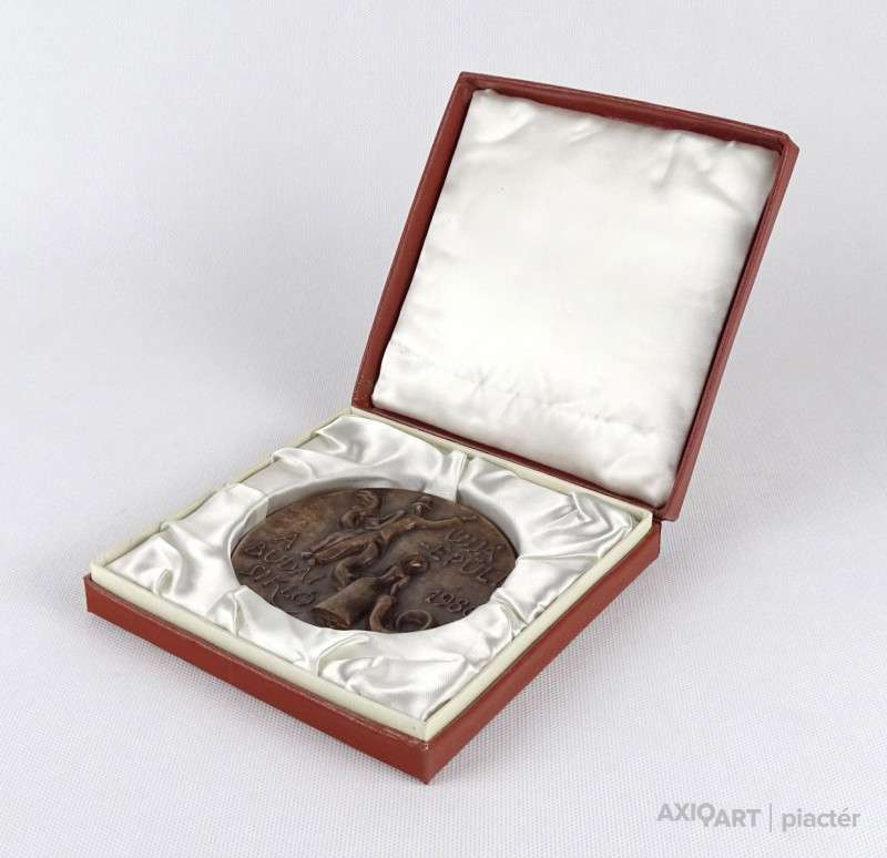 [1I390/X026] Hibátlan állapotú, jelzett bronz plakett szép bőrdíszműves bőr tokban. Elején plasztikus virágdíszítés mellett jelzés: KL Hátoldalán felirat: A KISZ. KIVÁLÓ PROPAGANDISTÁJA Súly: 0.485 kg Kutas László szobrász Budapest, 1936-04-17 Szerző: Matits Ferenc Gimnazistaként Sopronban Ágoston Ernő szabadiskolájában sajátította el a rajzművészet alapismereteit, majd 1954 és 1960 között a Magyar Képzőművészeti Főiskolára járt, ahol Gyenes Tamás és Pátzay Pál voltak a mesterei. Érzékletes mintázás, jó formaérzék, szellemes komponálás, választékos anyaghasználat tünteti ki plasztikai működését. A realista hagyományokra épülő, egyéni stílusát tükröző kő és bronz köztéri szobrokon kívül narratív kisplasztikákat, érmeket készít. A Magyar Nemzeti Bank pályázatain 11 alkalommal nyert emlékpénz készítésére megbízást. A firenzei Giorgio Vasari Nemzetközi emlékérem pályázaton 1974-ben I. díjat kapott, a Sportérem pályázaton 1975-ben II. és III. díjat, az Ezüstgerely pályázaton 1976-ban különdíjat érdemelt ki. 1979-ben a ravennai Dante Biennálé ezüst érmét, 1991-ben és 1995-ben pedig a soproni Országos Éremművészeti Biennálén Roisz Vilmos-díjat nyert. 1990 óta zsűritag a Ravennai Kisplasztikai Dante Biennálén. Figurális kisplasztikái egy-egy történetet mesélnek el. Az alakok kifejező megmintázása, környezetbe helyezése, dinamikus megfogalmazása elgondolkodásra késztetnek. Alkotásai népszerűek a hazai, valamint külföldi gyűjtők körében és szereztek a művésznek világhírnevet. Irodalom (kat. bev., Országos Széchenyi Könyvtár Galéria, 1994) ESZES A.: Otthon útközben. Műteremlátogatás ~nál, Anna, 1994/7. KOVÁCS P.: A tegnap szobrai, Szombathely, 1992 VEKERDY T.: ~ és szobrai, Várhely, 1997/3. Film BAYER I.: Művészportré, Civil Kurázsi Műsor, MTV, 1994-5. Egyéni kiállítások Egyéni kiállítások 1976 • Festőterem, Sopron • Haydn Művelődési Ház, Fertőd 1983 • Bank für Gemeinwirtschaft, Regensburg • Haydn Művelődési Ház, Fertőd • Munkás Művelődési Központ, Paks 1990 • Galerie Meerbusch, Düsseldorf 1993 • Városi Kórház Galéria, Grevenbroich (D) • Galerie Greve, Hamburg 1996 • G. P. Breughel, Venlo (gyűjt.) 1998 • Galéria, Tamási. Válogatott csoportos kiállítások Válogatott csoportos kiállítások Őszi Tárlatoknak és 1977-1999 • Országos Éremművészeti Biennáléknak. 1977-től vett részt a FIDEM nemzetközi kiállításain. A ravennai Dante Biennálén1975-ben, 1977-ben és 1979-ben vett részt. 1964 • Vásárhelyi Tárlatok 1954-1963, Magyar Nemzeti Galéria, Budapest 1968 • Az új Kecskeméti Művésztelep, Katona József Múzeum, Kecskemét 1970 • Kiállítás a Szakszervezetek Országos Tanácsa képzőművészeti pályázatára érkezett alkotásokból, Magyar Nemzeti Galéria, Budapest 1972 • 6. Balatoni Nyári Tárlat, Balatoni Múzeum, Keszthely 1974 • Vásárhelyi Tárlatok 1964-1973, Magyar Nemzeti Galéria, Budapest • G. Vasari nemzetközi Érembiennálé, Firenze 1976 • Balatoni Nyári Tárlat, Balatoni Múzeum, Keszthely 1979 • VI. Országos Kisplasztikai Biennálé, Pécs 1982 • Magyar mesterek, G. P. Breughel, Amszterdam 1990 • Ágoston Ernő tanítványai, Villamosipari Szakközépiskola Galéria, Sopron 1991 • Soproni Képes Céh Kiállítás, Collegium Hungaricum, Bécs • Soproni Képes Céh Kiállítás,Lajtaújfalu [Potzneusiedl] 1992 • Képes Céh Kiállítás, Lábasház, Sopron 1995 • Névjegy-érem kiállítás, OTP Galéria, Budapest 1996 • Képes Céh Kiállítás, Lábasház, Sopron. Művek közgyűjteményekben Művek közgyűjteményekben Királyi Éremtár, Stockholm Liszt Ferenc Múzeum, Sopron Városháza Gyűjteménye, Firenze Windsor Palota Gyűjteménye.  Forrás: artportal.hu