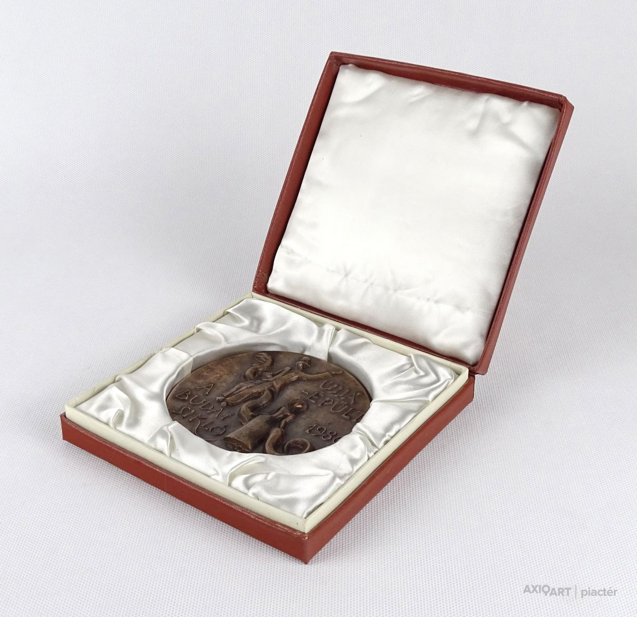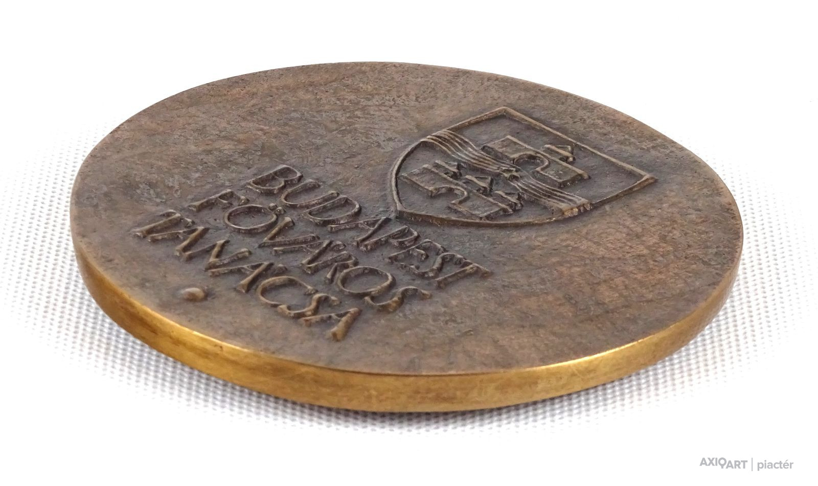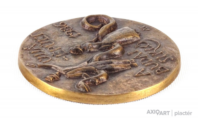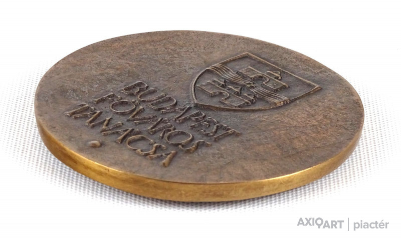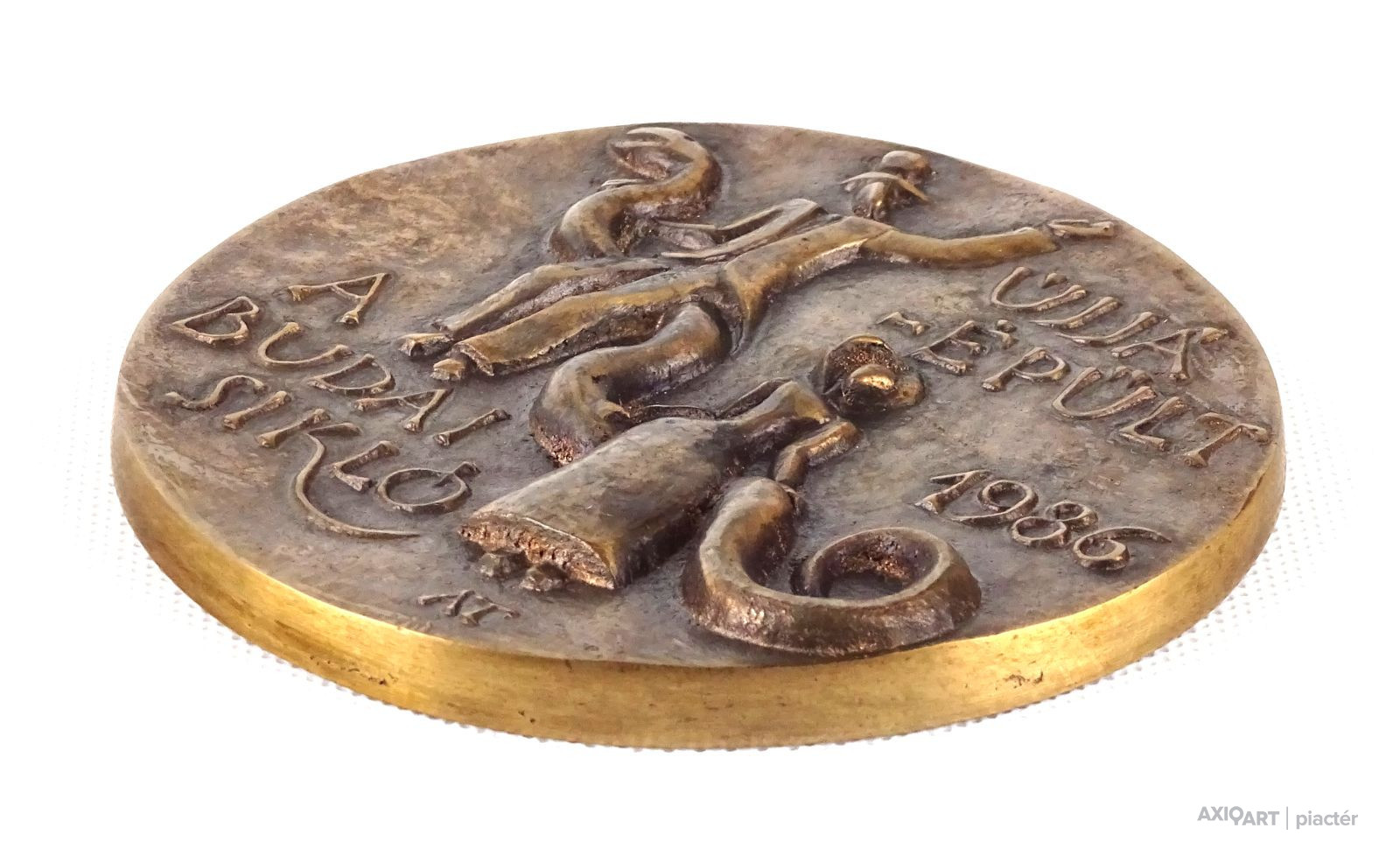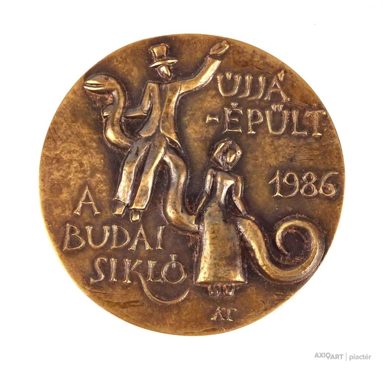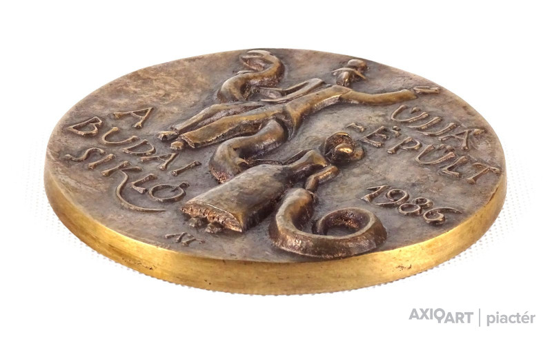 [1M301/X043] Jelzett kétoldalas bronz plakett, emlékplakett. Feliratok: ÚJJÁÉPÜLT A BUDAI SIKLÓ 1986 BUDAPEST FŐVÁROS TANÁCSA Rajta jelzés: AT Súly: 0.68 kg Asszonyi Tamás szobrász Pécs, 1942-08-30 Szerző: P. Szabó Ernő +kieg. Kövi Gyula 1956-1960: Képző- és Iparművészeti Gimnázium; mestere: Martsa István; 1960-1965: Magyar Képzőművészeti Főiskola; mesterei: Szabó Iván, Pátzay Pál, Martsa István. 1966-tól kiállító művész. Érmeket első alkalommal 1968-ban állított ki, 1969 óta a szentendrei új művésztelepen él. 1981-ben Olaszországban járt ösztöndíjjal, 1985-ben Kambodzsában és Vietnamban tett tanulmányutat. 1992-től a Széchenyi Irodalmi és Művészeti Akadémia tagja. 1969: II. Országos Kisplasztikai Biennálé, II. díj; 1969: Szegedi Nyári Tárlat díja; 1970: Pest Megyei Tárlat, I. díj; 1974: Munkácsy-díj; 1976: V. Kisplasztikai Biennálé, I. díj; Debreceni Nyári Tárlat, I. díj; 1978: III. Indiai Triennálé, Újdelhi, a zsűri különdíja; 1981: érdemes művész; 1989: kiváló művész; 1995: Magyar Művészetért díj. Indulásának első munkái főként a magyar szobrászat Ferenczy Béni-Borsos Miklós nevével fémjelzett vonulatához kötődtek, majd Vigh Tamás és Kiss Nagy András újító törekvéseiből merített bátorítást a továbblépéshez. Az éremművészet magyarországi megújulásának egyik legkövetkezetesebb képviselőjeként, az érem plasztikai értékeinek tudatos kutatójaként indult a hatvanas évek második felében, jelentősen hozzájárulva a magyar szobrászat egészének megújulásához is. A 70-es évek közepén készített ironikus-önironikus műveivel, a többi között az 1976-os Éremépítő szekrénnyel a műfaj kliséinek, kiürült szimbólumainak elvetése, erőteljes, egyéni megoldások alkalmazása, a műfaj törvényszerűségeinek érvényesítése mellett érvel – közvetve a megbízó felelősségét, a vizuális kultúra színvonalát is felvetve, illetve bírálva, a művészet és az etika szoros kapcsolatát hangsúlyozva. Későbbi periódusainak egyre letisztultabb, a szentendrei építészeti-műemléki környezetből is táplálkozó, de azzal csak közvetett kapcsolatban lévő formavilága a pálya első szakaszának következetes folytatásaként-kiteljesítéseként tekinthető; alakulásában a játékosság, a humor iránti igény érvényesülése mindvégig fontos szerepet játszott. A munkássága kezdetén felbukkant, antik torzókra emlékeztető motívum tovább él a nyolcvanas-kilencvenes évek alkotásaiban is, átalakulásai-torzulásai a művészi eszmények és a valóság konfliktusainak tudatos vállalására utalnak. Az érmészet mellett kisplasztikákat, köztéri műveket is készít. Irodalom CIFKA P.: ~ kiállításáról, Művészet, 1970/11. LOSONCI M.: Jávor Piroska és ~ ráckevei kiállítása, Művészet, 1972/10-11.  ~sal, Művészet, 1977/9. BOLGÁR K.: ~ kiállítása (kat., bev. tan., Magyar Nemzeti Galéria, 1978) WESSELY A.: ~, Budapest, 1982 KOVÁCS P.: A tegnap szobrai, Szombathely, 1992. Egyéni kiállítások Egyéni kiállítások 1972 • Helikon Galéria, Budapest • Árpád Múzeum [Jávor Piroskával], Ráckeve • Szentendrei érmészek [Csíkszentmihályi Róberttel és Ligeti Erikával], Debrecen Szentendrei érmészek [Csíkszentmihályi Róberttel és Ligeti Erikával], Eger 1974 • Szentendrei érmészek [Csíkszentmihályi Róberttel és Ligeti Erikával] 1979 • Mini Galéria [Jávor Piroskával], Miskolc 1981 • Babits Múzeum Művelődési Központ, Szekszárd 1983 • Magyar Kultúra Háza [Jávor Piroskával], Berlin • Műhely Galéria [Jávor Piroskával], Szentendre 1987 • Szentendrei érmészek [Csíkszentmihályi Róberttel, Ligeti Erikával és Jávor Piroskával] Válogatott csoportos kiállítások Válogatott csoportos kiállítások 1967, 1969, 1971, 1976, 1981 • Pécsi Kisplasztikai Biennálé 1971 • Magyar rajzok és kisbronzok, Nápoly 1973 • XV. Fidem, Helsinki 1975 • III. Nemzetközi Kisplasztikai Biennálé, Műcsarnok, Budapest • XVI. Fidem, Krakkó 1977 • Magyar festészeti és numizmatikai kiállítás, Havanna • 14. Middelheimi Biennálé, Antwerpen • XI. Nemzetközi Kisplasztikai Biennálé, Padova • XVII. Fidem • I. Országos Érembiennálé, Sopron • Magyar Éremantológia 1945-1976, Szentendre 1978 • Az I. Országos Érembiennálé díjazottjainak kiállítása, Sopron 1979 • Modern Magyar Éremművészet, Stockholm • XVIII. Fidem, Lisszabon 1980 • Modern Magyar Éremművészet, Osló 1981 • III. Országos Érembiennálé, Sopron 1982 • Mai Magyar Éremművészet, Moszkva, Leningrád • Az emberi környezetért, Vigadó Galéria, Budapest 1983 • IV. Országos Érembiennálé, Sopron 1984 • Modern Magyar Érmek és Antiérmek, Wolverhampton, London, Oxford, Gateshead 1985 • Válogatás 40 év érmeiből, Helikon Galéria, Budapest • V. Országos Érembiennálé, Sopron • Szentendrei Érmek és Kisplasztikák, Szentendre • Magyar Éremművészet, Varsó • XXI. Fidem, Stockholm 1986 • Táblaképek és Kisplasztikák Szentendréről, Dewlmenhorst (D) • az V. Országos Érembiennálé díjazottjainak kiállítása, Sopron 1987 • XXII. Fidem, Colorado Springs 1989 • II. Nemzetközi Érem Quadriennálé 1993 • Modern Magyar Éremművészet I. 1896-1975 • IX. Országos Érembiennálé, Sopron 1995 • Helyzetkép/Magyar szobrászat, Műcsarnok, Budapest • Magyar Szalon ’97, Műcsarnok, Budapest. Művek közgyűjteményekben Művek közgyűjteményekben Helytörténeti Múzeum, Várpalota Magyar Nemzeti Galéria, Budapest Museum of American History, Washington Városi Képtár, Drezda. Forrás: artportal.hu