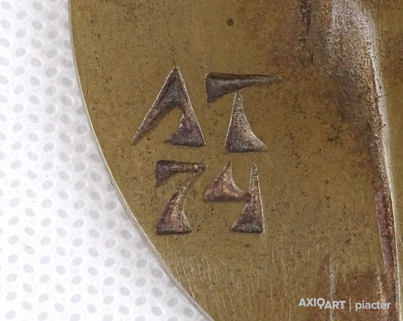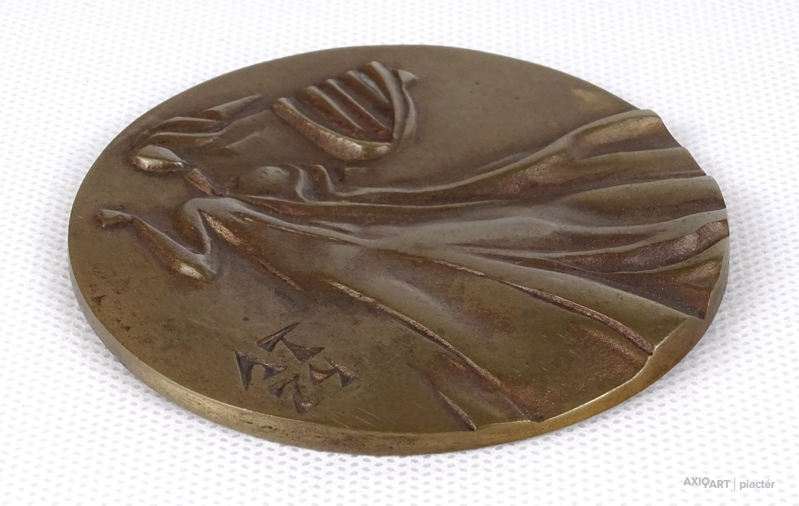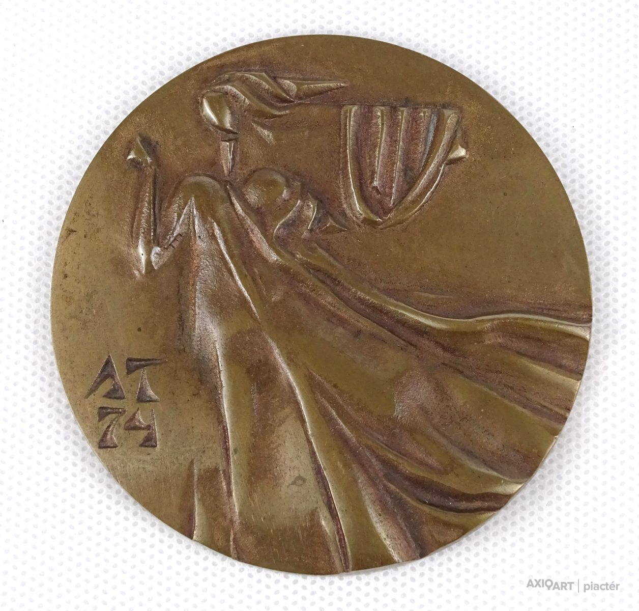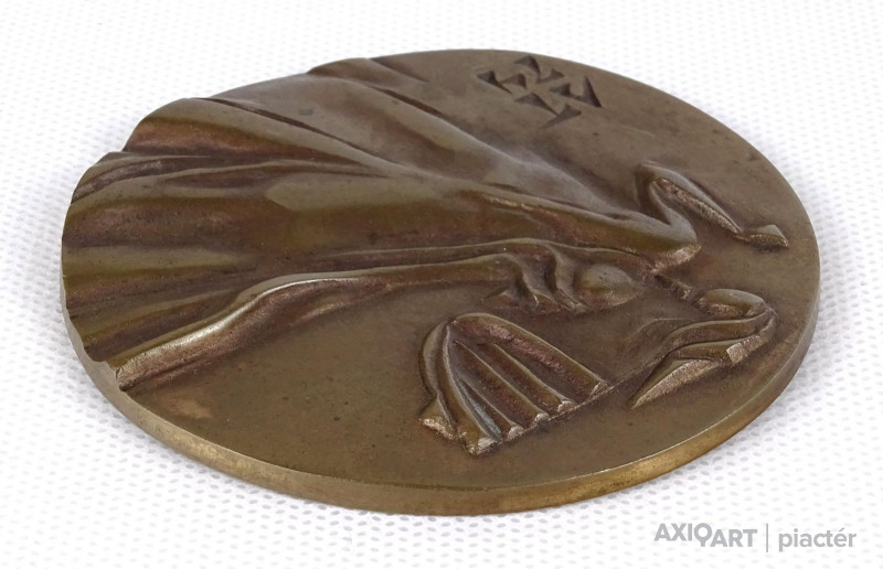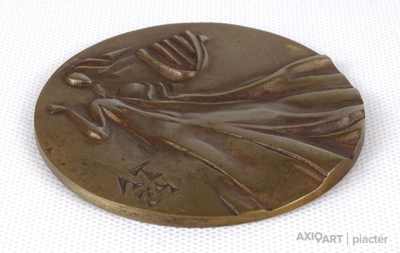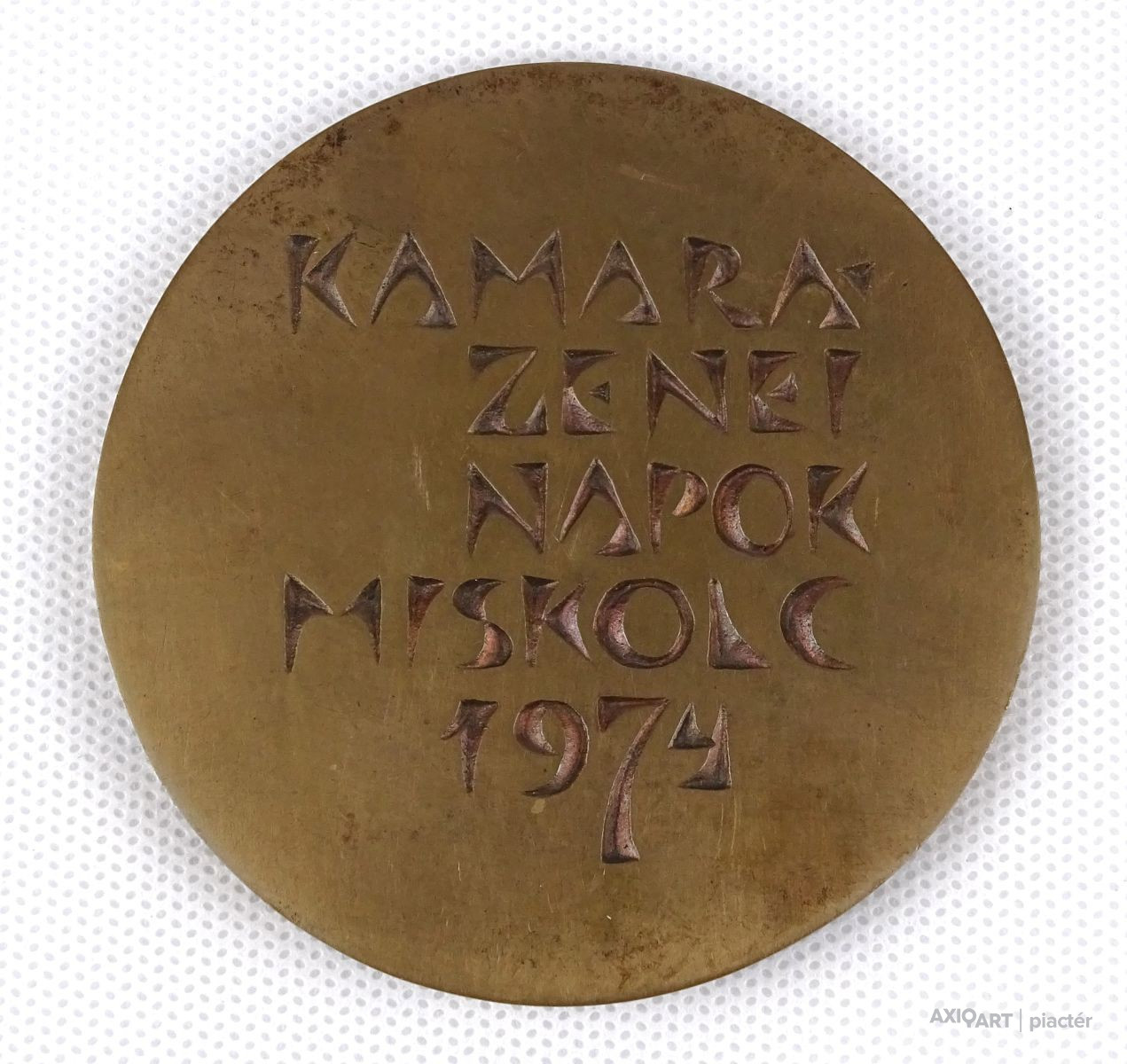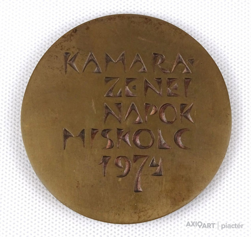 [1M112/X000] Szép állapotú kétoldalas plasztikus bronz plakett, emlék plakett. Felirat: KAMARZENEI NAPOK MISKOLC 1974 Jelzés a plaketten: AT (A.T.) Szélesség: 8 cm Súly: 0.185 kg Asszonyi Tamás szobrász Pécs, 1942-08-30 Szerző: P. Szabó Ernő +kieg. Kövi Gyula 1956-1960: Képző- és Iparművészeti Gimnázium; mestere: Martsa István; 1960-1965: Magyar Képzőművészeti Főiskola; mesterei: Szabó Iván, Pátzay Pál, Martsa István. 1966-tól kiállító művész. Érmeket első alkalommal 1968-ban állított ki, 1969 óta a szentendrei új művésztelepen él. 1981-ben Olaszországban járt ösztöndíjjal, 1985-ben Kambodzsában és Vietnamban tett tanulmányutat. 1992-től a Széchenyi Irodalmi és Művészeti Akadémia tagja. 1969: II. Országos Kisplasztikai Biennálé, II. díj; 1969: Szegedi Nyári Tárlat díja; 1970: Pest Megyei Tárlat, I. díj; 1974: Munkácsy-díj; 1976: V. Kisplasztikai Biennálé, I. díj; Debreceni Nyári Tárlat, I. díj; 1978: III. Indiai Triennálé, Újdelhi, a zsűri különdíja; 1981: érdemes művész; 1989: kiváló művész; 1995: Magyar Művészetért díj. Indulásának első munkái főként a magyar szobrászat Ferenczy Béni-Borsos Miklós nevével fémjelzett vonulatához kötődtek, majd Vigh Tamás és Kiss Nagy András újító törekvéseiből merített bátorítást a továbblépéshez. Az éremművészet magyarországi megújulásának egyik legkövetkezetesebb képviselőjeként, az érem plasztikai értékeinek tudatos kutatójaként indult a hatvanas évek második felében, jelentősen hozzájárulva a magyar szobrászat egészének megújulásához is. A 70-es évek közepén készített ironikus-önironikus műveivel, a többi között az 1976-os Éremépítő szekrénnyel a műfaj kliséinek, kiürült szimbólumainak elvetése, erőteljes, egyéni megoldások alkalmazása, a műfaj törvényszerűségeinek érvényesítése mellett érvel – közvetve a megbízó felelősségét, a vizuális kultúra színvonalát is felvetve, illetve bírálva, a művészet és az etika szoros kapcsolatát hangsúlyozva. Későbbi periódusainak egyre letisztultabb, a szentendrei építészeti-műemléki környezetből is táplálkozó, de azzal csak közvetett kapcsolatban lévő formavilága a pálya első szakaszának következetes folytatásaként-kiteljesítéseként tekinthető; alakulásában a játékosság, a humor iránti igény érvényesülése mindvégig fontos szerepet játszott. A munkássága kezdetén felbukkant, antik torzókra emlékeztető motívum tovább él a nyolcvanas-kilencvenes évek alkotásaiban is, átalakulásai-torzulásai a művészi eszmények és a valóság konfliktusainak tudatos vállalására utalnak. Az érmészet mellett kisplasztikákat, köztéri műveket is készít. Irodalom CIFKA P.: ~ kiállításáról, Művészet, 1970/11. LOSONCI M.: Jávor Piroska és ~ ráckevei kiállítása, Művészet, 1972/10-11.  ~sal, Művészet, 1977/9. BOLGÁR K.: ~ kiállítása (kat., bev. tan., Magyar Nemzeti Galéria, 1978) WESSELY A.: ~, Budapest, 1982 KOVÁCS P.: A tegnap szobrai, Szombathely, 1992. Egyéni kiállítások Egyéni kiállítások 1972 • Helikon Galéria, Budapest • Árpád Múzeum [Jávor Piroskával], Ráckeve • Szentendrei érmészek [Csíkszentmihályi Róberttel és Ligeti Erikával], Debrecen Szentendrei érmészek [Csíkszentmihályi Róberttel és Ligeti Erikával], Eger 1974 • Szentendrei érmészek [Csíkszentmihályi Róberttel és Ligeti Erikával] 1979 • Mini Galéria [Jávor Piroskával], Miskolc 1981 • Babits Múzeum Művelődési Központ, Szekszárd 1983 • Magyar Kultúra Háza [Jávor Piroskával], Berlin • Műhely Galéria [Jávor Piroskával], Szentendre 1987 • Szentendrei érmészek [Csíkszentmihályi Róberttel, Ligeti Erikával és Jávor Piroskával] Válogatott csoportos kiállítások Válogatott csoportos kiállítások 1967, 1969, 1971, 1976, 1981 • Pécsi Kisplasztikai Biennálé 1971 • Magyar rajzok és kisbronzok, Nápoly 1973 • XV. Fidem, Helsinki 1975 • III. Nemzetközi Kisplasztikai Biennálé, Műcsarnok, Budapest • XVI. Fidem, Krakkó 1977 • Magyar festészeti és numizmatikai kiállítás, Havanna • 14. Middelheimi Biennálé, Antwerpen • XI. Nemzetközi Kisplasztikai Biennálé, Padova • XVII. Fidem • I. Országos Érembiennálé, Sopron • Magyar Éremantológia 1945-1976, Szentendre 1978 • Az I. Országos Érembiennálé díjazottjainak kiállítása, Sopron 1979 • Modern Magyar Éremművészet, Stockholm • XVIII. Fidem, Lisszabon 1980 • Modern Magyar Éremművészet, Osló 1981 • III. Országos Érembiennálé, Sopron 1982 • Mai Magyar Éremművészet, Moszkva, Leningrád • Az emberi környezetért, Vigadó Galéria, Budapest 1983 • IV. Országos Érembiennálé, Sopron 1984 • Modern Magyar Érmek és Antiérmek, Wolverhampton, London, Oxford, Gateshead 1985 • Válogatás 40 év érmeiből, Helikon Galéria, Budapest • V. Országos Érembiennálé, Sopron • Szentendrei Érmek és Kisplasztikák, Szentendre • Magyar Éremművészet, Varsó • XXI. Fidem, Stockholm 1986 • Táblaképek és Kisplasztikák Szentendréről, Dewlmenhorst (D) • az V. Országos Érembiennálé díjazottjainak kiállítása, Sopron 1987 • XXII. Fidem, Colorado Springs 1989 • II. Nemzetközi Érem Quadriennálé 1993 • Modern Magyar Éremművészet I. 1896-1975 • IX. Országos Érembiennálé, Sopron 1995 • Helyzetkép/Magyar szobrászat, Műcsarnok, Budapest • Magyar Szalon ’97, Műcsarnok, Budapest. Művek közgyűjteményekben Művek közgyűjteményekben Helytörténeti Múzeum, Várpalota Magyar Nemzeti Galéria, Budapest Museum of American History, Washington Városi Képtár, Drezda. Forrás: artportal.hu