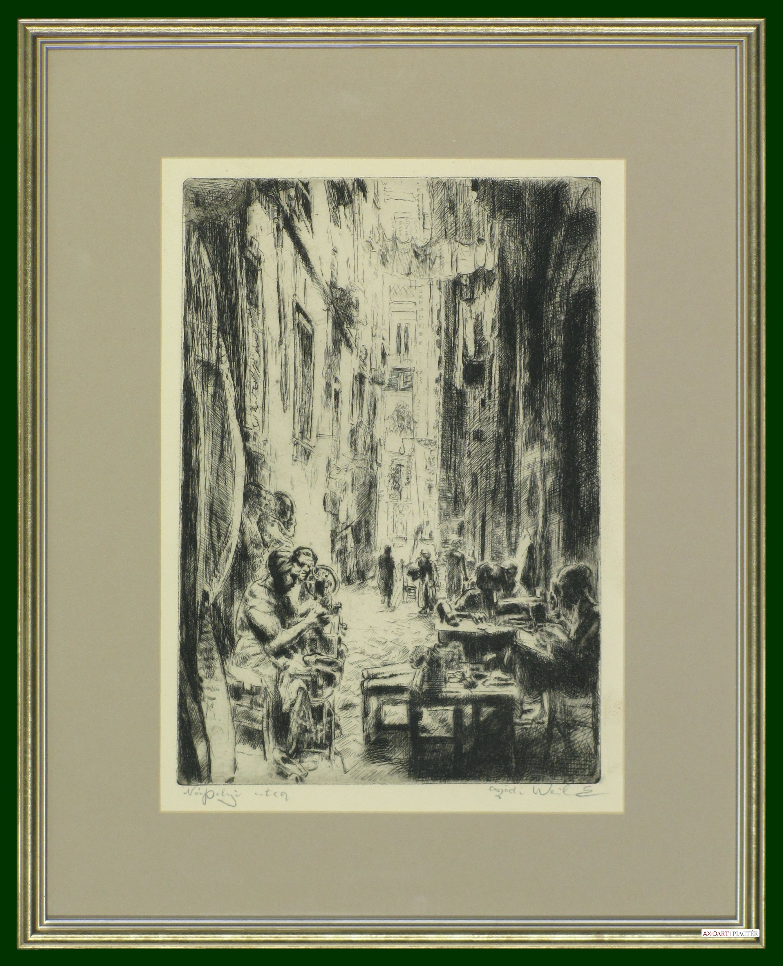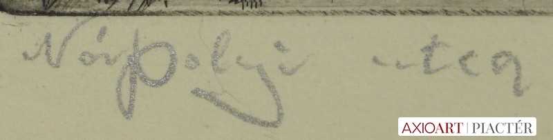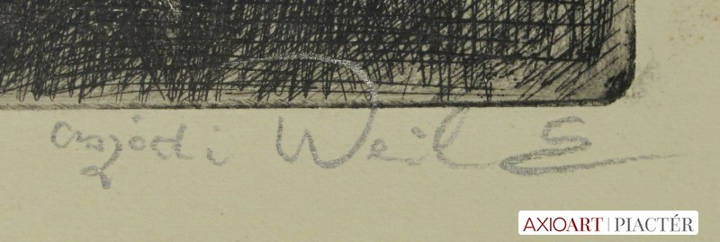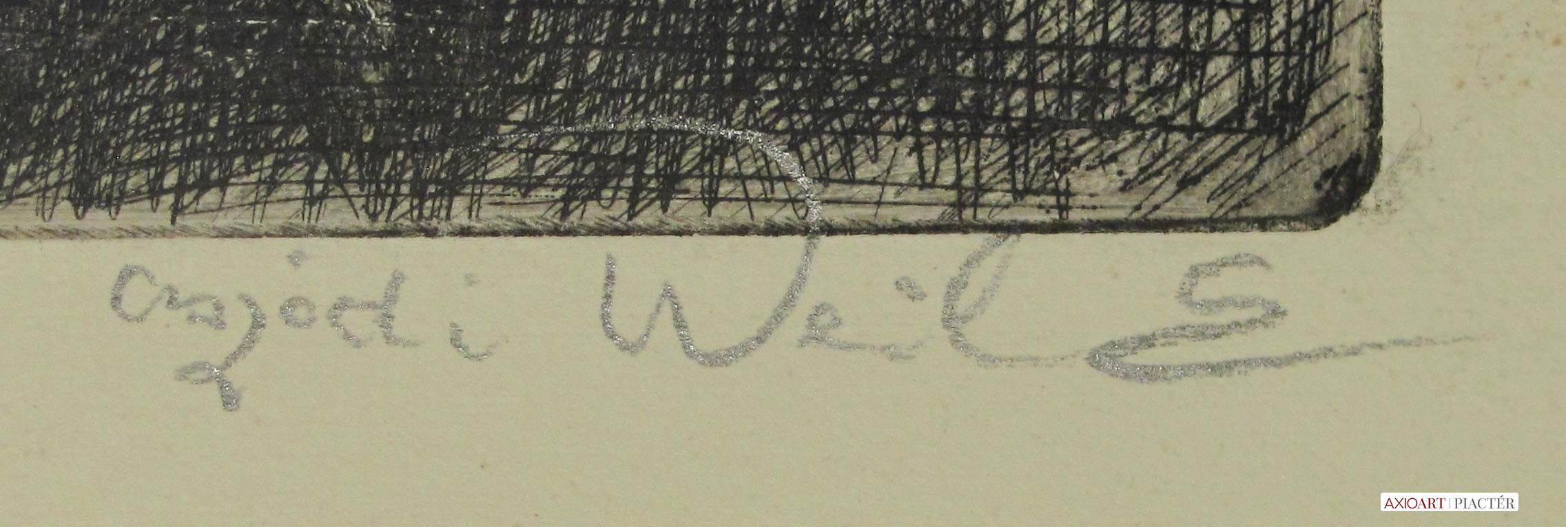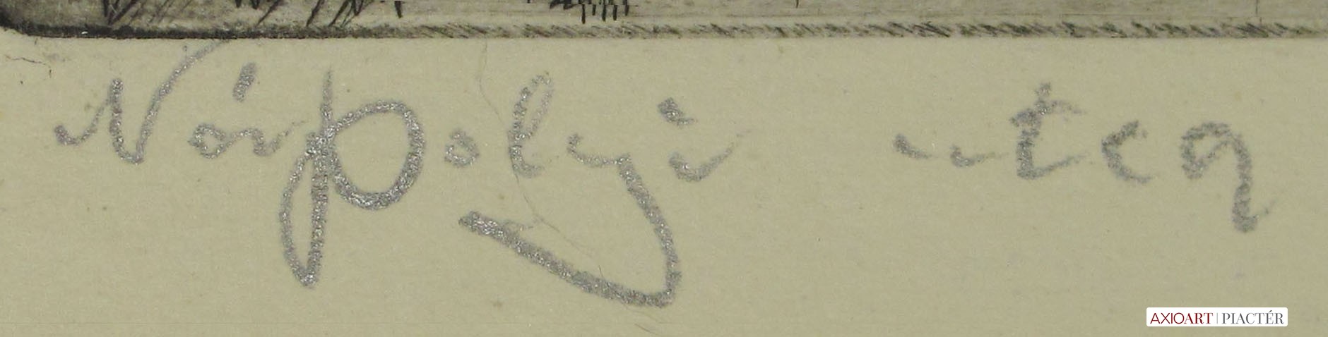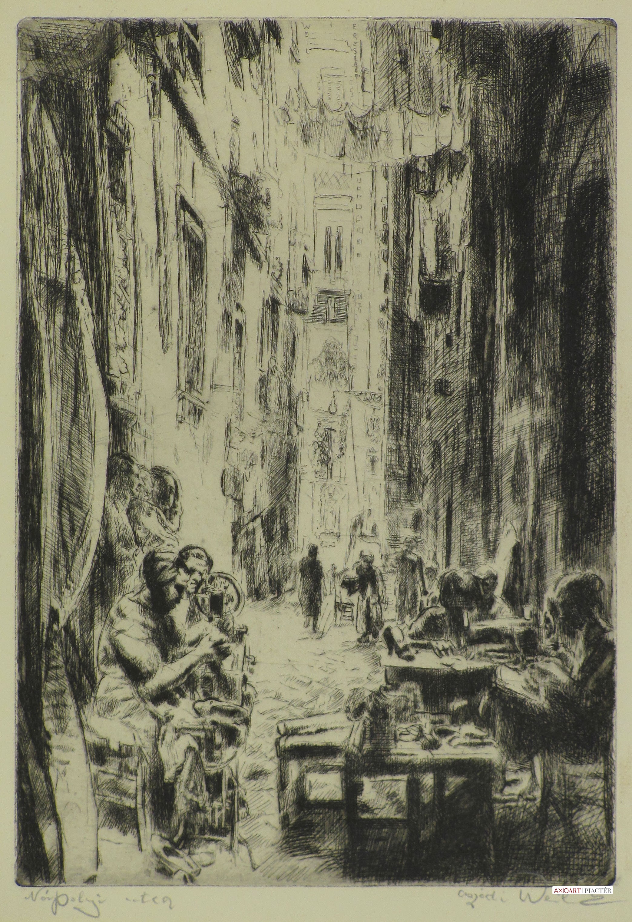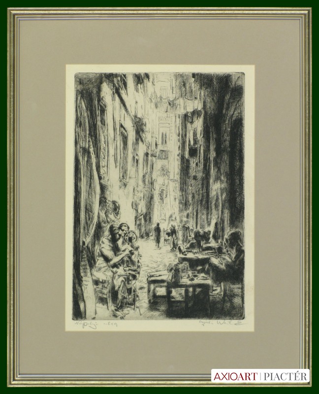 [FK2427/Bp205/9] A kép mérete: 31 x 21,5 cm keret nélkül. Készült: Rézkarc, Papír A kép Aszódi Weil Erzsébet (Budapest, 1901, Budapest, 1976) alkotása. Jelezve Lent "Nápolyi utca, Aszódi Weil E (ceruzával)" A festmény jó állapotban van. Keret: Új Magyar festők és grafikusok életrajzi lexikona I-II. Grafikus és festő. A budapesti Képzőművészeti Főiskolán Deák-Ébner Lajos és Olgyai Viktor tanítványa volt, majd Fényes Adolf mellett képezte magát. 1922-25 között a Szinyei Társaságtól ösztöndíjakat és kitüntető elismeréseket kapott. 1927-ben Párizsban folytatott stúdiumokat. Tanulmányúton járt Olaszországban, majd Balcsikban dolgozott. 1926-ban, 1930-ban és 1933-ban gyűjteményes kiállítása volt az Ernst Múzeumban, 1960-ban a Derkovits Teremben. Témáit főként a falu sugallta: az élet apró jelenetei, a munka, de elsősorban a táj. Kiállításokon többnyire realista szemléletű alakos rézkarcokkal, valamint tájképekkel szerepelt (Csábítás, Krisztus és a házasságtörő nő, Vihar előtt, stb.). 1929-ben Zichy-díjjal jutalmazták. 1953-ban, 1961-ben Munkácsy-díjban, 1975-ben Érdemes Művész kitüntető elismerésben részesült. Több rézkarca a Magyar Nemzeti Galéria tulajdona. (Éber, ML, MÉ,F.J.: Műv. 1971/8) Magyar festők és grafikusok életrajzi lexikona I-II. Műgyűjtők és kereskedők kézikönyve Grafikus és festő. A budapesti Képzőművészeti Főiskolán Deák-Ébner Lajos és Olgyai Viktor tanítványa volt, majd Fényes Adolf mellett képezte magát. 1922-25 között a Szinyei Társaságtól ösztöndíjakat és kitüntető elismeréseket kapott. 1927-ben Párizsban folytatott tanulmányokat. Tanulmányúton járt Itáliában. Balcsikban is dolgozott. 1926-ban, 1930-ban és 1933-ban gyűjteményes kiállítása volt az Ernst Múzeumban, 1960-ban a Derkovits Teremben. Témáit főként a falu sugallja: az élet apró jelenetei, a munka, de elsősorban a táj. Kiállításokon többnyire realista szemléletű figurális rézkarcokkal, valamint tájképekkel szerepelt (Csábítás, Krisztus és a házasságtörő nő, Vihar előtt, stb.). 1929-ben Zichy-díjjat kapott. 1953-ban és 1961-ben Munkácsy-díjban, 1975-ben Érdemes Művész kitüntető elismerésben részesült. Több rézkarca a MNG tulajdona. (Éber, ML, MÉ,F.J.: Műv. 1971/8) Magyar festők és grafikusok adattára Munkácsy-díjas festő. A Képzőművészeti Főiskolán Olgyai Viktor tanítványa volt, majd Fényes Adolfnál tanult. 1922-1925-ben a Szinyei Társaságtól ösztöndíjakat és kitüntető elismeréseket kapott. 1927-ben Párizsban folytatott tanulmányokat. 1926-ban, 1930-ban és 1933-ban gyűjteményes kiállítása nyílt az Ernst Múzeumban. 1960-ban a Derkovits Teremben, 1971-ben a Dürer Teremben volt kiállítása. Több rézkarca a Magyar Nemzeti Galéria tulajdona. 1975-ben érdemes művész kitüntető elismerésben részesült. - ML. Művészeti lexikon I-IV. Festő, grafikus, Munkácsy-díjas. A Képzőművészeti Főiskolán Olgyai Viktor tanítványa volt, majd Fényes Adolfnál tanult. 1922-25-ben a Szinyei Társaságtól ösztöndíjakat és kitüntető elismeréseket kapott. 1927-ben Párizsban folytatott tanulmányokat. 1926-ban, 1930-ban és 1933-ban gyűjt. kiállítása nyílt az Ernst Múzeumban. A felszabadulás óta főleg üzemek és termelőszövetkezetek életét ábrázolja impresszionisztikus jellegű rézkarcain. Számos kiállításon vett részt. 1960-ban a Derkovits Teremben volt gyűjt. kiállítása. Több rézkarca a Nemz. Gal. tulajdona. Művész életrajzok kortárs magyar képzőművészek A Képzőművészeti Főiskolán Deák-Ébner Lajos és Olgyai Viktor növendékeként tanult. Tanulmányúton Francia- és Olaszországban, Jugoszláviában és Bulgáriában járt. Első önálló kiállítása 1926-ban volt az Ernst Múzeumban; az utóbbi években a Derkovits Teremben (1960) és a Dürer Teremben (1971) mutatta be gyűjteményes anyagát. 1922-ben a Szinyei Társaság festészeti díját, 1929-ben a Zichy grafikai díjat nyerte el; 1953-ban és 1961-ben Munkácsy-díjat, 1975-ben érdemes művészi címet kapott. - Az alakos kompozíciók és a tájkép állt hozzá a legközelebb, mert érzékeny, a hangulatok iránt fogékony művészalkata itt talált leginkább önmagára. Az élet derűs oldalait kereső, realista szemléletű grafikáiban a fény- és árnyékhatások kiváló kiaknázójának bizonyult.