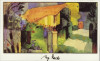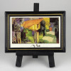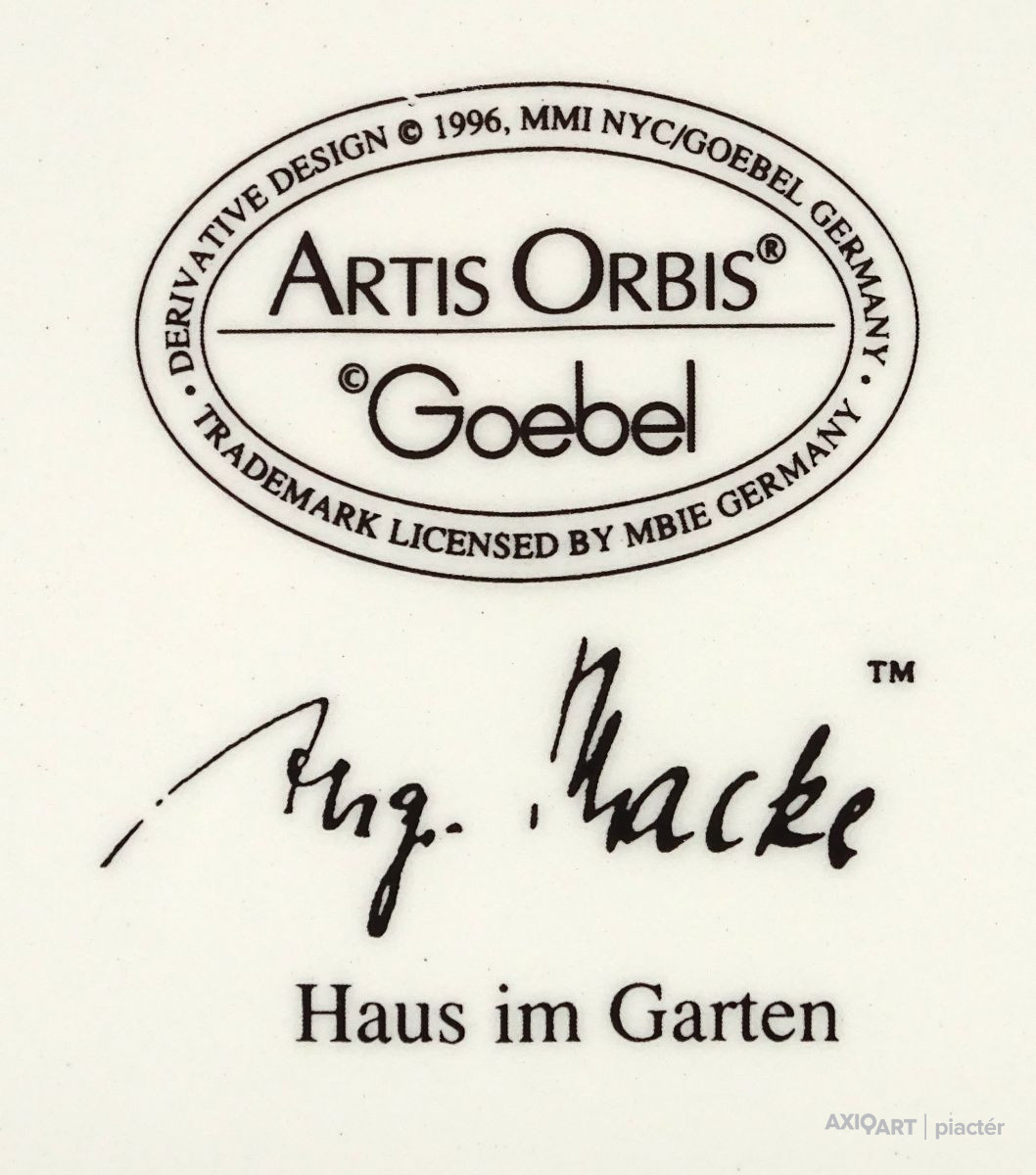 [1M576/X129] Hibátlan állapotú jelzett Goebel porcelán kép, hozzá tartozó fa állványon. Réz színű keretben található jelzett üvegkép. Rajta jelzés: AUG. MACKE Hátoldalán felirat: ARTIS ORBIS GOEBEL TRADEMARK LICENSED BY MBIE GERMANY DERIVATIVE DESIGN 1996 MMI NYC/GOEBEL GERMANY AUG. MACKE HAUS IM GARTEN Magasság: 13 cm Szélesség: 13.5 cm Súly: 0.195 kg