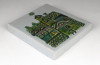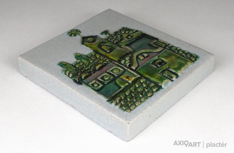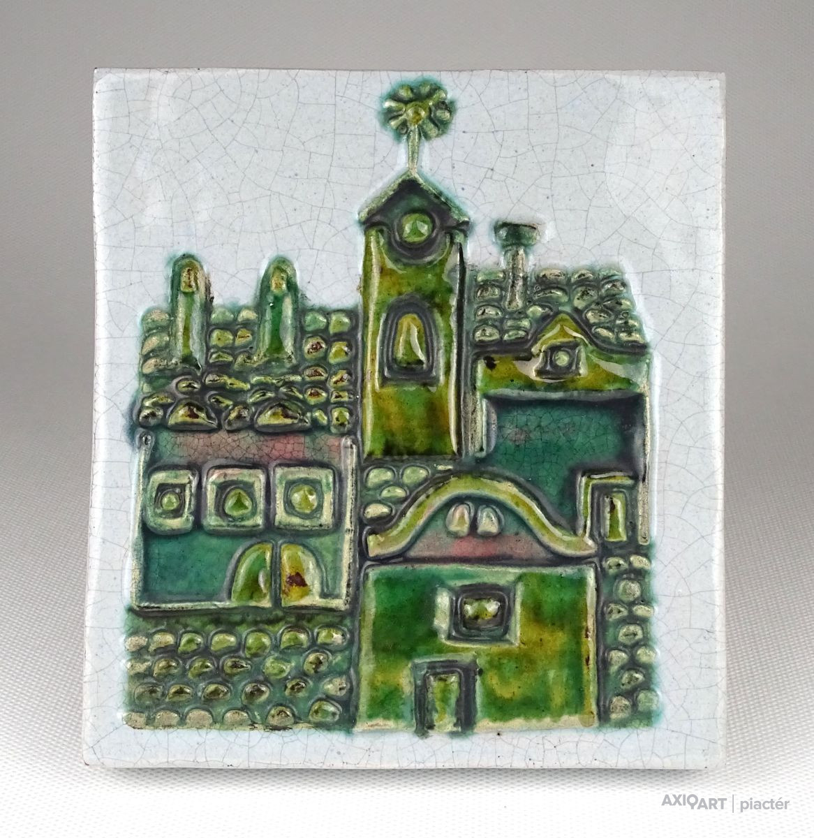 Hibátlan állapotú, falra akasztási lehetőséggel rendelkező fali kerámia. Rajta zöld mázas épület , templom látható.