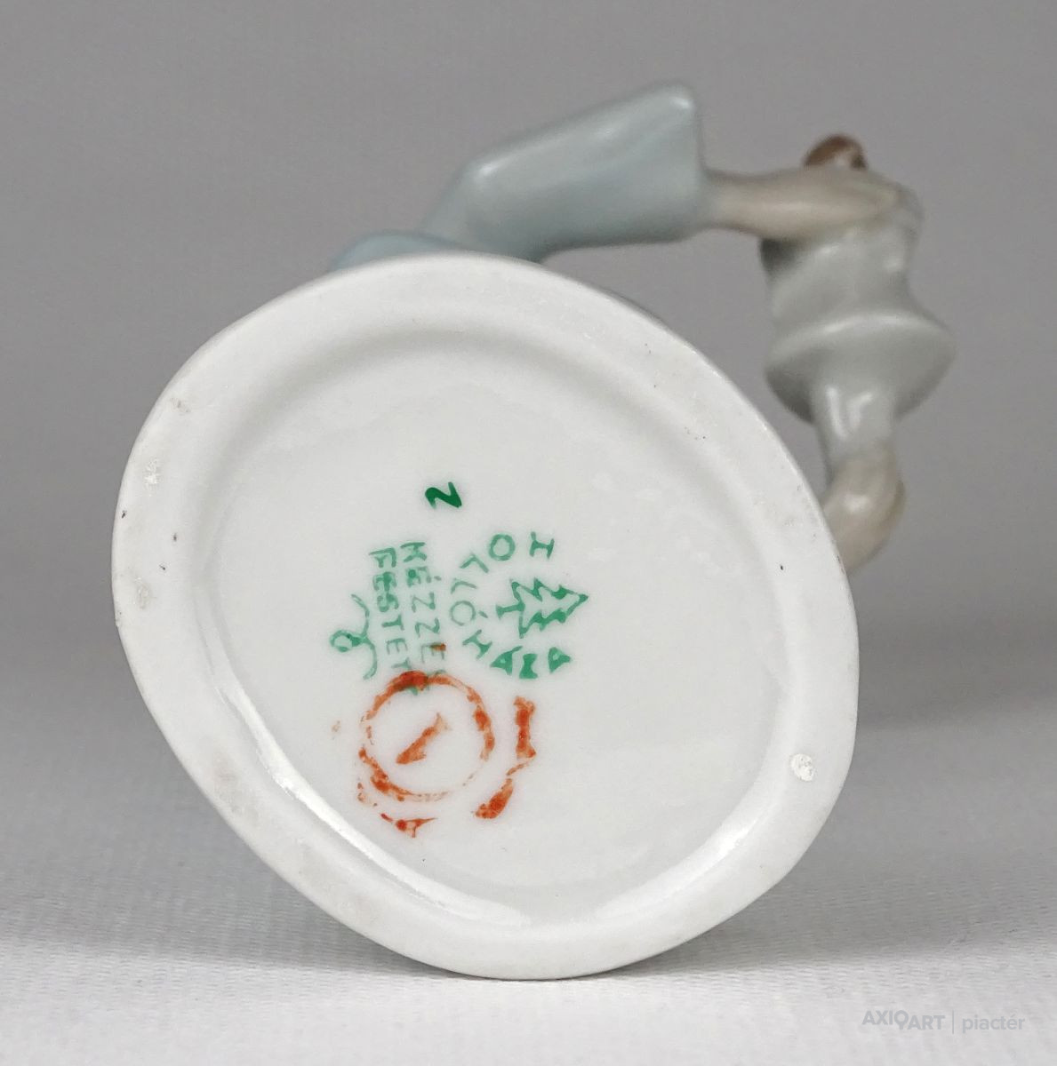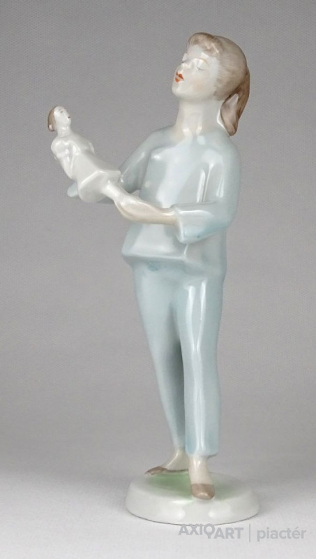[1O620/X075] Hibátlan állapotú, jelzett porcelán figura. Babával játszó kislány porcelán figura. Alján zöld Hollóházi márkajelzés: HOLLÓHÁZA KÉZZEL FESTETT Magasság: 17 cm Szélesség: 5.5 cm Súly: 0.145 kg
