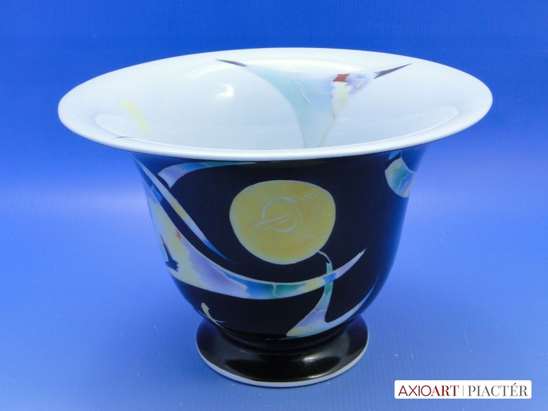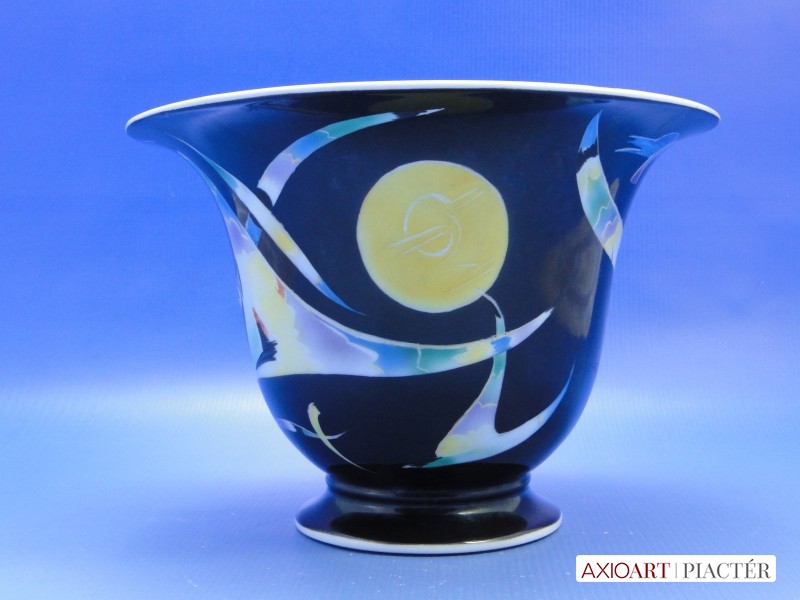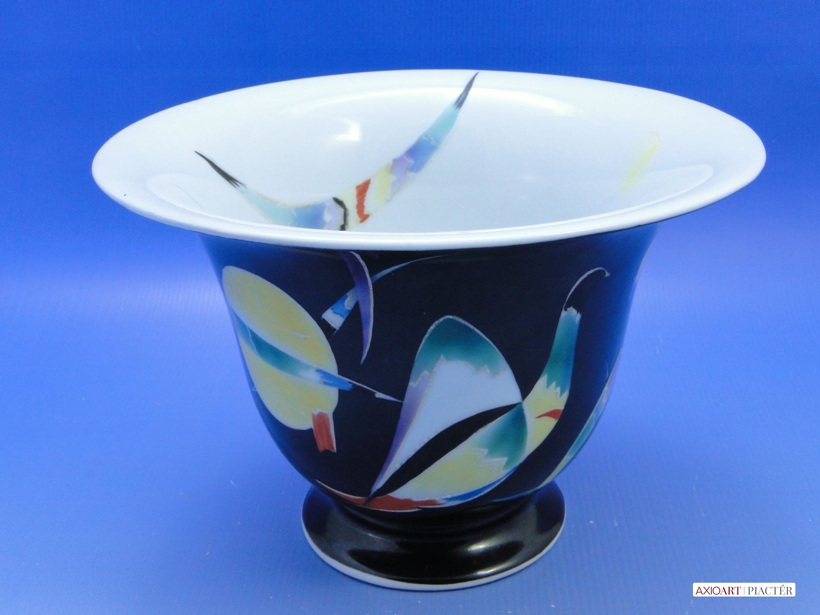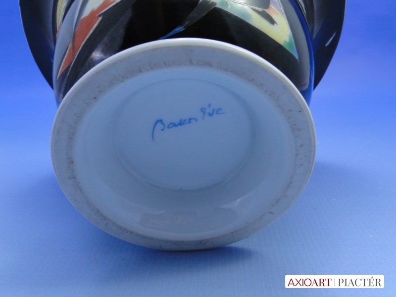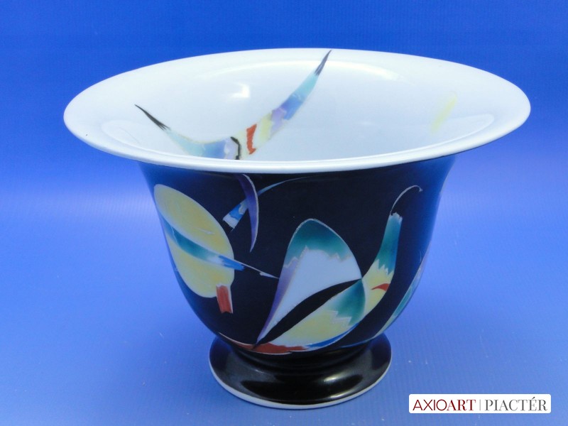 [0B021/BX-8] Jelzett, Bakos Éva szignóval ellátott, rendkívül ritka formájú és dekoru kaspó, váza. Pereménél profi restaurátor által javított. Magasság: 14 cm Szélesség: 20.5 cm Súly: 0.822 kg