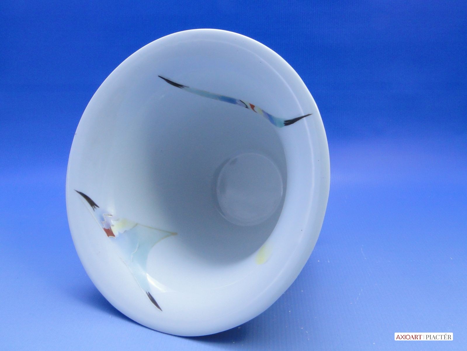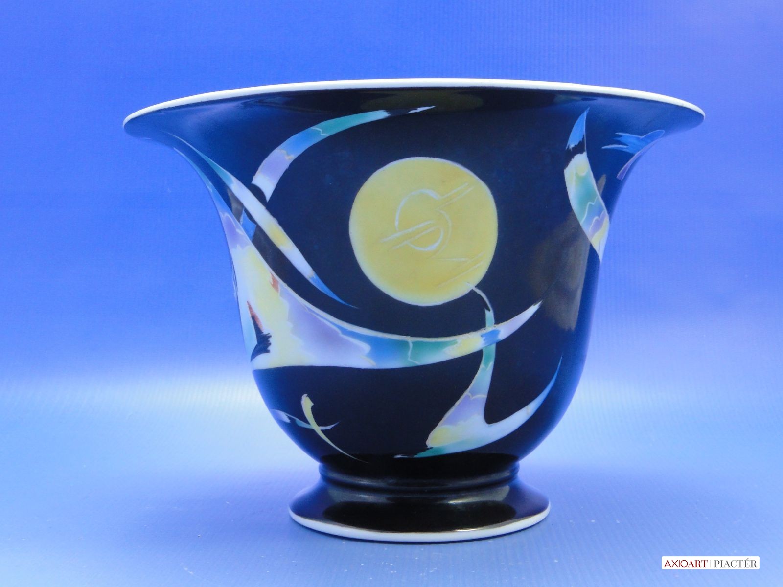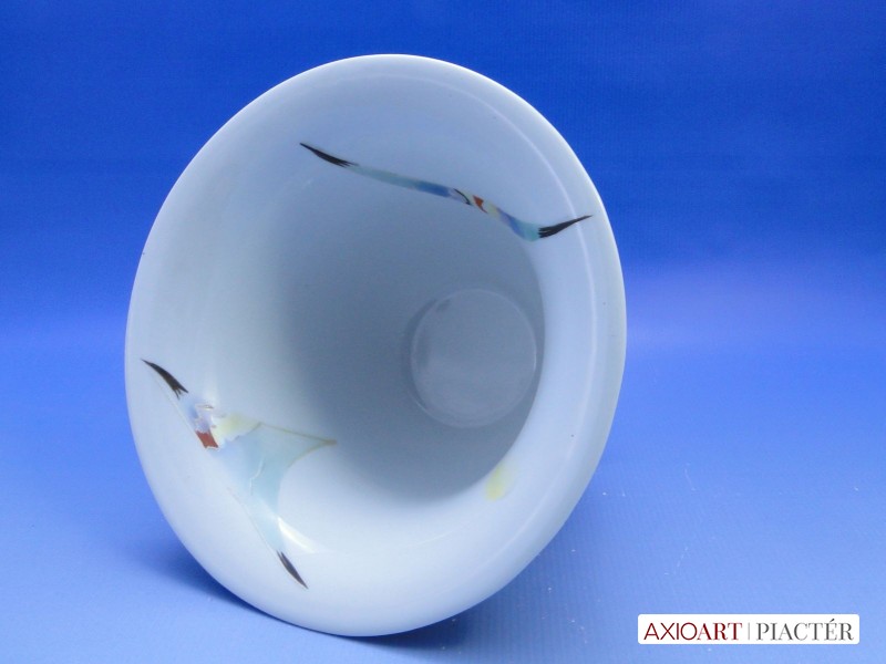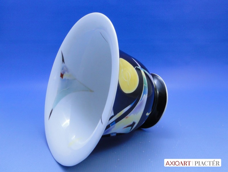 [0B021/BX-8] Jelzett, Bakos Éva szignóval ellátott, rendkívül ritka formájú és dekoru kaspó, váza. Pereménél profi restaurátor által javított. Magasság: 14 cm Szélesség: 20.5 cm Súly: 0.822 kg