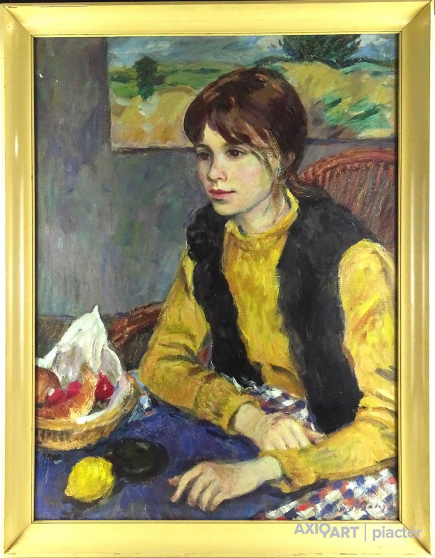[1Y034/Z018] Olaj vászon festmény, üveglap mögött, szép állapotú képcsarnokos keretben. Akasztási lehetőséggel rendelkezik. Jelezve jobbra lent: BAKY Hátoldalán a kereten Képcsarnok Vállalat címke töredék látható, rajta felirat: A művészeti alkotás címe: LEÁNY Magasság: 86 cm Szélesség: 66 cm Súly: 5.37 kg Baky Győző Budapest, 1902 - 1972, Budapest Festő. Édesapja, Baky Albert is festő volt. 1920-ban Párizsban tanult a La Grand Chaumiere-ben, megfordult Degas műtermében is. 1934-től Tuniszban dolgozott, csak 1942-ben jött haza. Posztimpresszionista műveket, sivatagi tájakat és csendéleteket festett, rézkarcokat is készített. Több kiállításon vett részt külföldön (Lengyelország, Németország, Egyesült Államok) és itthon is, 1949-ben gyűjteményes tárlata volt. Forrás: kieselbach.hu