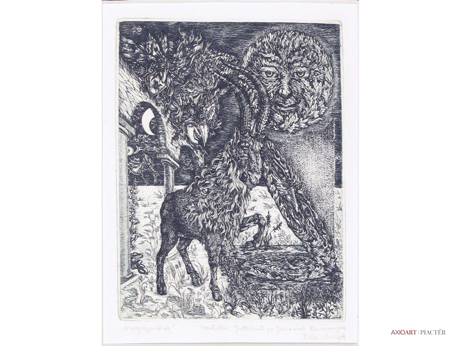 [FKA158/Bp72/428] A kép mérete: 15,5 x 12 cm keret nélkül. Készült: Rézkarc, Papír A kép Balla Margit (Budapest, 1947) alkotása. Jelezve lent "Napéjegyenlőség Balla Margit (ceruzával)" A festmény jó állapotban van. Keret: Paszpartúban Magyar festők és grafikusok életrajzi lexikona I-II. Grafikus és festő. A budapesti Iparművészeti Főiskola nyomdászati szakán diplomázott. Ösztöndíjasként 1982-ben a worpswedei művésztelepen, 1984-ben a római Magyar Akadémián dolgozott. A kezdetekben főleg reklámgrafikával foglalkozott. Bár illusztrátorként megmaradt alkalmazott grafikusnak, fokozatosan áttért az autonóm alkotásra, és jelenleg főként a festészetre koncentrál. A rézkarc is kedvenc műfajai közé tartozik. Könyveket illusztrál, színházi jelmezeket és díszleteket tervez, talált tárgyakból kisplasztikákat készít. Eklektika, romantika, szimbolizmus - a valóság egységének az elvesztése, valamint a valóság elemeinek irracionális egységgé történő átrendezése jellemzi az egykor alkalmazott grafikusként indult képzőművészt. Számos itthoni és külhoni tárlaton szerepelt (Budapest, Kecskemét, Köln, Düsseldorf, Koppenhága, Hamburg, Svédország, Bécs, Helsinki, München, Firenze, stb.). Díjak: a Tihanyi Kisgrafikai Biennále díja (1979), Stúdió-díj, Pécs (1980). 1980-ban "Az év legszebb plakátja" című kiállításon fődíjat nyert. (A.J.: Műv. 1989/3, MÉ, L.J.: ÉS 1994/1) Magyar festők és grafikusok életrajzi lexikona I-II. Műgyűjtők és kereskedők kézikönyve Grafikus, festő. A bp.-i Iparművészeti Főiskola nyomdászati szakán végezte tanulmányait. Kezdetben reklámgrafikával foglalkozott. A rézkarc is kedvelt műfajai közé tartozott. Az utóbbi években inkább a festészetre koncentrál. Stílusát a fantasztikus realizmus jellemzi. Számos hazai és külföldi tárlaton szerepelt (Kecskemét, Budapest, Köln, Hamburg, Düsseldorf, Koppenhága és Svédország). 1980-ban "Az év legszebb plakátjai'" című kiállításon fődíjat nyert. (MÉ) Magyar festők és grafikusok adattára A Magyar Iparművészeti Főiskola tipografikai osztályán szerzett oklevelet 1947-ben. Kezdetben reklámgrafikával foglalkozott, később moziplakátokat készített, könyvborítókat és illusztrációkat tervezett. Kedvelte a rézkarcot. "Az év legszebb plakátjai" kiállításon, 1980-ban fődíjat nyert. 1977-ben Kölnben, 1978-ban Münchenben és Kecskeméten, 1981-ben a bp.-i Dorottya utcai teremben nyílt önálló kiállítása, ugyanezen évben Kölnben, Hamburgban, Düsseldorfban, Koppenhágában, 1983-ban pedig Svédországban. Stílusát "fantasztikus realizmus" jellemzi. - Irod.: P. Sz. T. Művész életrajzok. Bp. 1985. Művész életrajzok kortárs magyar képzőművészek A Magyar Iparművészeti Főiskola tipografikai osztályán szerzett oklevelet 1974-ben. Kezdetben reklámgrafikával foglalkozott, később moziplakátokat készített, könyvborítókat és illusztrációkat tervezett. Kedvelte a rézkarcot, az utóbbi években azonban többet fest és rajzol, a sokszorosító grafika háttérbe szorult. "Az év legszebb plakátjai" kiállításon 1980-ban fődíjat nyert. 1977-ben Kölnben, 1978-ben Hamburgban, 1979-ben Szegeden, 1980-ban Bécsben, Münchenben és Kecskeméten, 1981-ben a budapesti Dorottya utcai teremben nyílt önálló kiállítása, ugyanezen évben Kölnben, Hamburgban, Düsseldorfban, Koppenhágában, 1983-ban pedig Svédországban. Stílusát "fantasztikus realizmus" jellemzi.