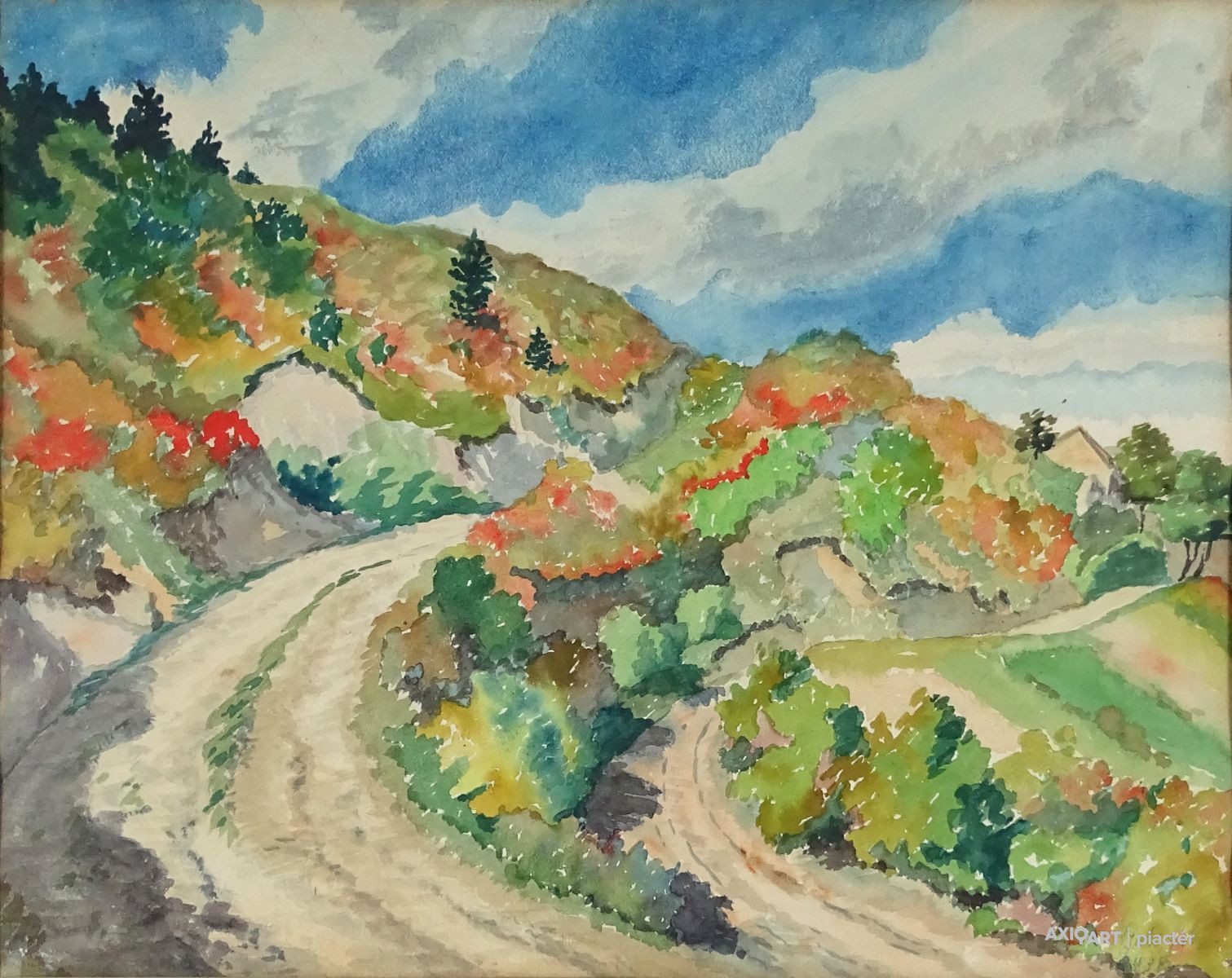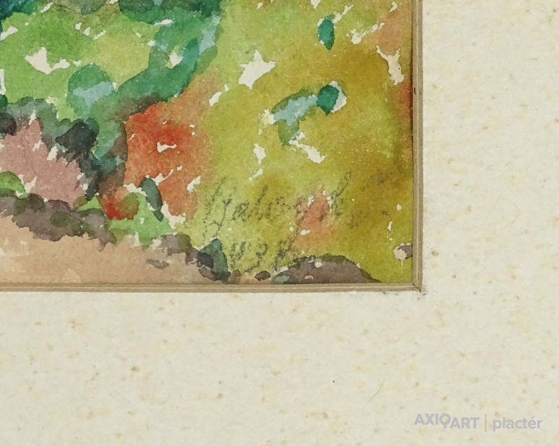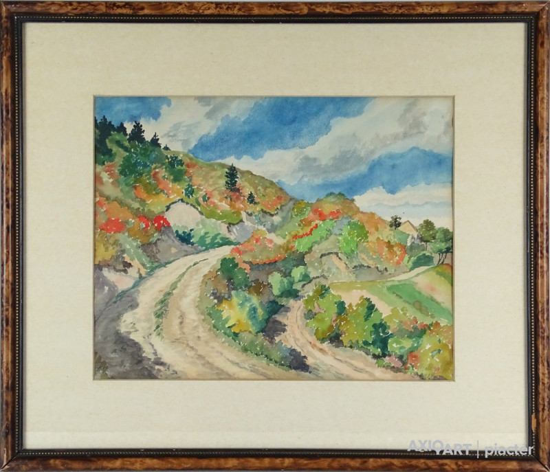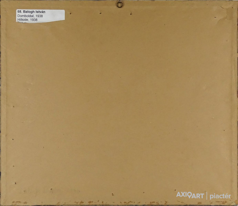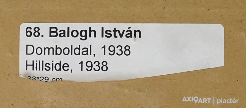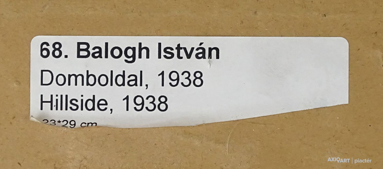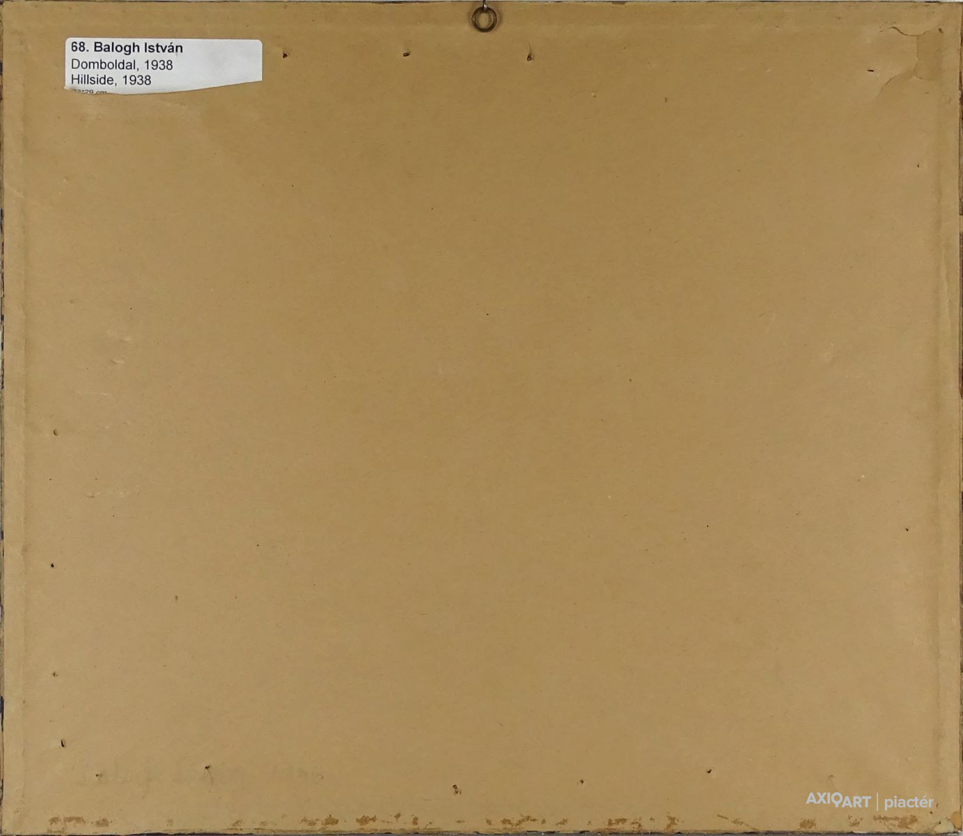 [1A759/W048] Papír akvarell, üveglap mögött, régi keretben. Jelzés jobbra lent: BALOGH I. 938 Hátoldalán címke, rajta felirat: BALOGH ISTVÁN DOMBOLDAL 1938 Magasság: 38.5 cm Szélesség: 44.5 cm Súly: 1.11 kg