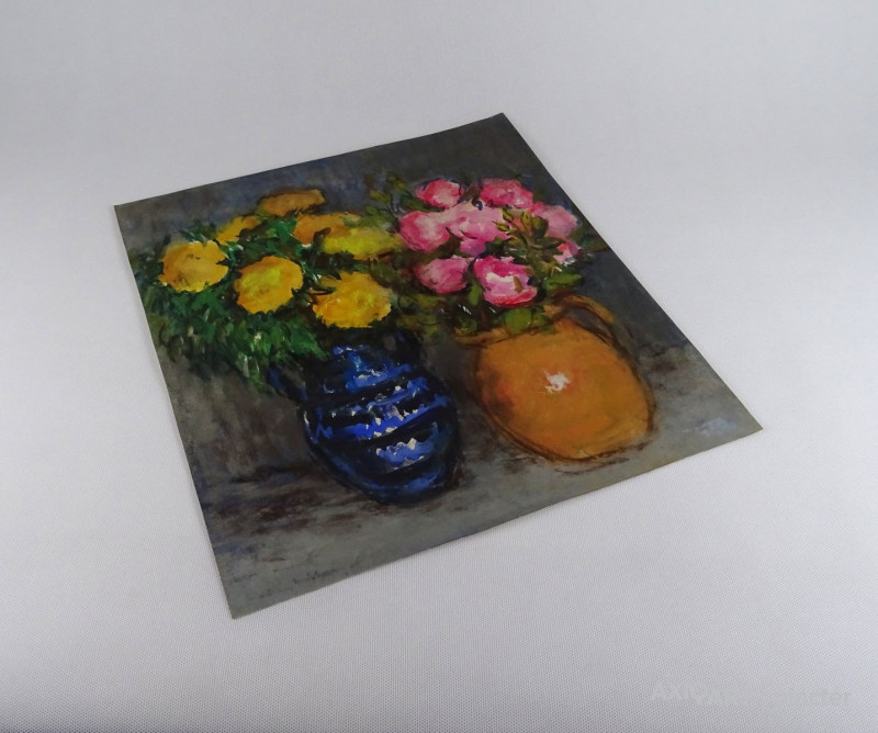 [1T077/143] Papír akvarell keret nélkül. Balra lent kopottas jelzés: BALOGH MARGIT Magasság: 39.2 cm Szélesség: 37.2 cm Súly: 0.035 kg Balogh Margit festő Mohács, 1898-04-7 Elhalálozott: Budapest, 1965.február 18. A fiatal festőnő 1918-tól Budán, Deák-Ébner Lajos műtermében tanult, majd Münchenbe ment, ahol Hugo von Habermanntól tanult portréfestészetet. Párizsban arcképfestésből élt, majd Szegedre visszatérve Nyilasy Sándor irányítása mellett folytatott festészeti tanulmányokat. Kiemelkedő rajzkészsége révén elsősorban portréfestőként ismert. Az emberábrázoláson kívül a tájfestés, a városrészletek megörökítése érdekelte. Első tárlatát 1926-ban rendezte Szegeden, a harmincas évek derekáig gyakori szereplője volt a szegedi kiállításoknak. A húszas évek közepétől a Műcsarnokban is szerepelt. Sokfelé járt külföldön, a nyugat-európai országokon, Kanadán kívül Kínába is eljutott. 1935-től Budapesten telepedett le, itt a háború végéig számos portrét készített a tudományos, az egyházi élet és a politika ismert személyiségeiről. Hátrahagyott alkotásait a szegedi Móra Ferenc Múzeumnak adományozta, amelyből 1965 tavaszán kiállítást rendeztek.  Irodalom Balogh Margit képkiállítása. Délmagyarország, 1926. febr. 28. Nyilasy Sándor és Balogh Margit képkiállítása. Délmagyarország, 1927. okt. 23. SZELESI Z.: Balogh Margit emlékezete. Délmagyarország, 1965. márc. 16. SZELESI Z.: Szeged képzőművészete. Szeged, 1975 SEREGÉLYI Gy.: Magyar festők és grafikusok adattára, Szeged, 1988 SZABÓ T.:Szeged elfeledett portréfestője - Balogh Margit. Szeged, 2010. jan. Egyéni kiállítások Egyéni kiállítások 1926 • Kultúrpalota (Nyilasy Sándorral), Szeged 1965 • Móra Ferenc Múzeum, Szeged- emlékkiállítása.   Válogatott csoportos kiállítások Válogatott csoportos kiállítások 1924-től • Műcsarnok kiállításai, Budapest 1930–1935 • Szegedi Képzőművészeti Egyesület kiállításai, Szeged. Művek közgyűjteményekben Művek közgyűjteményekben • Móra Ferenc Múzeum, Szeged.   Forrás: artportal.hu