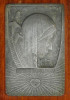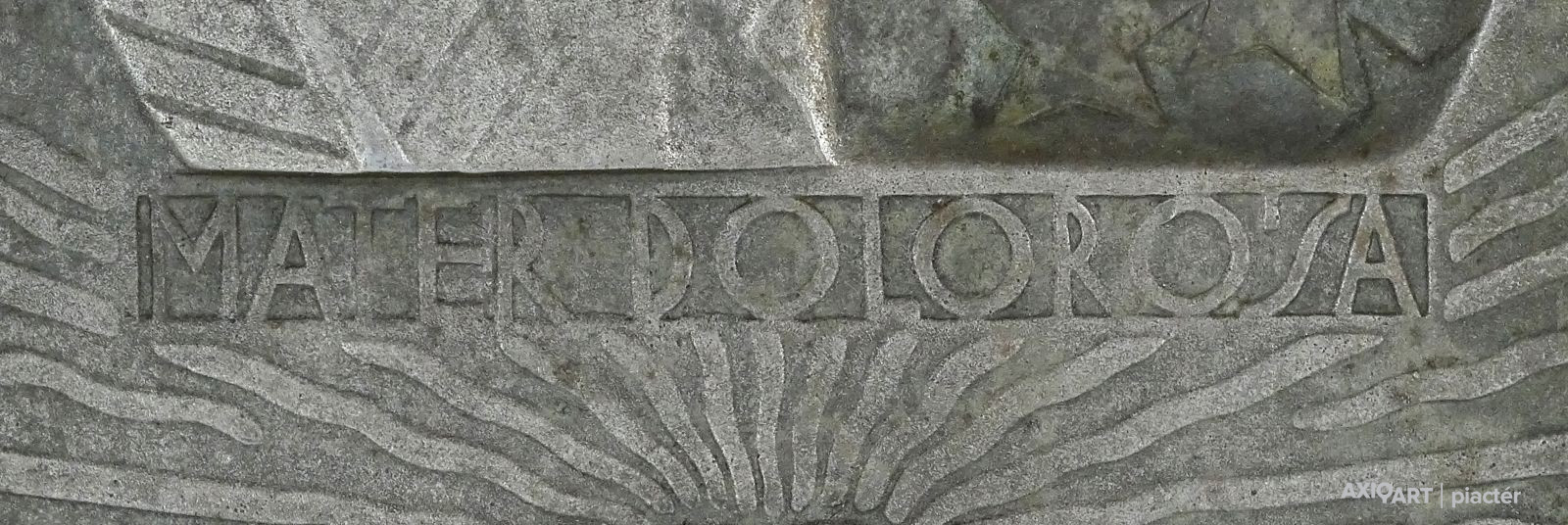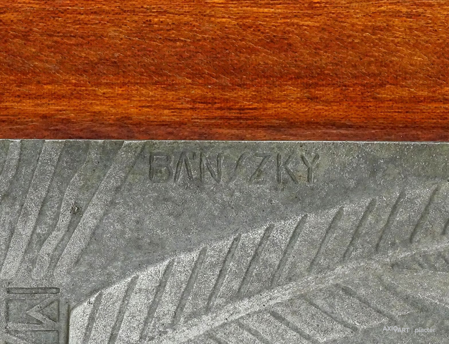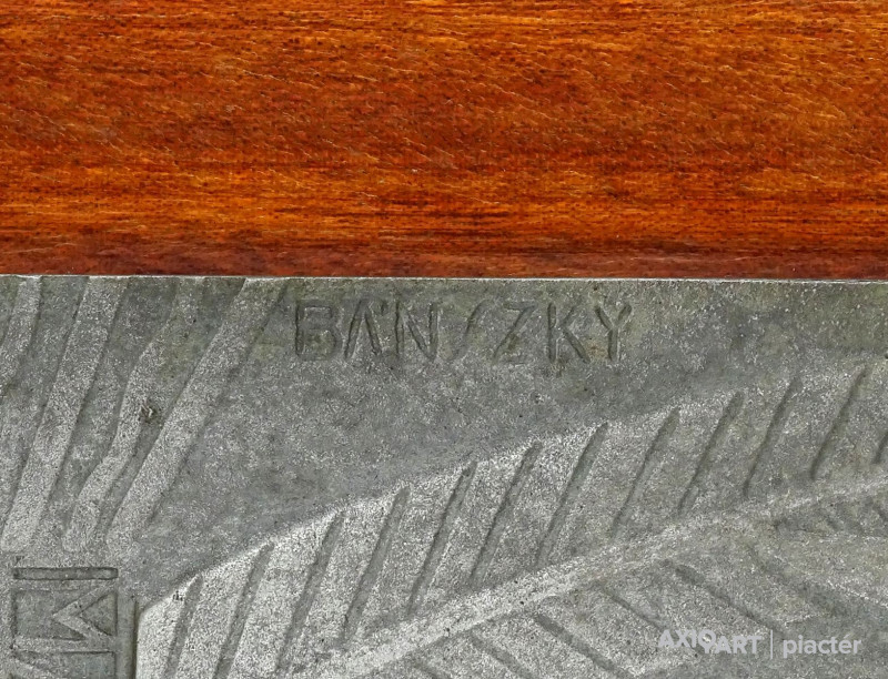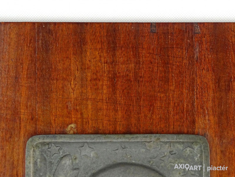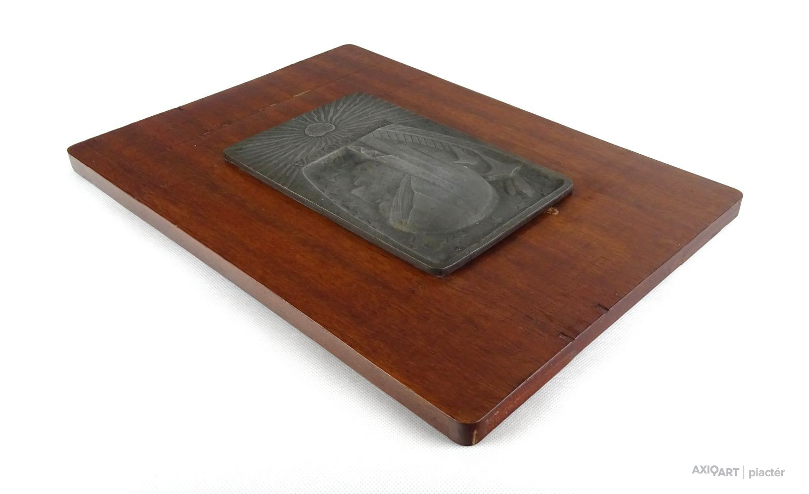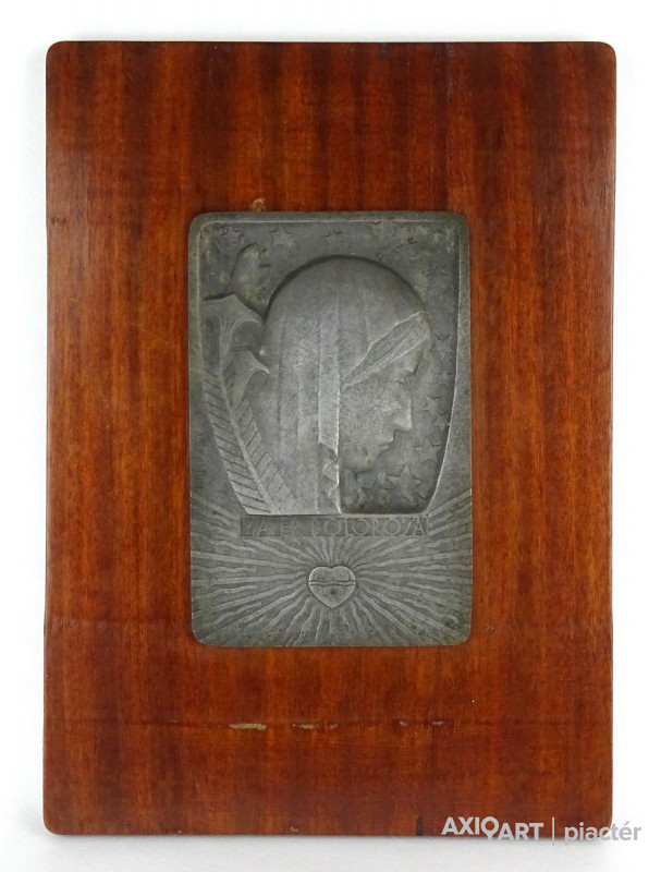 [1D348/081] Fa táblára rögzített jelzett szecessziós ón plakett, Mária portré. Rajta felirat: MARIA DOLORÓSA Jelzés: BÁNSZKY Magasság: 39.5 cm Szélesség: 28.5 cm Súly: 1.505 kg Bánszky Sándor    Ugrás a navigációhozUgrás a kereséshez Bánszky Sándor Bánszky Sándor: Madár Született 1888. február 11.[1] Szeged Elhunyt 1918 (29-30 évesen) Állampolgársága magyar Foglalkozása szobrász A Wikimédia Commons tartalmaz Bánszky Sándor témájú médiaállományokat. Bánszky Sándor (Szeged, 1888. február 11. – Villefranche, 1918) magyar szobrász, éremművész.  Élete és munkássága Teljesen árva volt, tanulmányainak költségeit a szegedi árvaszék fedezte. A középiskolát Szegeden végezte, majd 1906-ban a székelyudvarhelyi agyagipari szakiskolában tanult. Első külföldi útja Münchenbe vezetett, utána egy ideig Csáky Józseffel, fiatal szegedi művésztársával együtt a pécsi Zsolnay gyárban dolgozott. Ezután elvégezte a budapesti iparművészeti iskolát, ahol Maróti Géza és Mátrai Lajos tanítványa volt. Munkáiért többször kitüntetést kapott, szorgalma révén állami segélyben részesült. Ennek köszönhetően járt Bécsben és tett 1909-ben tanulmányutat Olaszországban. 1910-ben szerezte meg oklevelét, és az iparművészeti iskola szobrászati tanszékének tanársegédje lett. Műveivel szerepelt a Képzőművészeti Társulat kiállításain. 1913 tavaszán Csáky után Párizsba utazott, hogy a század első évtizedében itt megindult modern művészeti áramlatokba bekapcsolódhasson. 1914 elején Párizsban csatlakozott hozzájuk Szolcsányi Gyula, aki később Szegeden síremlékszobrászként dolgozott. Bánszkynak szép műterme volt a rue Vaugiardon, ahol az ismerősök és szakmabeliek mint Szobotka Imre és Bossányi Ernő festőművészek, gyakran találkoztak. A nyelvész Eckhardt Sándor is járt itt, róla Bánszky egy portrét mintázott. 1914 tavaszán Bánszky és Csáky is sikerrel szerepeltek a független művészek kiállításán. Az első világháború azonban megtörte pályájukat, a magyar állampolgárokat ekkor internálótáborba vitték. Csáky ekkor már francia állampolgár volt. A Villefranche-i gyűjtőtáborban Bánszky és Szolcsányi egészen a háború végéig együtt voltak. Itt is dolgoztak, rajzokat, plaketteket és szoborvázlatokat, terveket készítettek. Bánszky kevés megmaradt művén a konstruktív, geometrikus mintázásra való törekvést látható. 1918 őszén a spanyolnátha járvány áldozata lett.  Forrás: wikipédia